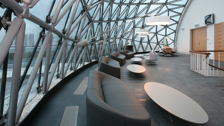 Malzeme seçimlerinden aydınlatma elemanlarına ve mobilyalara kadar eğrisel formların kullanıldığı projede yeşille bütünleşen şeffaf toplantı salonları, bir bahçeye serpiştirilmiş hissini veren ahşap çalışma üniteleri göze çarpar. Tüm yapıya görsel olarak estetik değer katan ve kullanıcıları için nefes alma alanları sağlayan iç bahçeler, ofis programının teknolojik ve mekansal olarak günümüz değişen ihtiyaçlarına yanıt verebilen, bildik kütlesel iç mekan çözümlerinden farklı olanaklara sahip bir yorum.”