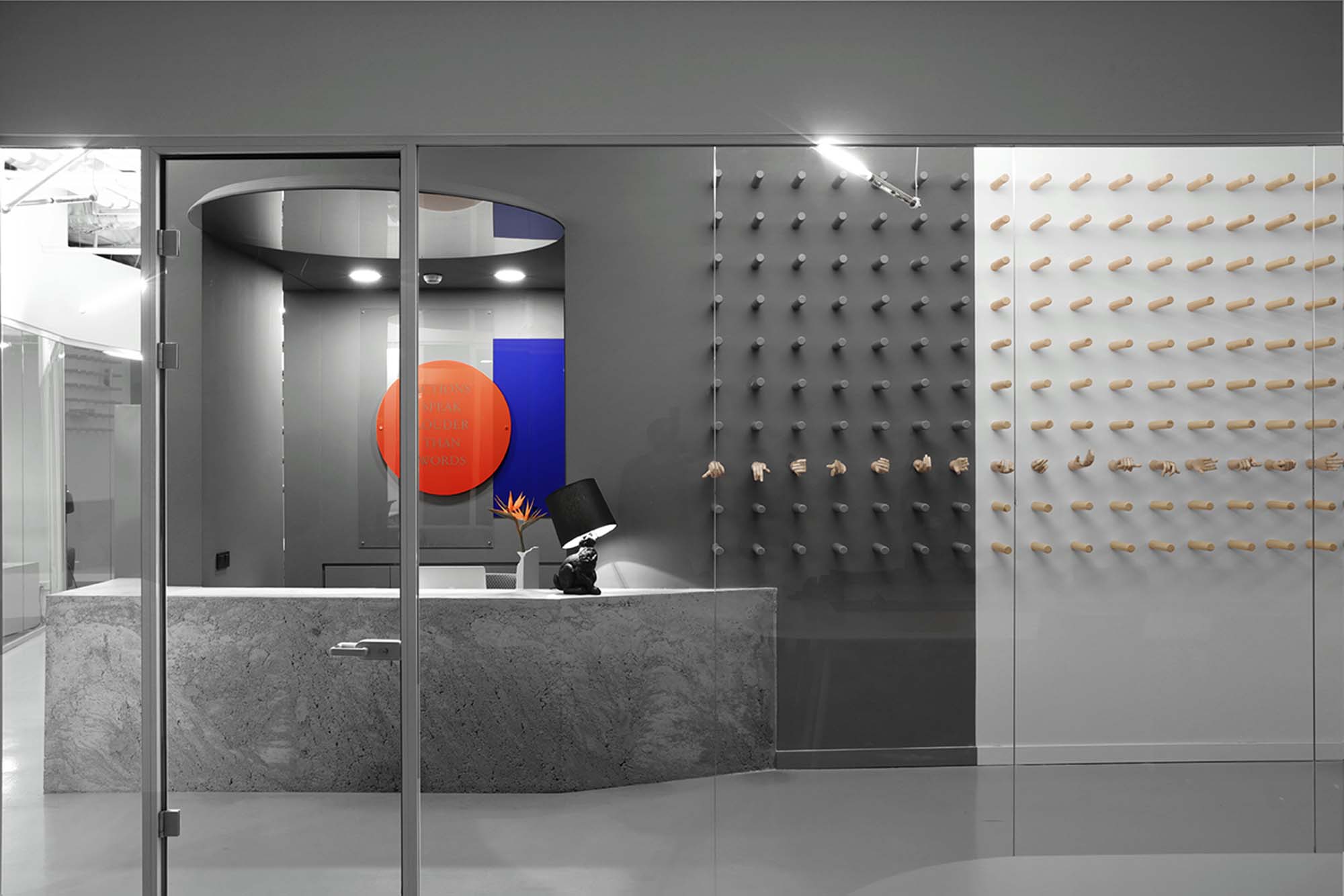 Enstalasyon: Grid sistemine oturtulan masif silindir tekrarlarıyla, büyük ölçekli kitaplık olarak da kullanılabilen yüzeyler yaratıldı. Yerleşimdeki renk atlamaları ile enstalasyon iç mimarinin bir parçası gibi görünürken, silindirlerin ritmini bozan ahşap hareketli eller ile ajansın, dinamik ve eğlenceli kimliğine gönderme yapılmakta.