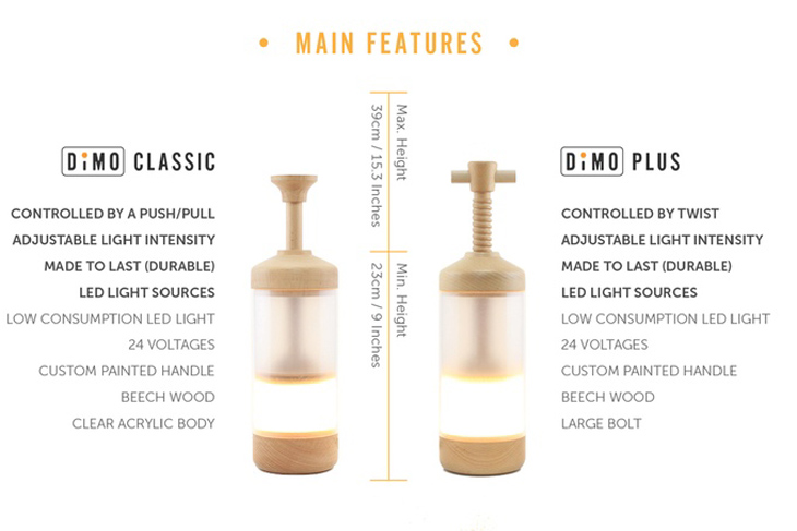 Omer ve Ortal Menashri’nin Londra merkezli tasarım stüdyosu DiMO, faklı bir aydınlatma ürünü geliştirdi. DiMO Classic ve DiMO Plus isimli iki alternatif üreten stüdyo, geliştirdikleri üründe düşük teknolojili yöntemlerle çağdaş tasarımı birleştiriyor. Ürünler kullanıcıya basit bir itme-çekme veya döndürme hareketiyle ışık miktarını değiştirme olanağı veriyor.