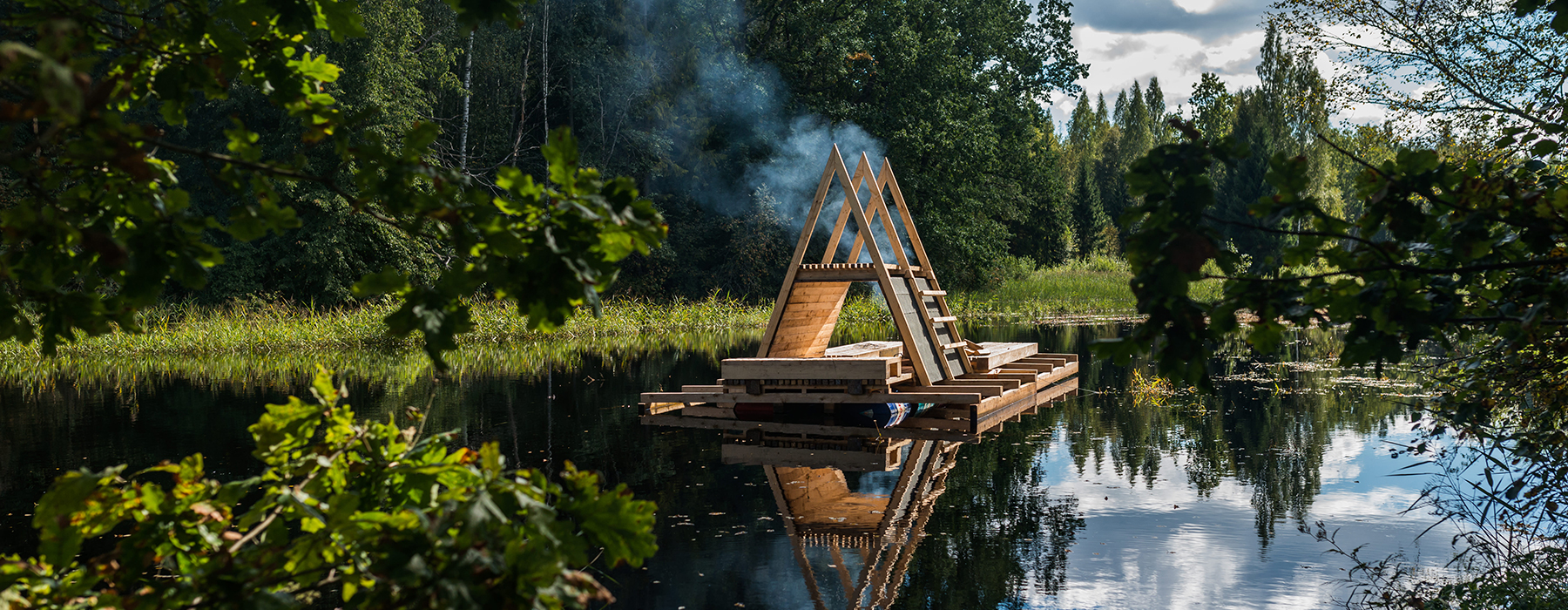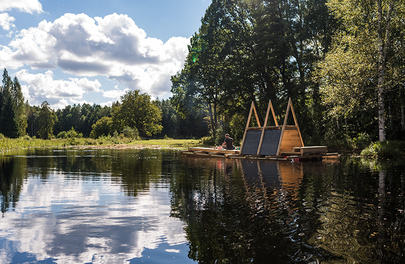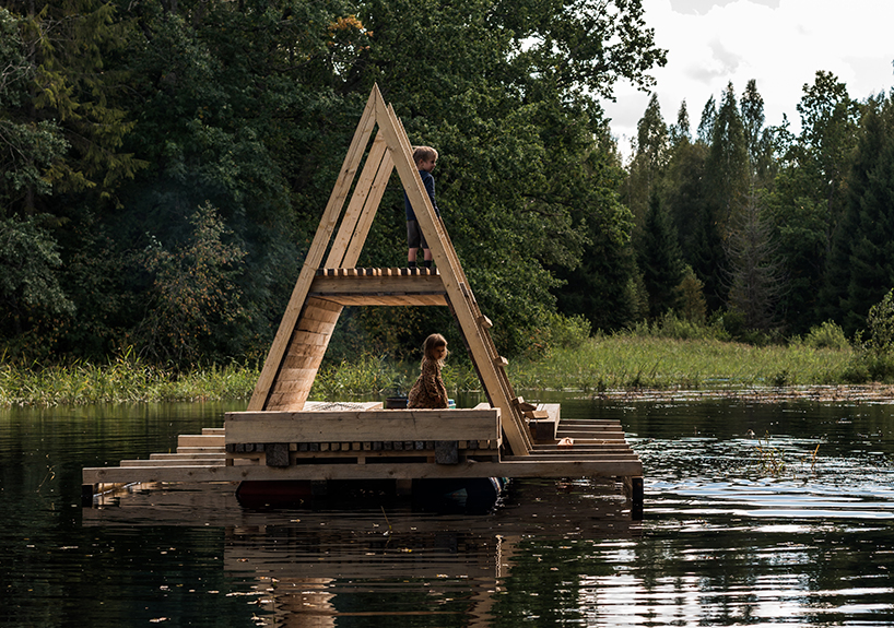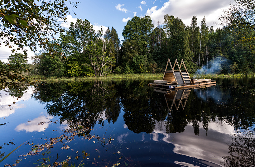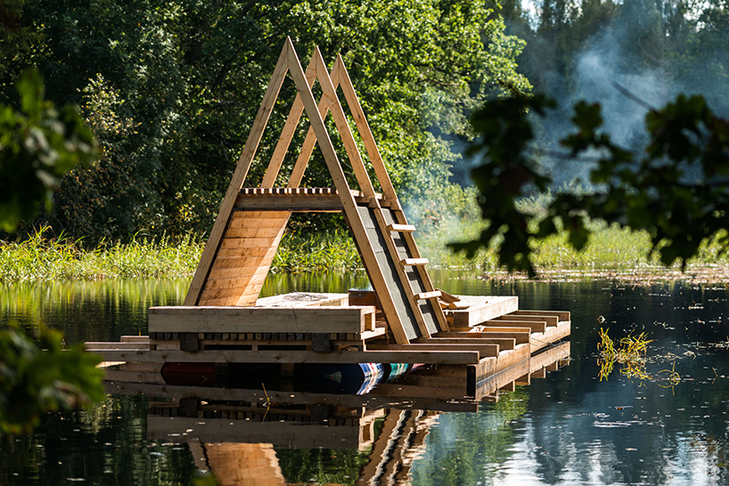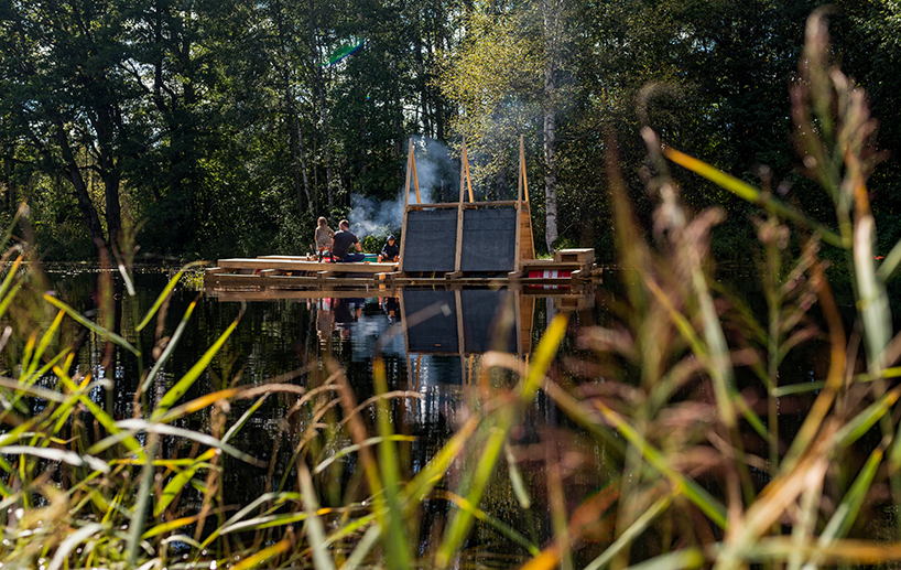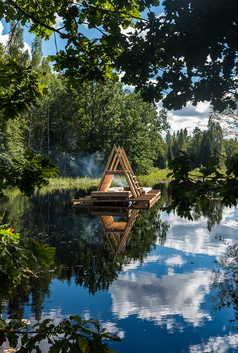 Estonya Sanat Akademisi İç Mimarlık Bölümü öğrencileri tarafından Soomaa ormanlarında düzenlenen yaz atölyesinde, doğanın ihtiyacına hizmet verecek VEETEE adlı yüzer bir yapı inşa etti.icm12