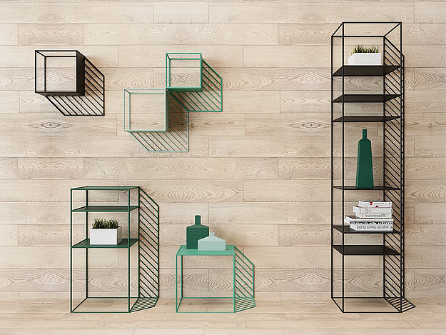 Ürünlerin kendisi ile aynı malzemeden oluşan gölgeleri bulunuyor. Raflar ve masalardan oluşan çeşitli renklerdeki koleksiyon farklı şekillerde düzenlenebilir ve sonsuz kompozisyonlar oluşturulabilir nitelikte.
