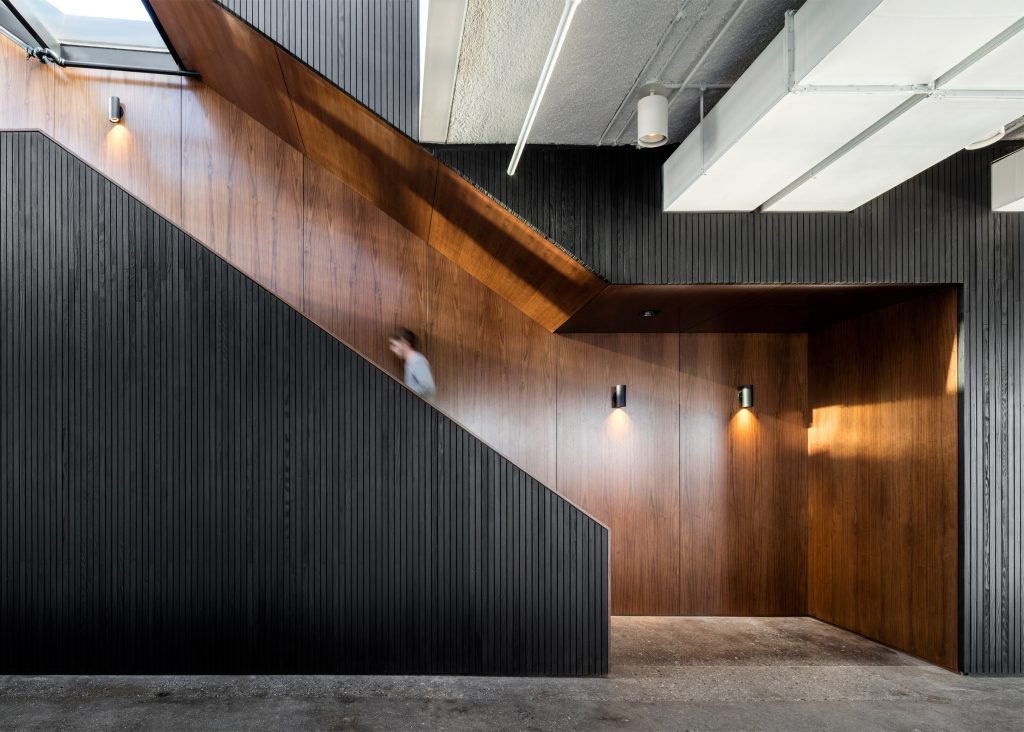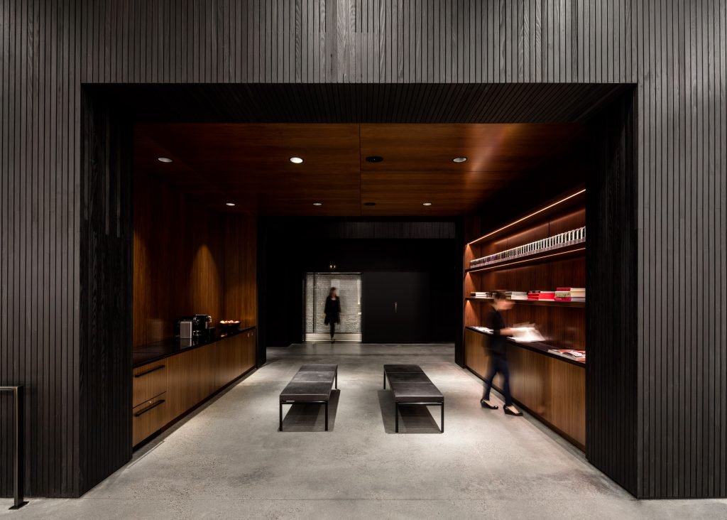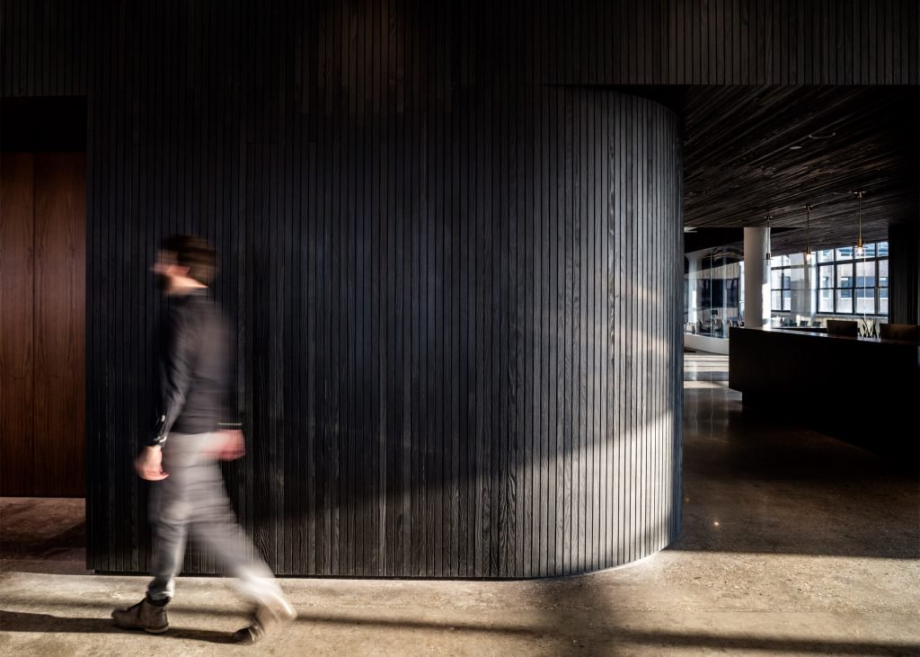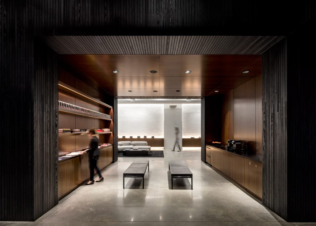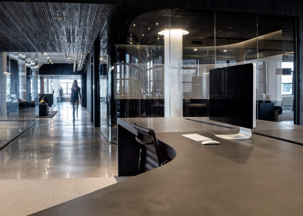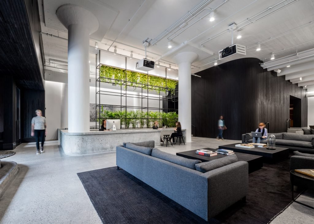 lSquarespace ofisinde beton formlar, ahşap ince şeritler, duvarların ve tavanın büyük bölümünü kapsayan bir ölçüdedir ve kalan kısımlar beyazdır. Siyah-beyaz renk kontrastı ofisin hemen hemen her alanına hakim. Koyu renkli ahşabın kullanılmasının amacı ortama sıcaklık katması. Toplantı odalar cam bölmelerle ayrılırken ofis, açık plan olarak tasarlandı.yİşbirliğinin ve sosyalleşmenin iş akışı için çok etkili bir yöntem olduğunu düşünen A + I tasarım ofisi, Squarespace çalışanları için havanın iyi olduğu günlerde açık havada çalışabilecekleri ve sosyalleşebilecekleri bir ortam sağladı.ac