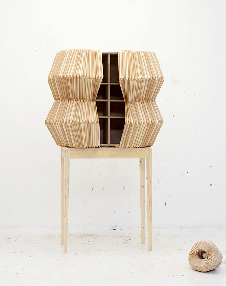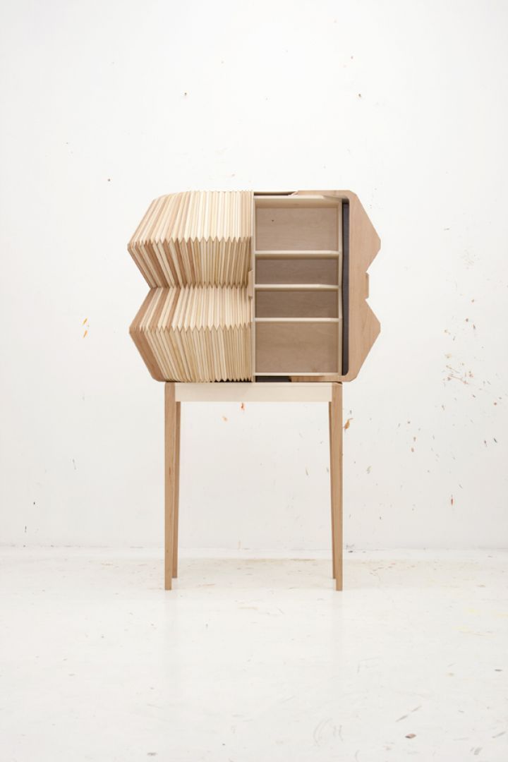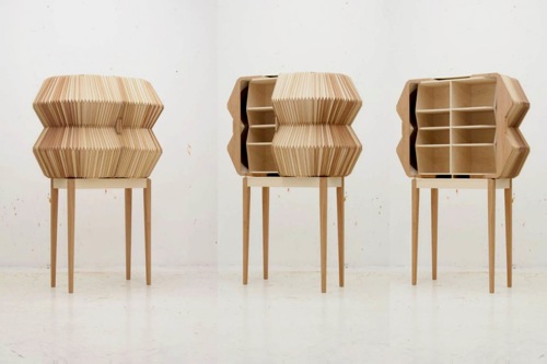Hem sesi hem görüntüsüyle enerji barındıran akordiyon, kumaş tasarımlarıyla bilinen isim Elisa Strozyk’i de fazlasıyla etkilemiş. Tasarımcının, STUDIO BEEN ile ortaya koyduğu çalışmanın sonucu salonlara ve odalara farklı bir hava getiriyor. Kabinin kapağını açınca oluşan raflar, istediğiniz boyutta tekrar yapılabiliyor. Bu müthiş dolap oldukça yaratıcı ve eğlenceli gözüküyor.