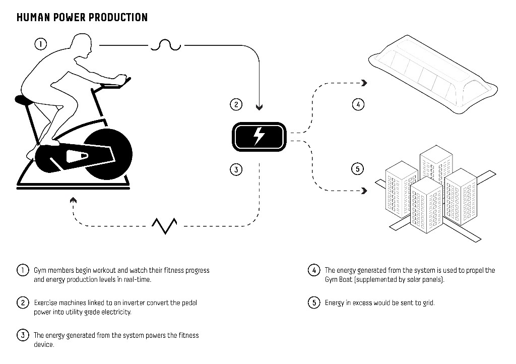 45 kişiyi ağırlayabilen 20 metre uzunluğundaki fitness teknesindeki egzersiz alanı, gelişmiş motosikletlerin ve çapraz eğiticilerin bir kombinasyonu olan Technogym ARTIS makinelerinden birine sahip. Bir kullanıcı pedal çevirmeye veya basmaya başladığında, bir invertör bu hareketi, kullanıcının cihazına güç sağlamak için kullanılan elektrik prizine dönüştürüyor. Egzersiz tarafından üretilen enerji, ayrıca, spor salonu teknesinin elektrikli pervanelerine su yoluyla şehir genelinde taşınmasıyla elektrik ihtiyacının karşılanmasına da faydada bulunuyor. Herhangi bir ilave enerji ihtiyacı gerekirse çatısında bulunan fotovoltaik hücreler olmak üzere yenilenebilir malzemelerle karşılanacak.