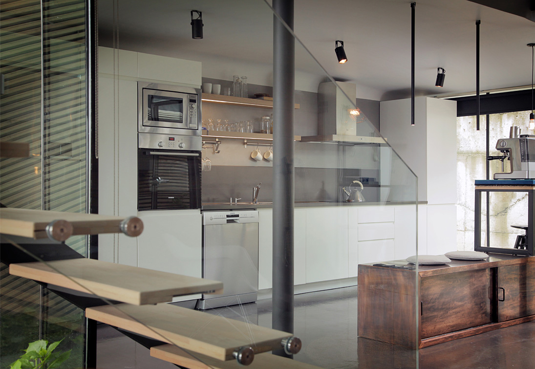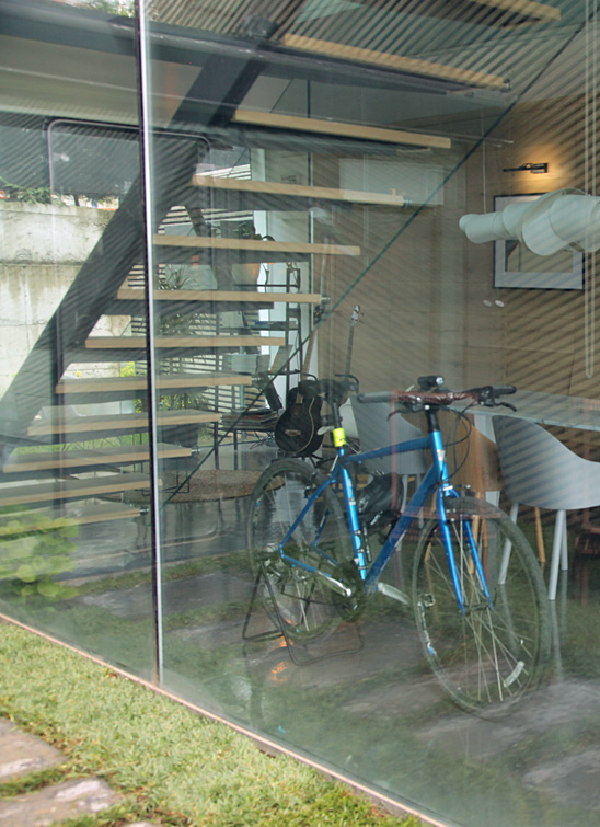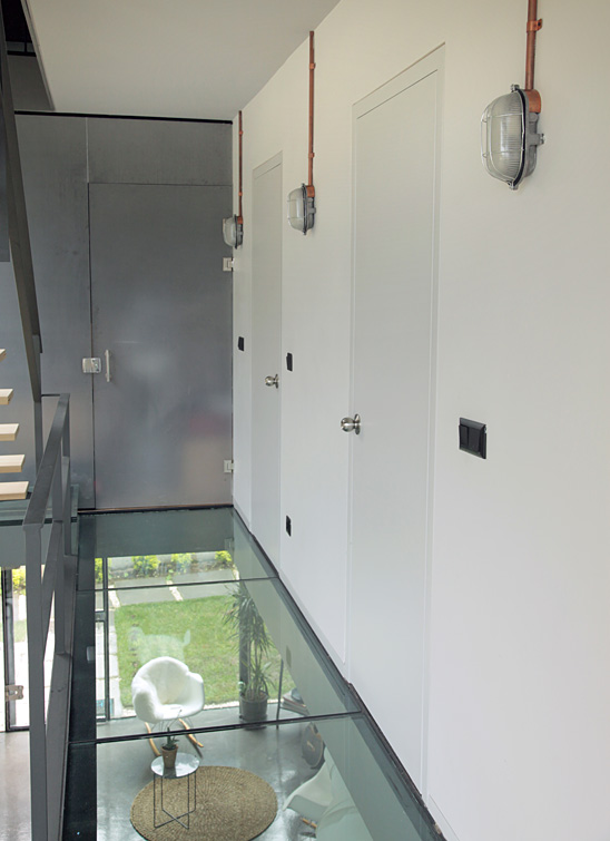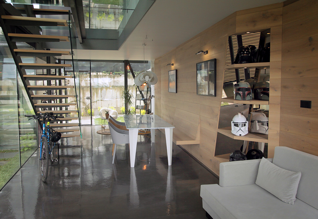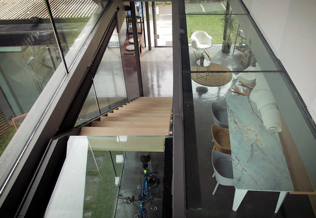 Cam ve çelik taşıyıcılardan oluşan evin mimarisi Ahmet Alataş’a ait. Yeşillikler içinde yer alan, 180m²lik iç mekan ve 24m²lik bir bahçeden oluşan 3 katlı cam evin iç mimarisi ise SOTO tarafından genç bir çift için tasarlanmış.