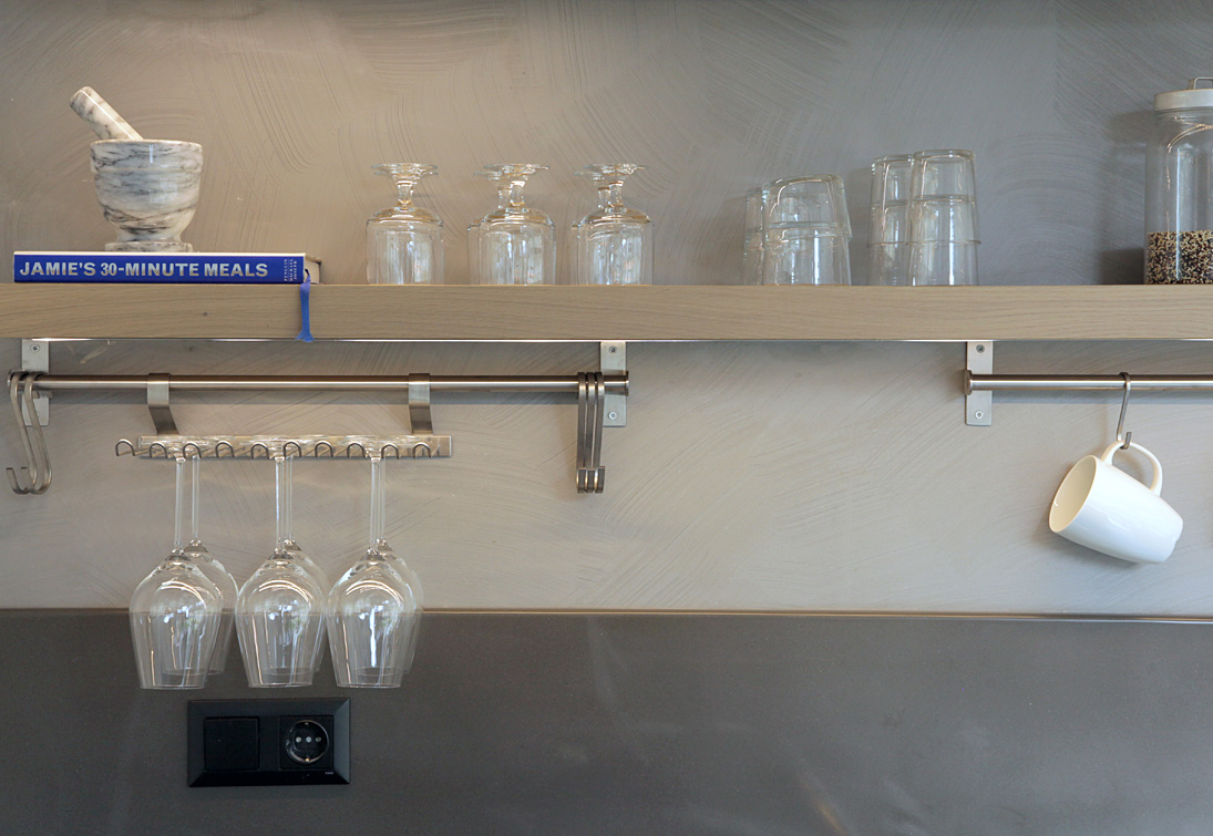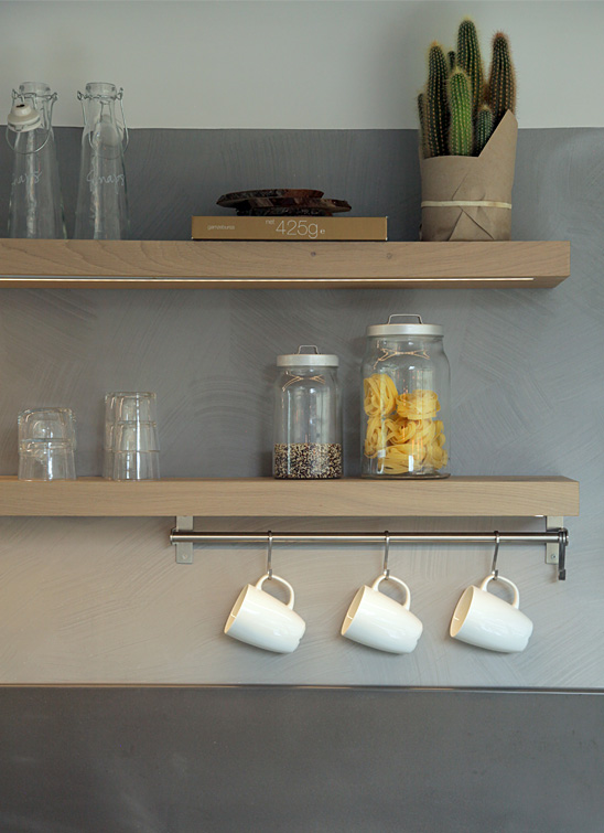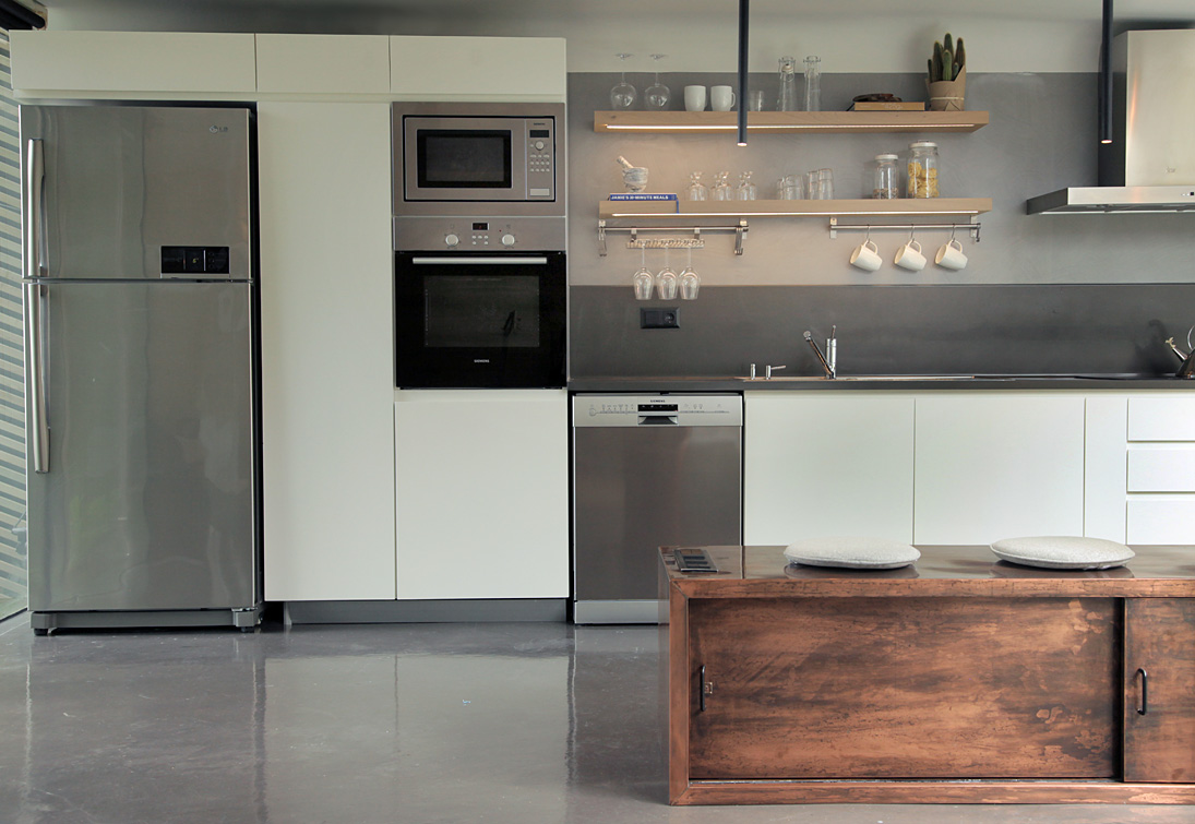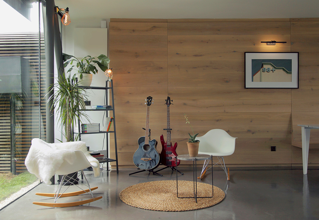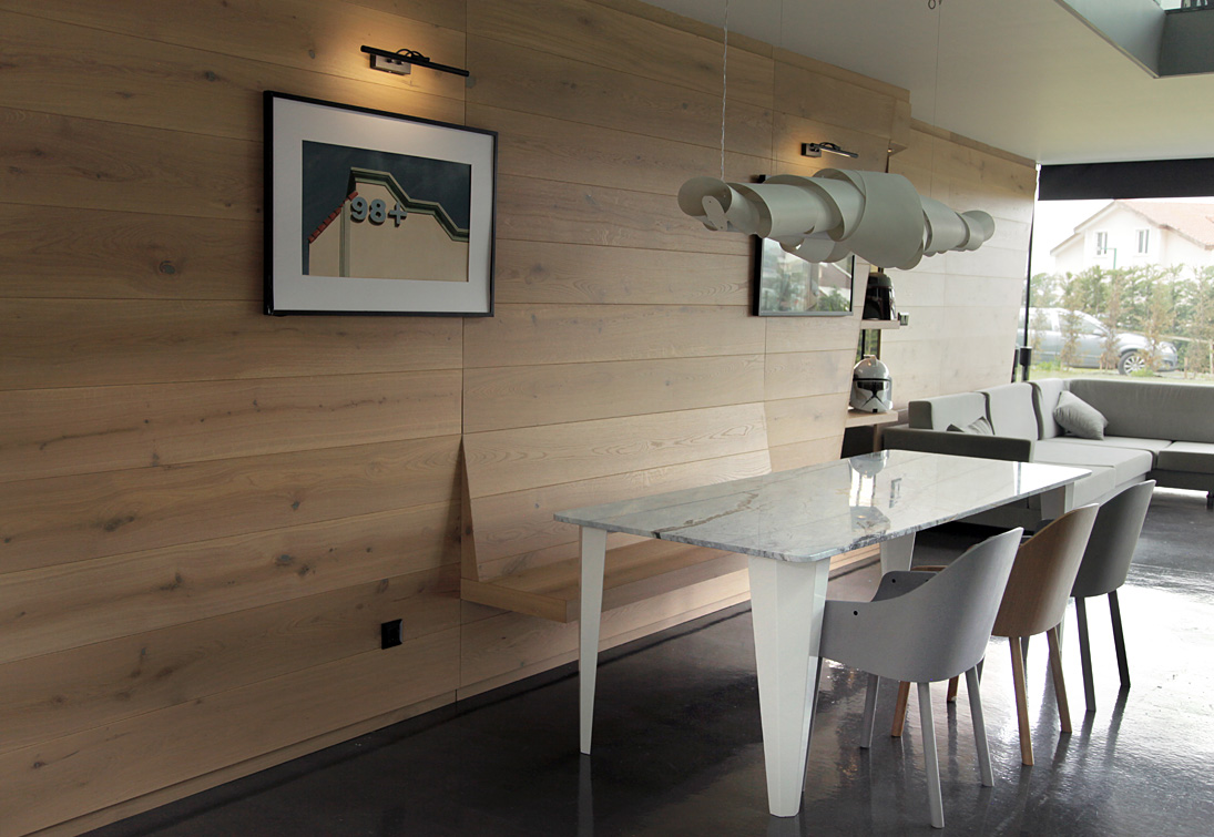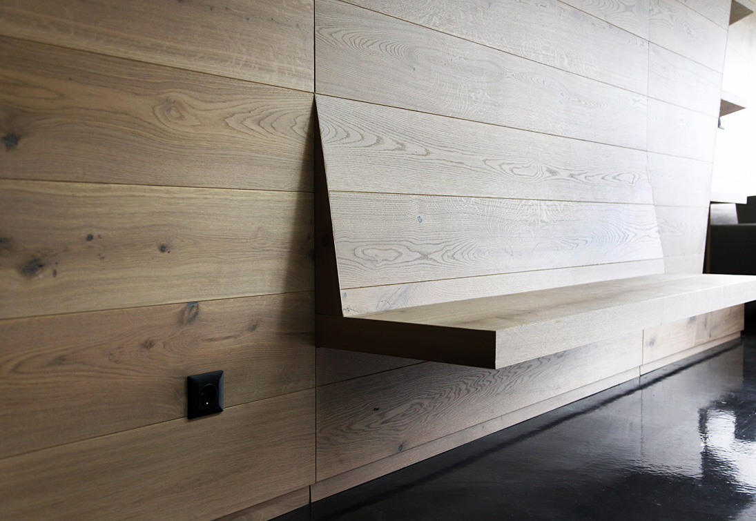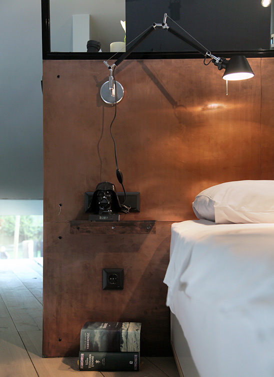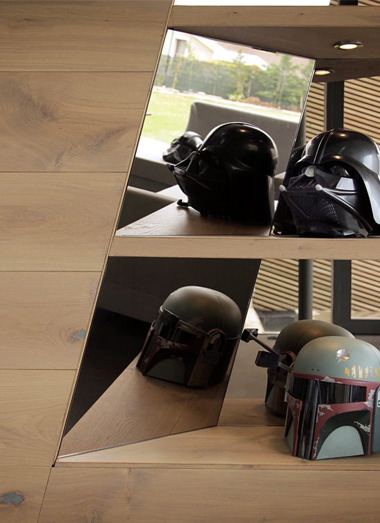 Açık plan olarak tasarlanan evde, mevcut sınırların açısı bozularak yeni akslar elde edilmiş. Duvarda enlenmesine kullanılan masif mese rabitalar bu yeni sınırları işaretlemiş. Oksitlenmiş bakır, masif ahşap ve doğal taşlardan oluşan malzeme paletini, yüzeylerde ve özel imalat ürünlerinde kullanılarak; modern, doğal ve çok yönlü bir mekan oluşturulmuş.