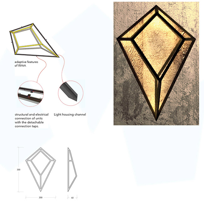 Rekreaktif ışığın doğasına atıfta bulunan WAVa kesişen lineer doğrulardan oluşarak ana çerçevesi ile aydınlatma tarihinde elektrik ışığını difüze etmek için kullanılan kristalden referans alıyor.