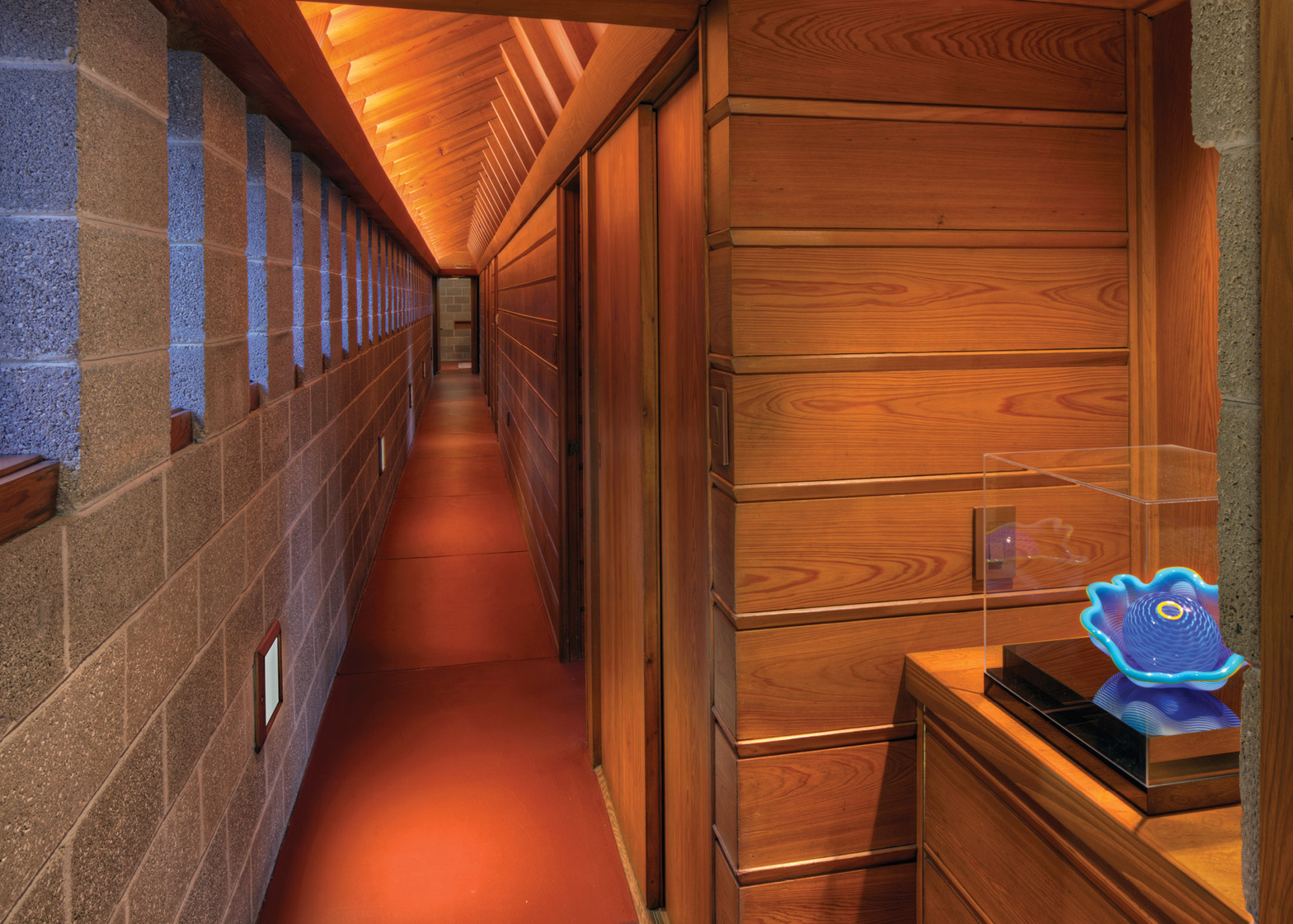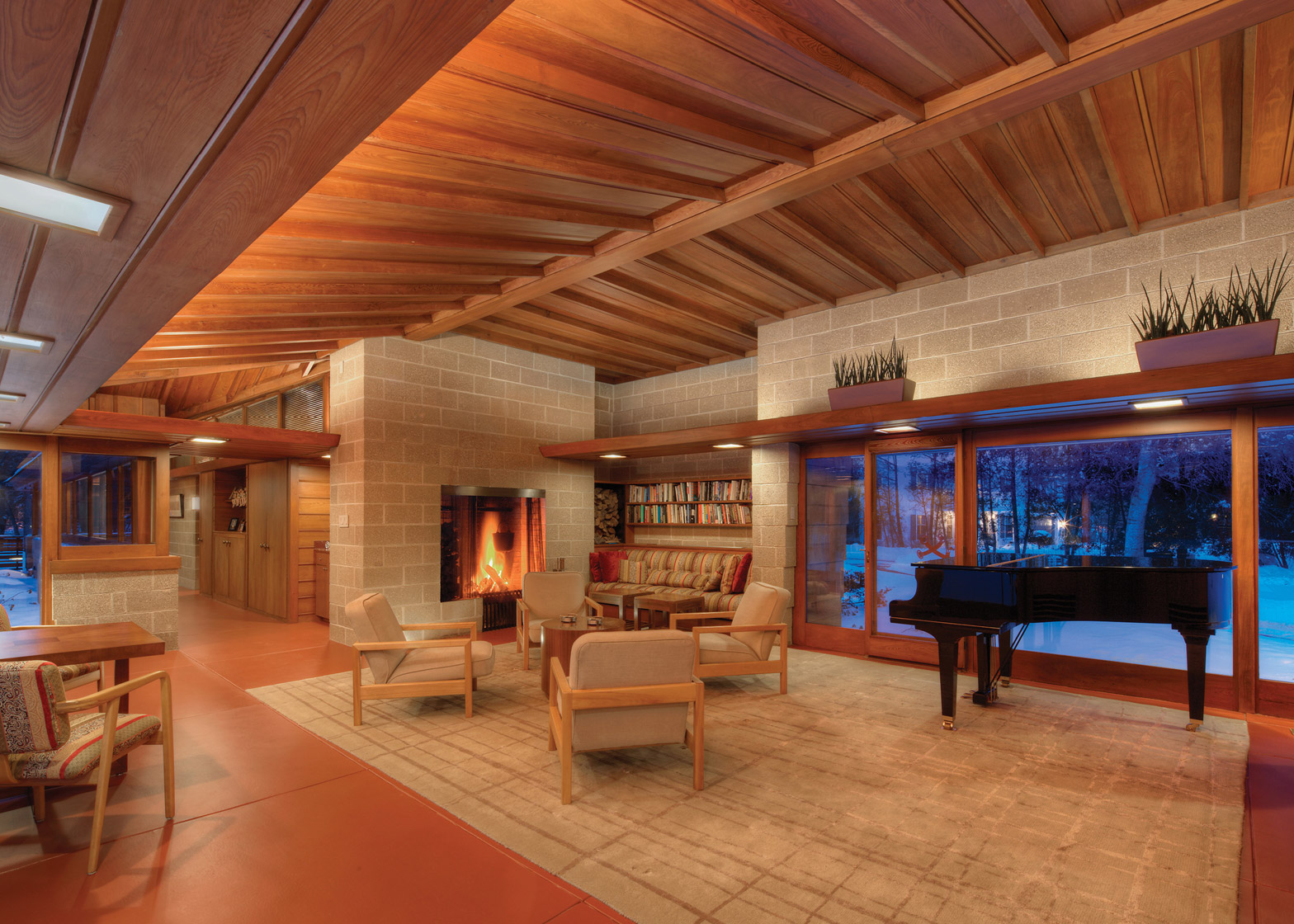 Tek katlı yapının plan şeması; merkezde salon olmak üzere 5 yatak odası, mutfak ve yemek odası şeklinde bir dağılıma sahip. Yüzme havuzu ise projeye yeni eklenmiş. Projeye eklenen bir diğer detay ise yapının bulunduğu lokasyon nedeniyle yaşam alanını sert rüzgarlardan koruyan pencereler. Wright’ın lineer yapısı, doğadan yana tasarımı ile bir adım öne çıkıyor.