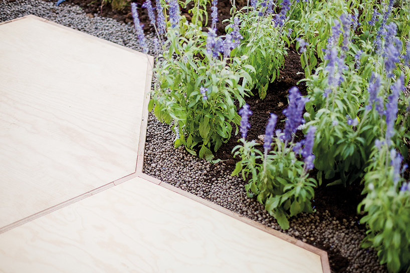 Kentsel bahçe iki kattan oluşuyor: yatay zemin ve dikey aydınlatma sistemleri. Yatay zemin seviyesi, fenolik kontrplaktan tasarlanmış. Altıgen şekiller konfigürasyonlara ve modülerliğe imkan sağlıyor. Bu arada dikey kırmızı prizmalar, hoparlör olarak kullanılan kapsüllerdir. Müziği, doğayı ve ziyaretçiler arasında bir araç görevi gören dinamik bir ortama dönüştürülmesi için entegre edilmiş Akdeniz bitkileri aracılığıyla çevreye geri dönüş sağlanıyor.