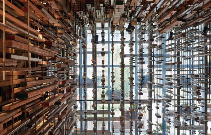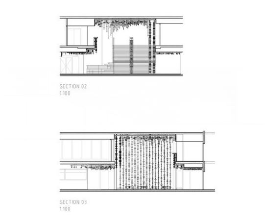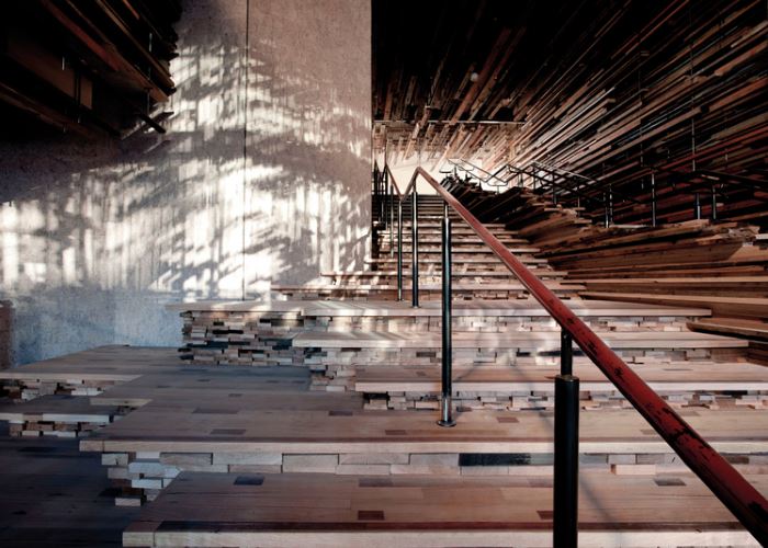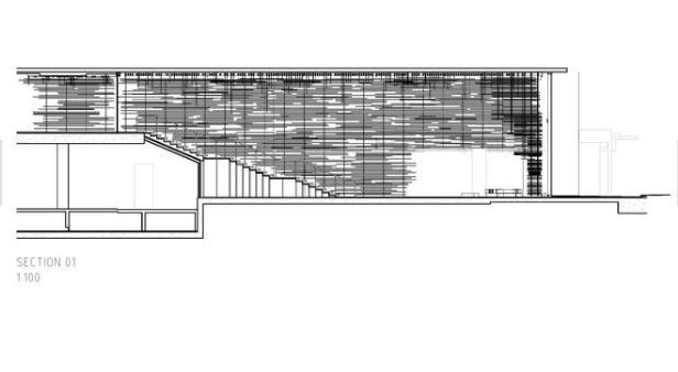 Merdiven tasarımında, hafif kalaslar, sıkıştırılarak ve birbirine bağlanarak yerden yükselen bir kütle oluşturulmuş. Dağınık bir düzenle, tavanda da devam eden tasarımda, pikselli efekt oluşturacak gölgeler sağlanmış. Bu pikselli, örümcek ağındaki gölgeler, duvarları ortaya çıkararak, otel ve apartman binasını birbirine bağlayan önemli bir bağlaç olmuş.