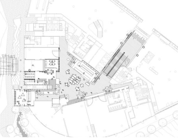Otel lobisindeki duvarlar, oturma alanları, banklar, tezgahlar el yapımı titiz çalışma ile, tıpkı binayı çepeçevre saran cilalanmış ahşaplarla kaplanmış. Malzemeler; özel üretim lamine ahşap, prekast beton kirişler.