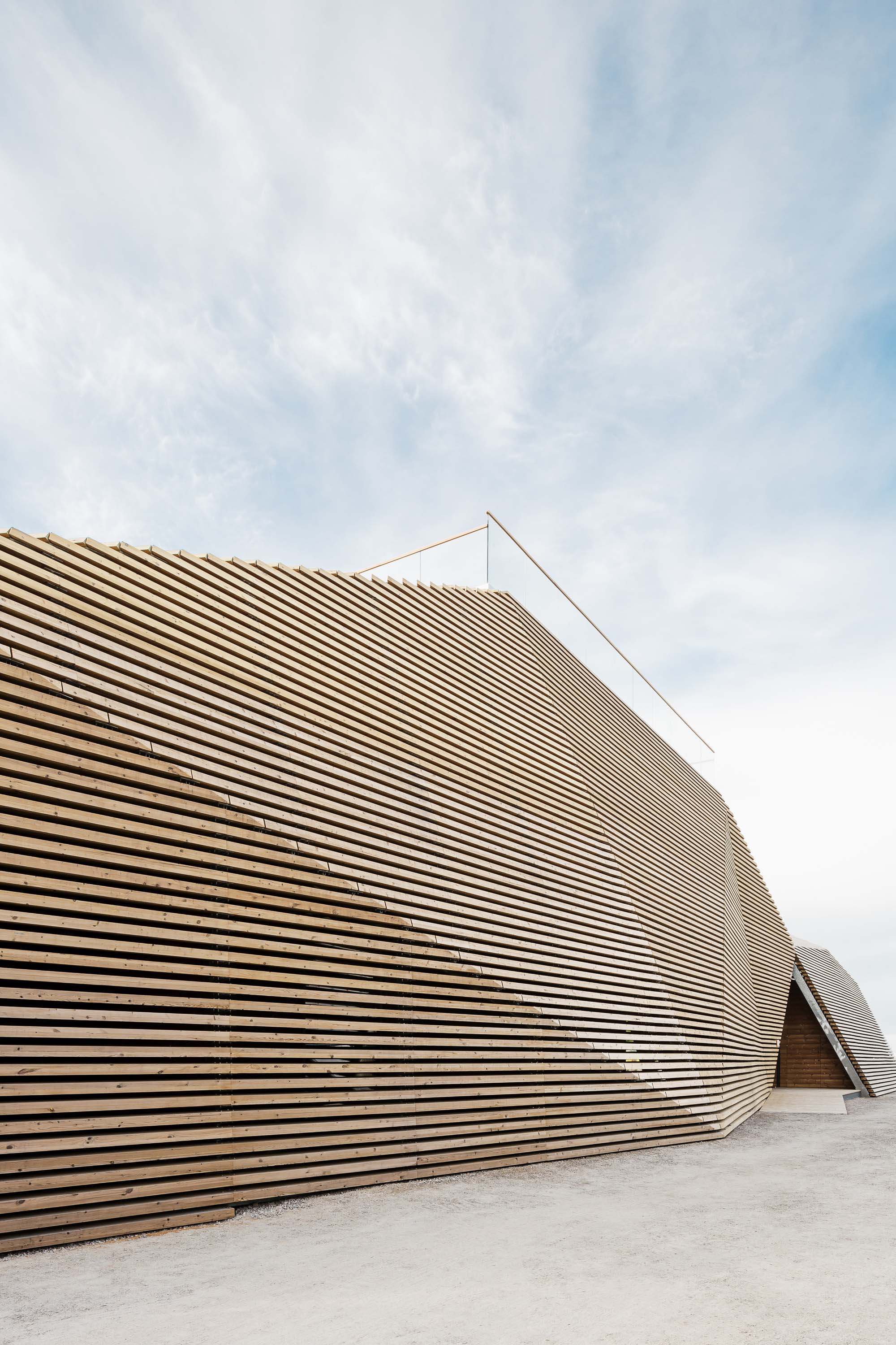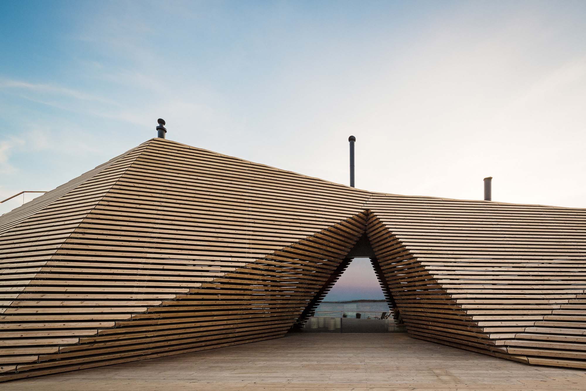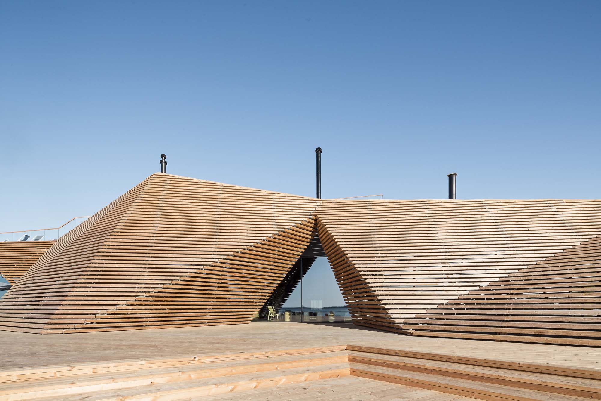 Mimari fikir oldukça basit: Sıcak mekanları içine alan bir dikdörtgen prizma ve çevresini saran serbest formlu ahşap bir “örtü”. Tavlanmış çam ağacından yapılan heykelsi strüktürün sadece dekorasyon olmanın ötesinde pek çok işlevi var. Örtü kullanıcılara görsel mahremiyet sağlıyor. İnce levhalar içeriden bakıldığında deniz manzarasını engellemeseler dahi, panjur gibi çalışarak dışarıdan içeriye bakışı bloke ediyorlar. Sıcak kütle ve dış örtü arasındaki mekanlar sauna banyosu ve dışarısı arasındaki sıcaklık dengesini sağlıyor. Strüktür binayı sert kıyı ikliminden koruyor. Büyük camlı yüzeylere gölge sağlıyor ve binanın soğutulması için gereken enerjiyi azaltıyor. Örtünün basamaklı formu çatıya tırmanılıp tepeden çevrenin izlenmesini olanaklı kılıyor. Bina dış mekanında büyük bir açık oditoryuma dönüşerek ileride yapılacak su sporları aktiviteleri için de alan oluşturuyor.