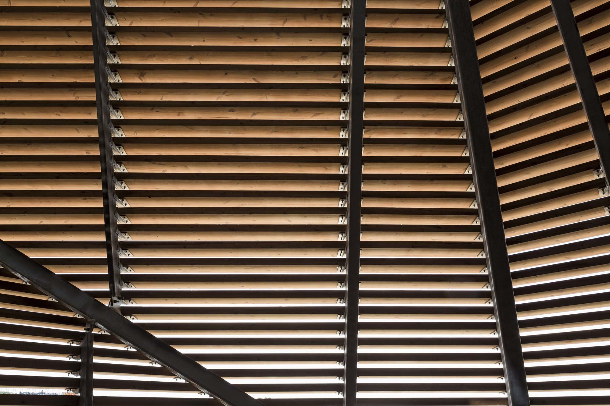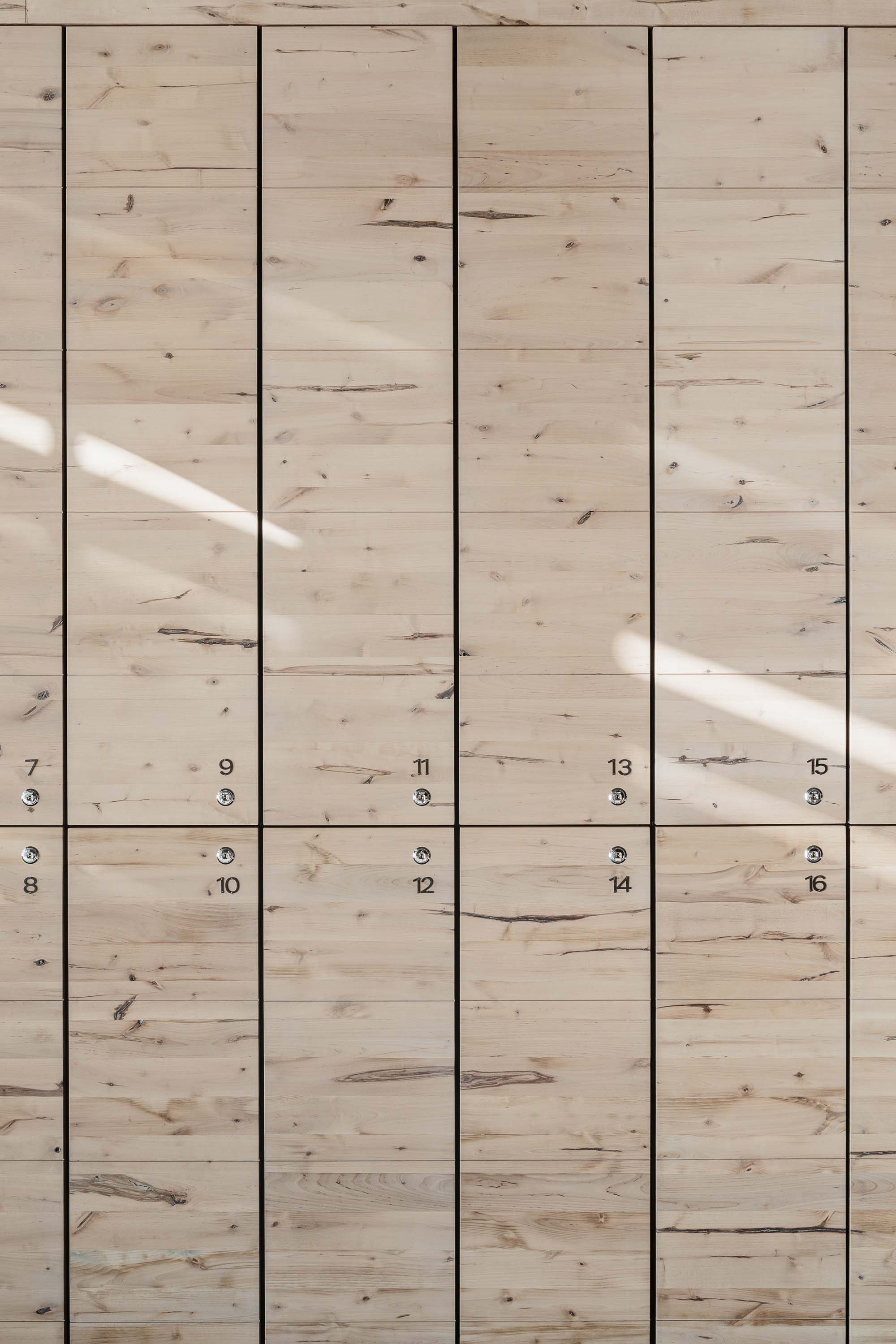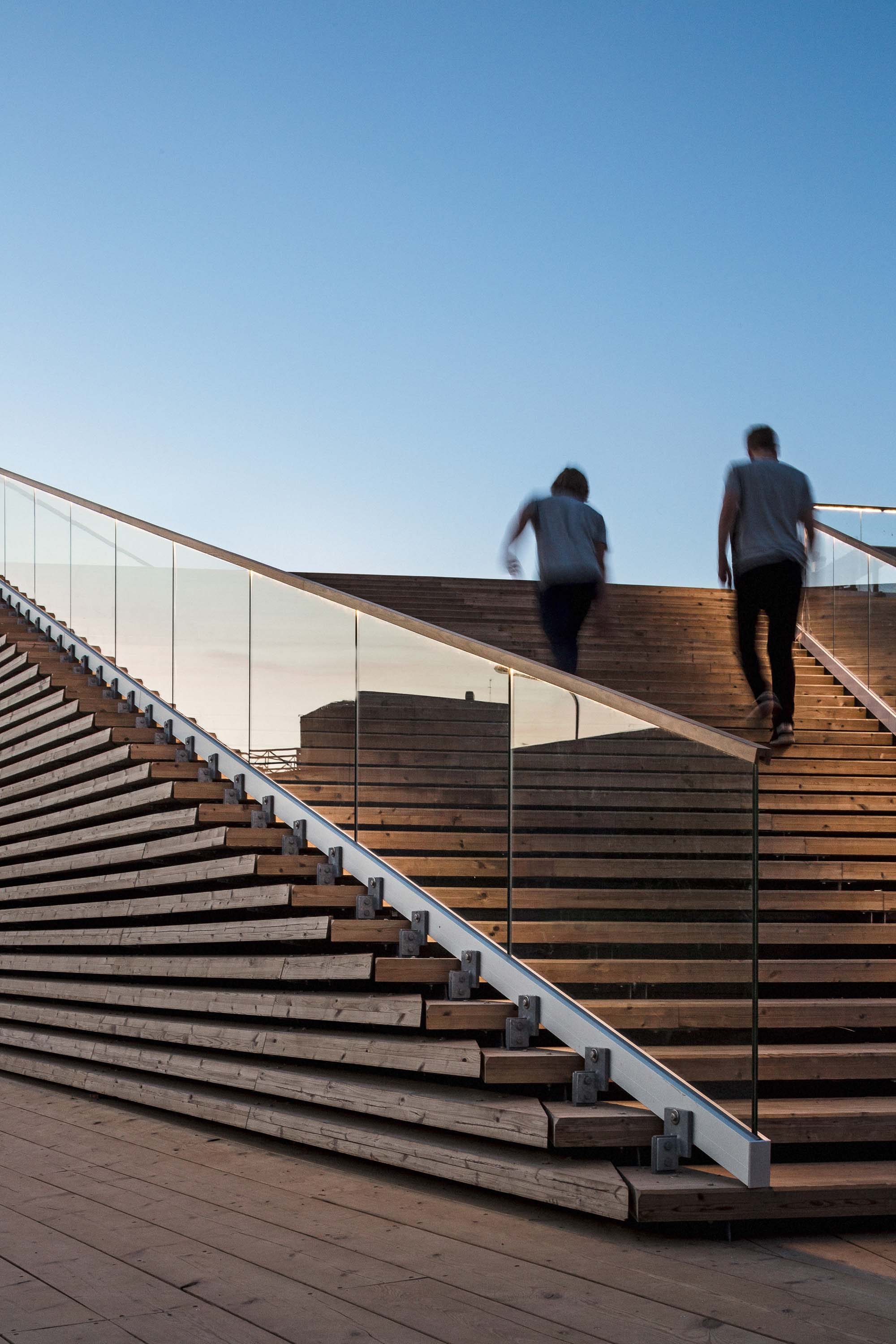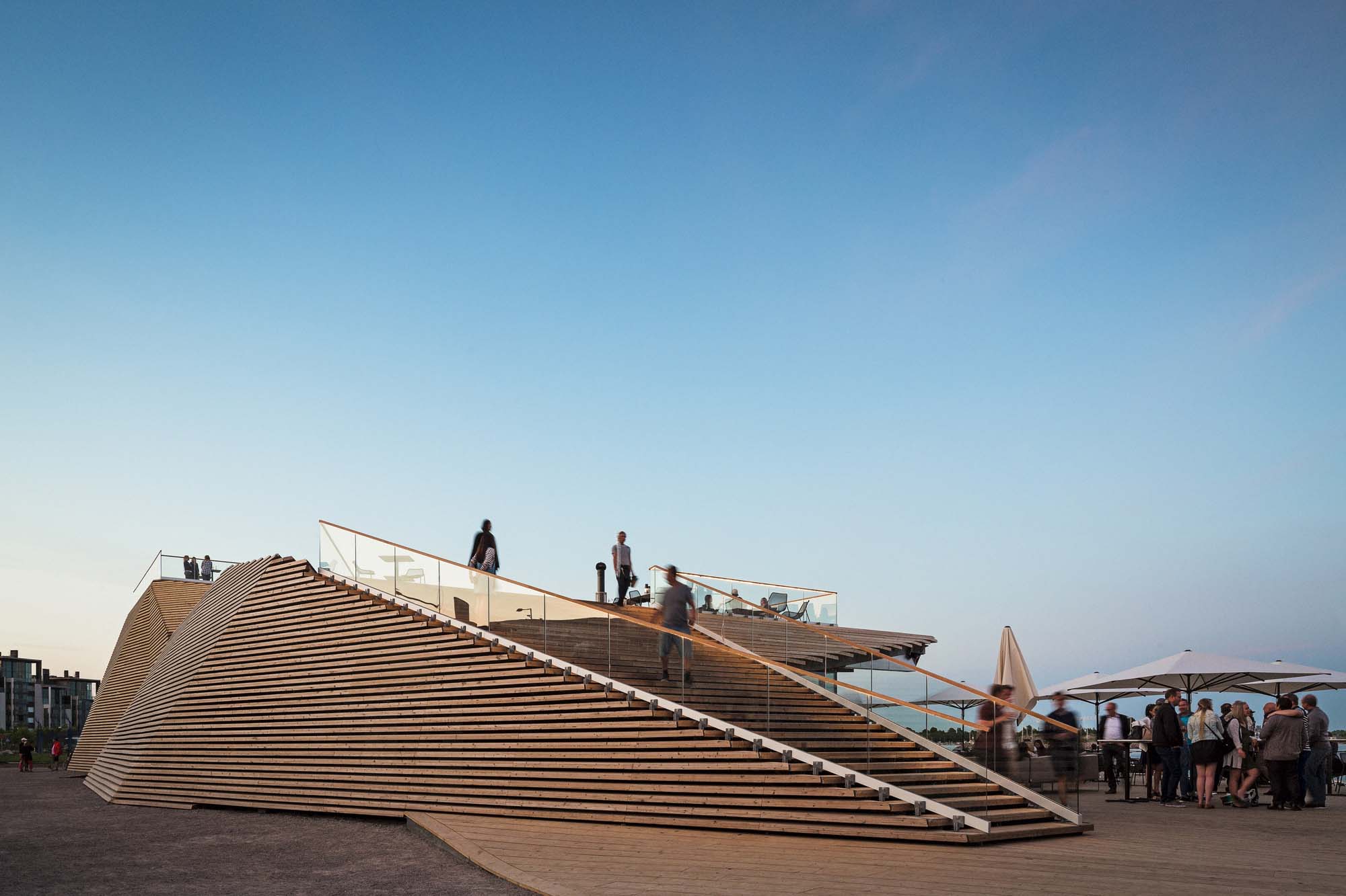 Mimari fikir oldukça basit: Sıcak mekanları içine alan bir dikdörtgen prizma ve çevresini saran serbest formlu ahşap bir “örtü”. Tavlanmış çam ağacından yapılan heykelsi strüktürün sadece dekorasyon olmanın ötesinde pek çok işlevi var. Örtü kullanıcılara görsel mahremiyet sağlıyor. İnce levhalar içeriden bakıldığında deniz manzarasını engellemeseler dahi, panjur gibi çalışarak dışarıdan içeriye bakışı bloke ediyorlar. Sıcak kütle ve dış örtü arasındaki mekanlar sauna banyosu ve dışarısı arasındaki sıcaklık dengesini sağlıyor. Strüktür binayı sert kıyı ikliminden koruyor. Büyük camlı yüzeylere gölge sağlıyor ve binanın soğutulması için gereken enerjiyi azaltıyor. Örtünün basamaklı formu çatıya tırmanılıp tepeden çevrenin izlenmesini olanaklı kılıyor. Bina dış mekanında büyük bir açık oditoryuma dönüşerek ileride yapılacak su sporları aktiviteleri için de alan oluşturuyor.