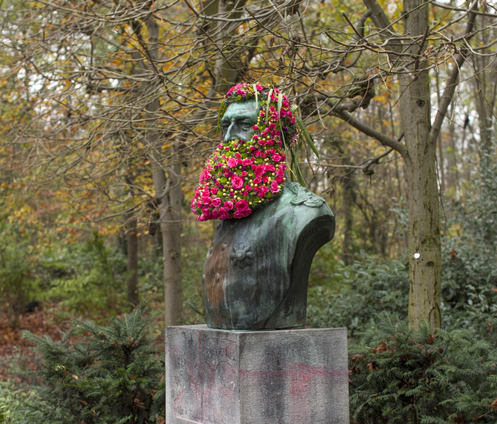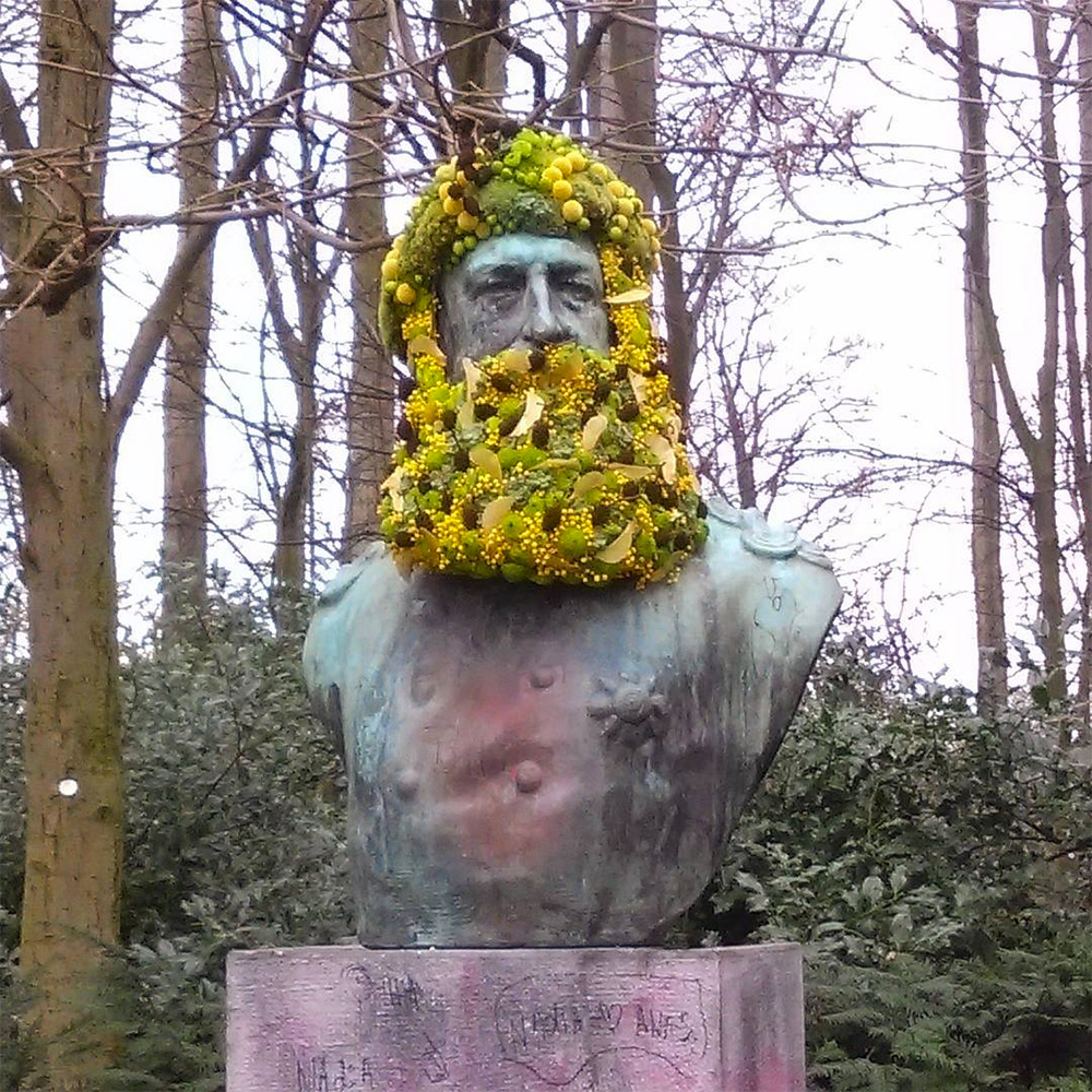 Çiçekçi Geoffroy Mottart, Brüksel’de halka açılan anıtlara, çiçeklerden saç ve sakal tasarladı.
