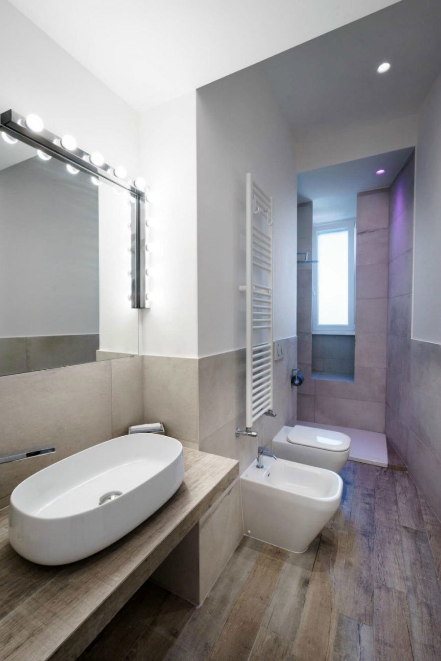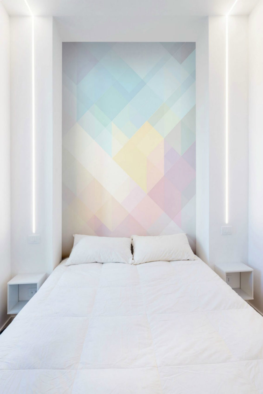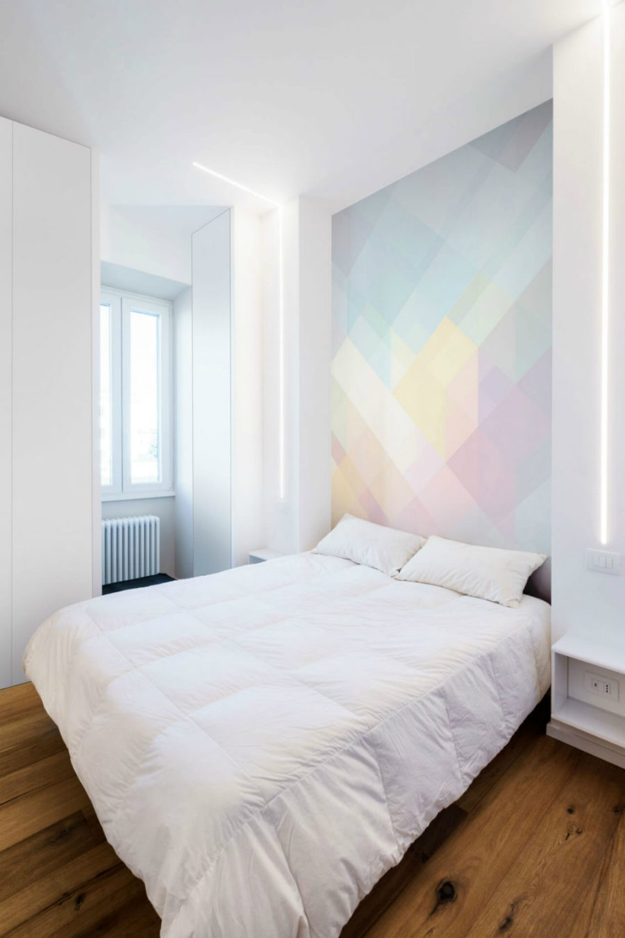 Daha küçük ayrıntılar da bu özel beyaz dekorun öne çıkmasını sağlıyor. Beyaz ışıklı modern bir armatür, duvarı zenginleştirirken yanındaki saklama kutuları mükemmel bir yan masa işlevi görüyor. Dokulu ahşap döşeme, yapay şöminenin dışında büyüyen küçük bir bitki mekana doğal sıcaklık ve dinamik getiriyor. Yatak odasında bir iz bırakmak için tasarımcılar, renkli pastel geometrik şekillerle dolu opalet özellikli bir duvar seçmişler. Ve bununla birlikte banyoda ahşap ve yine beyaz ağırlıklı tasarlanmış.