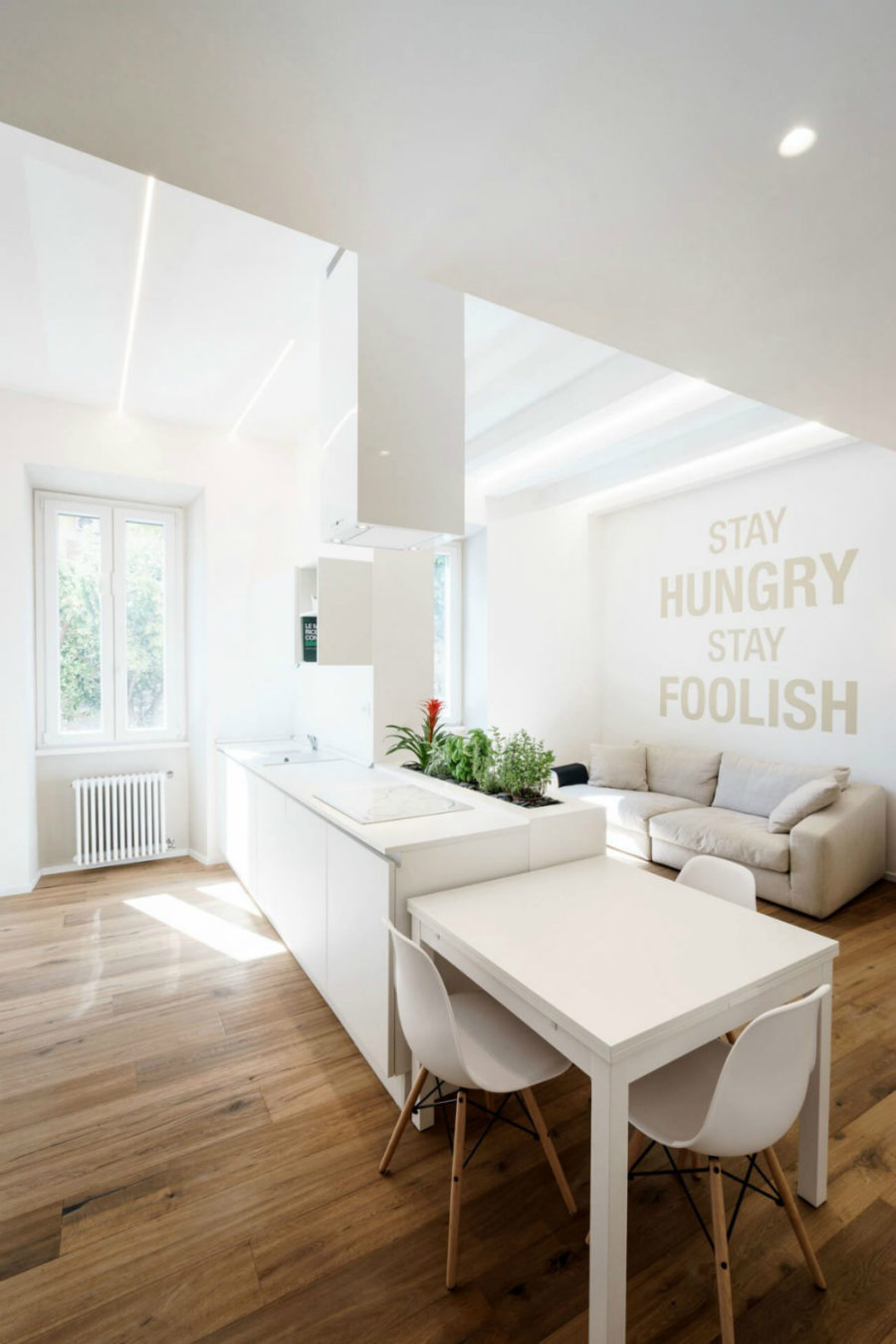 Çok sayıda pencere ve çevre aydınlatmasının akıllı kullanımı sayesinde küçük ev şaşırtıcı derecede ferah görünüyor. Yaşam alanı, natürel tonda ilham veren duvar yazılarıyla daha görkemli görünmesini sağlamak için büyük fontla yazılmıştır. TV duvarı, yaşam bölgesini minimal mutfaktan ayırıyor. Yapay bir şömineyle devam eden bölücü devamındaki beyaz bir yemek masası ile bitiyor.