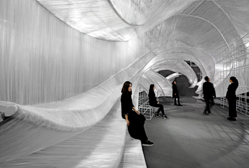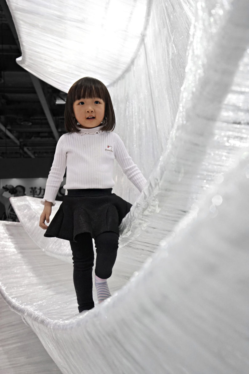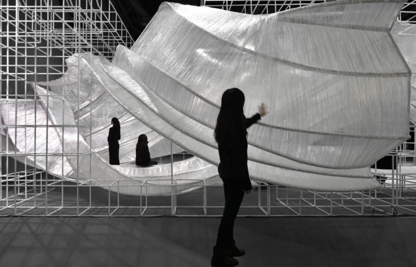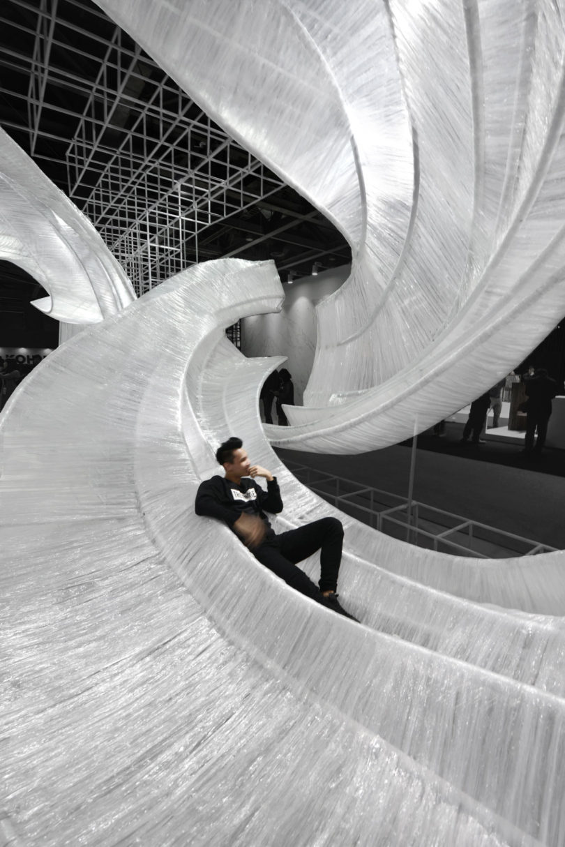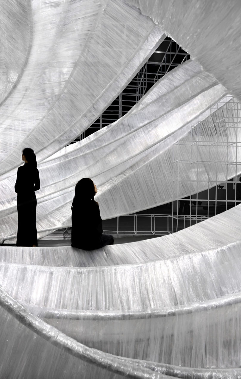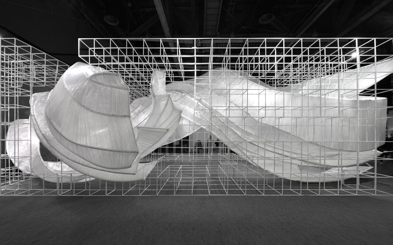 Izgaralı bir sistem, bükülen iç yapıların etrafında şeffaf film dokumayla yapılan dalgalı eğrileri bir arada tutuyor. Bükülmüş kabuk benzeri modüller, giriş yolu, duvarlar, tavan, pencere, masa ve oturma yerleri için oluşturulmuş ve parçayı işlevsel bir sanat eseri haline getiriyor. Aynı zamanda şeffaf malzeme, ortam ışığının eğik parçalara nasıl geldiğine bağlı olarak değişen ışık ve gölgeler üretiyor. PONE MİMARLIK, Guangzhou Design Week’de Transparent Shell’i tanıtmasının ardından AAP Amerikan Mimarlık Ödülü’nde İç Mimari / Sergi kategorisinde Altın Ödül kazanarak tasarımını taçlandırmış.
