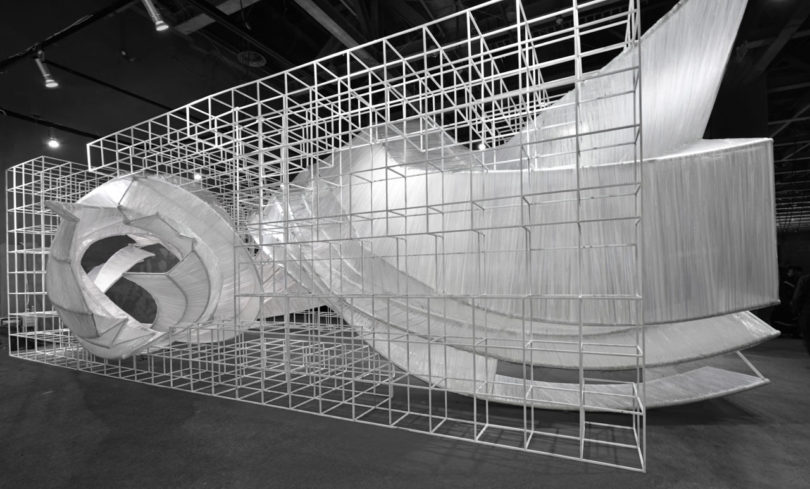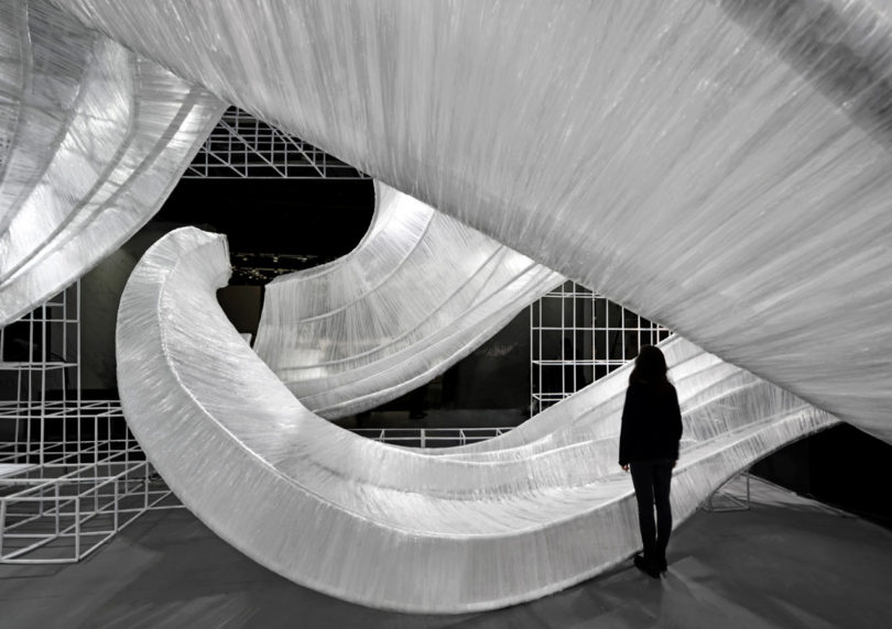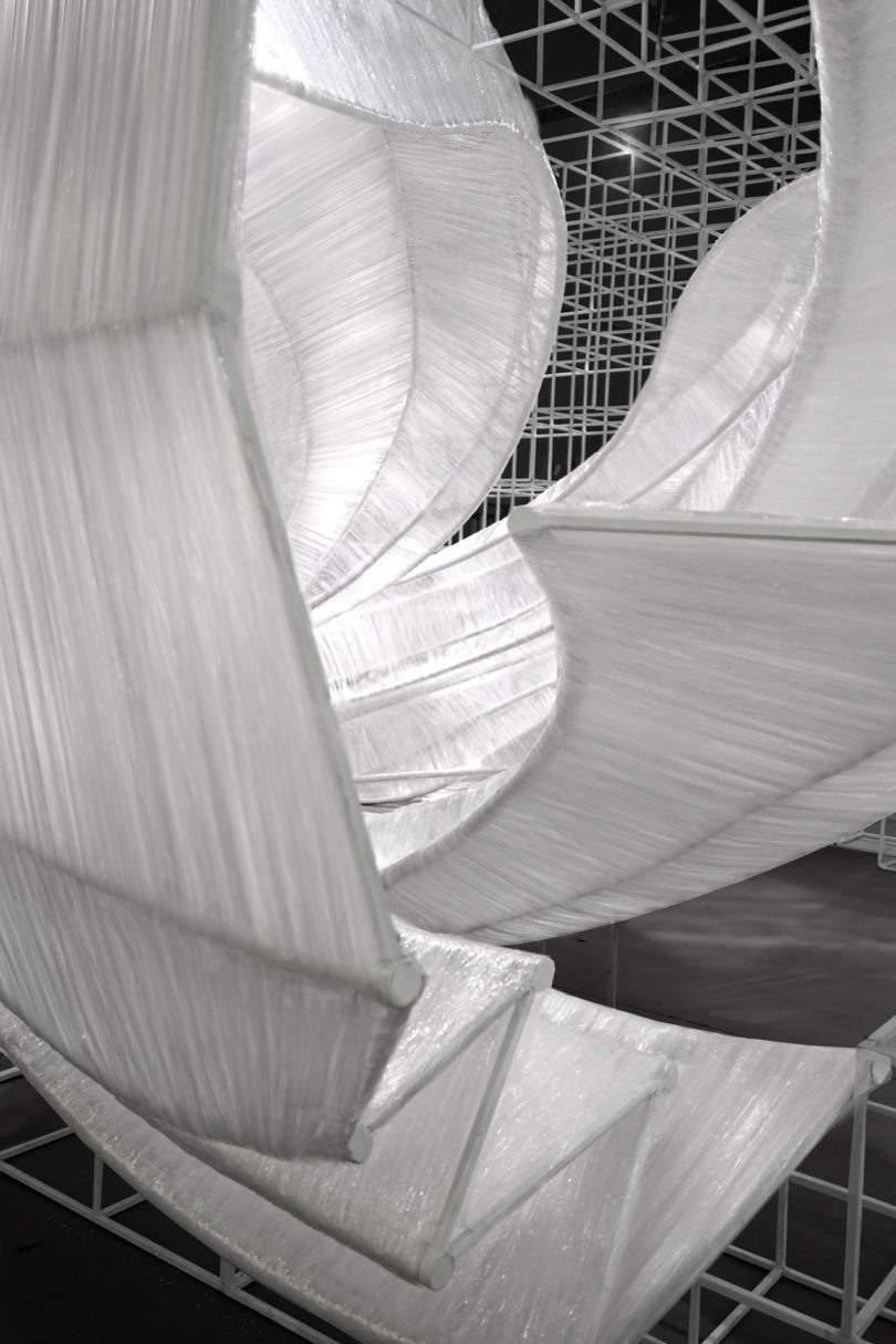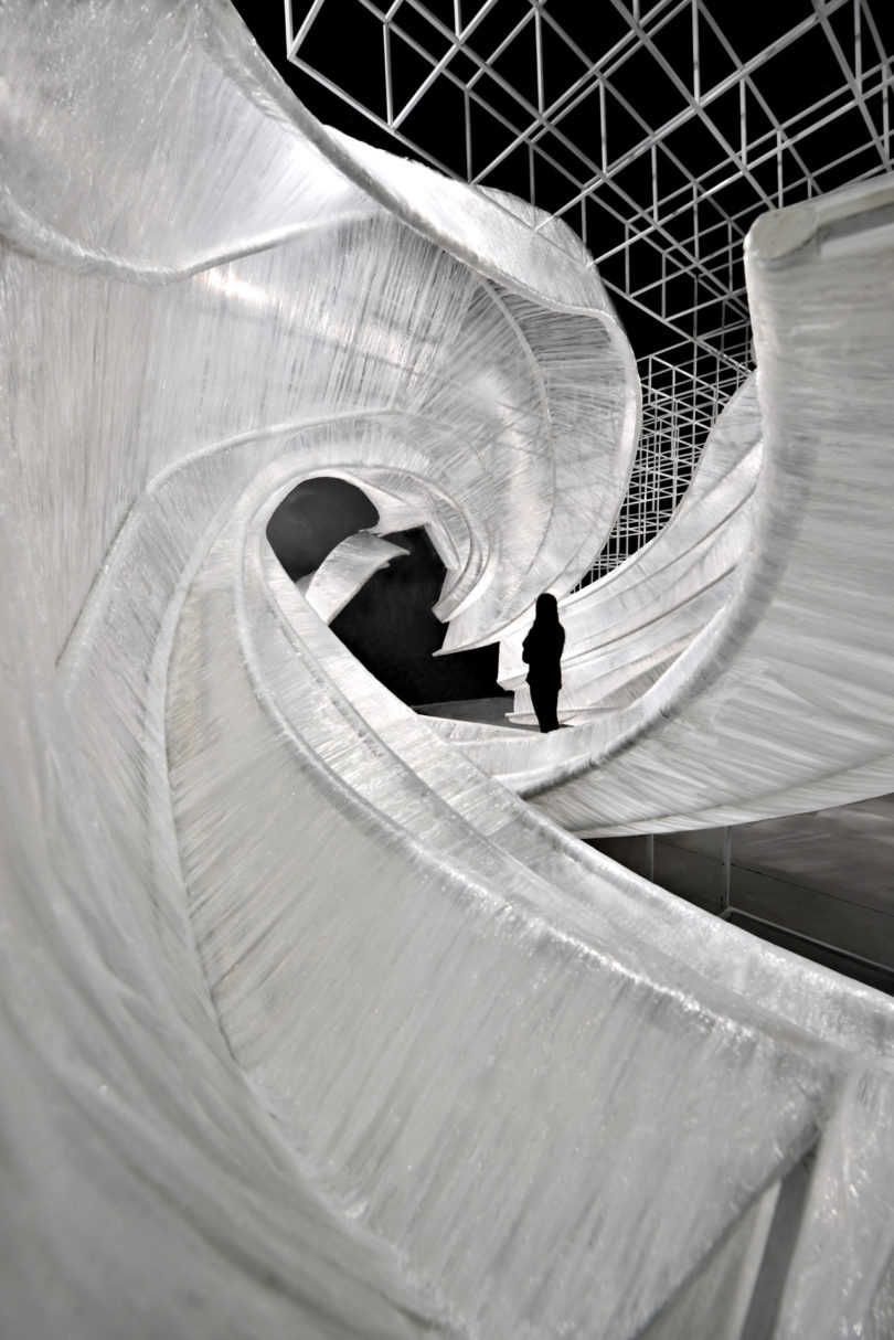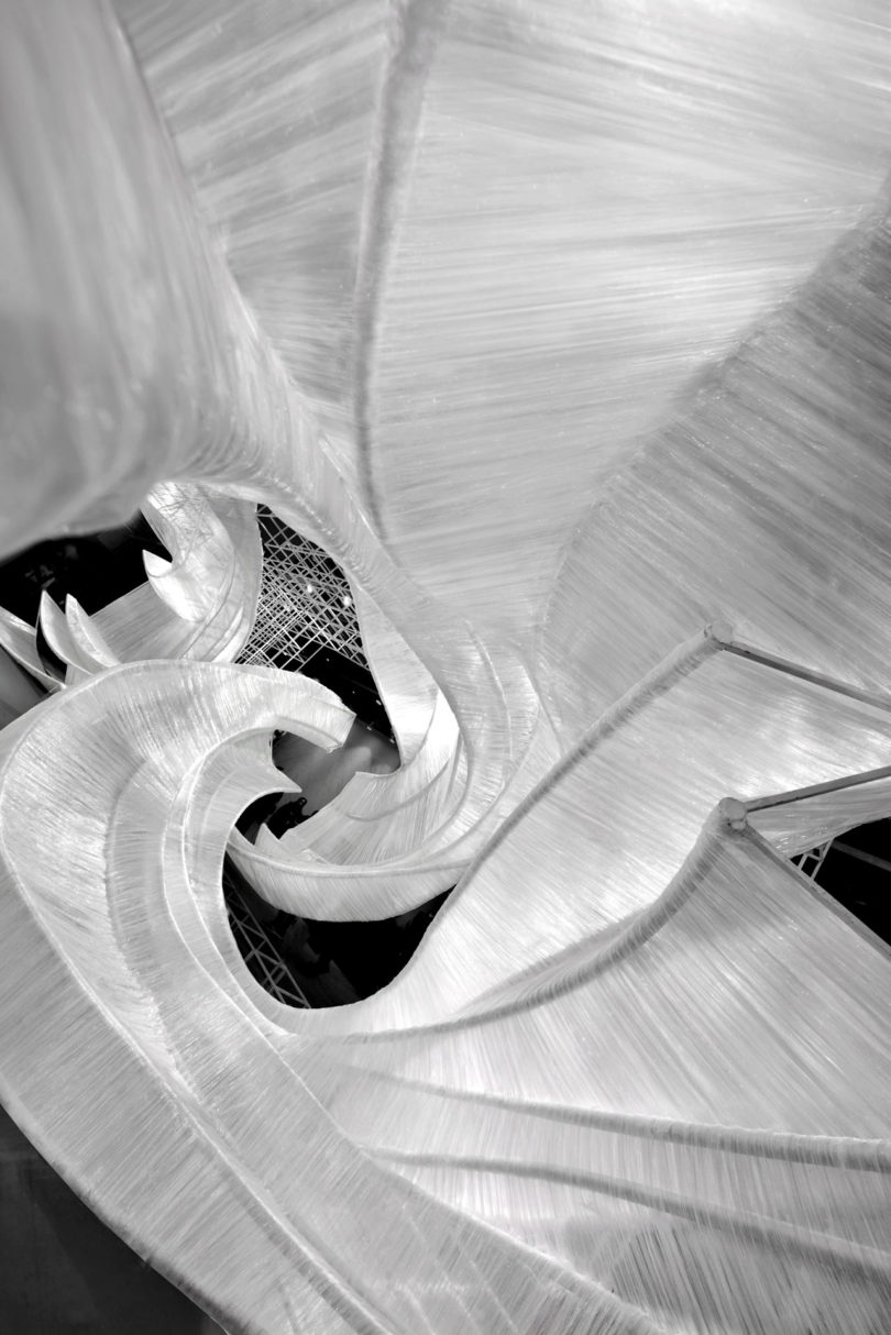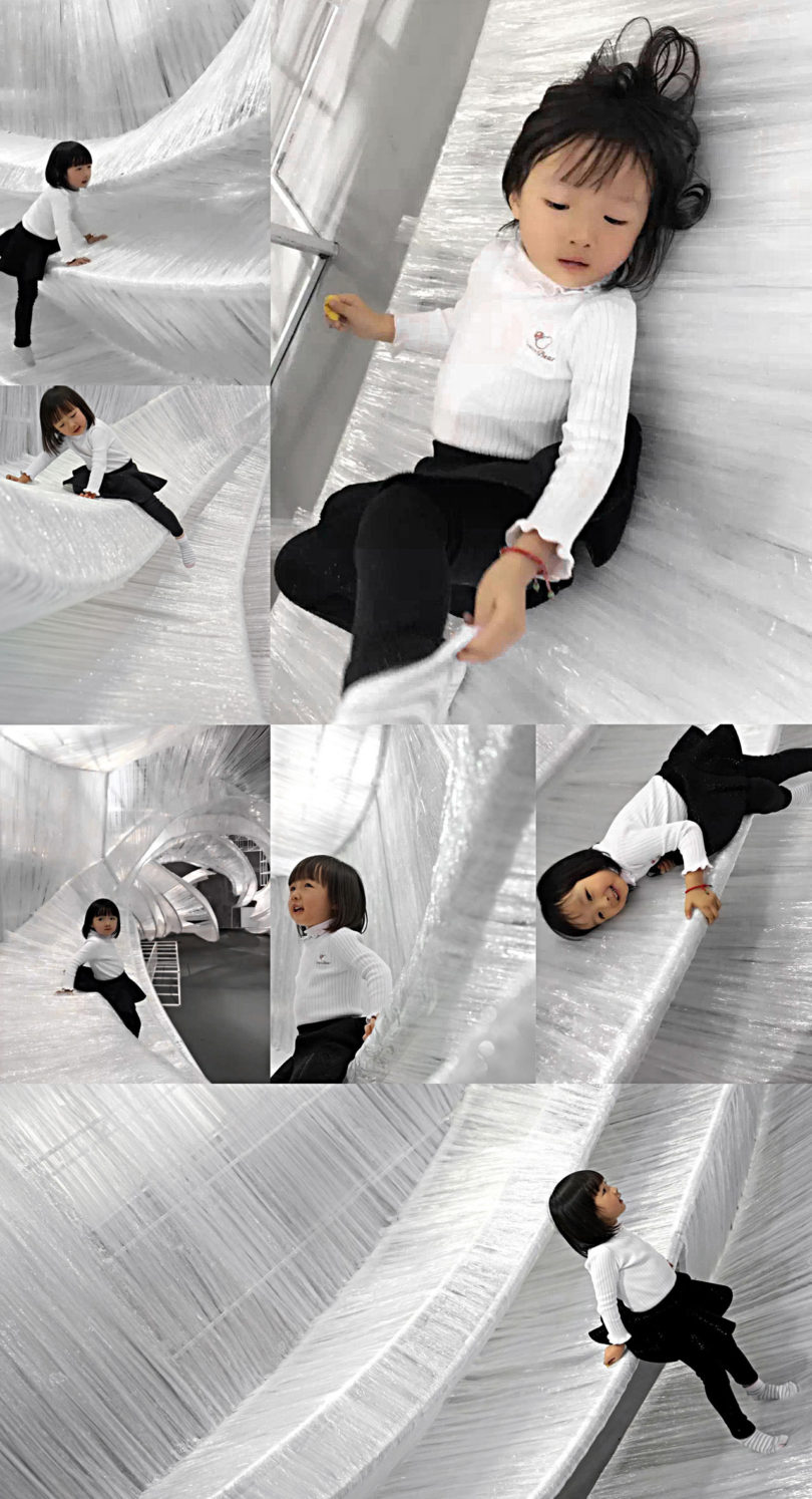 Izgaralı bir sistem, bükülen iç yapıların etrafında şeffaf film dokumayla yapılan dalgalı eğrileri bir arada tutuyor. Bükülmüş kabuk benzeri modüller, giriş yolu, duvarlar, tavan, pencere, masa ve oturma yerleri için oluşturulmuş ve parçayı işlevsel bir sanat eseri haline getiriyor. Aynı zamanda şeffaf malzeme, ortam ışığının eğik parçalara nasıl geldiğine bağlı olarak değişen ışık ve gölgeler üretiyor. PONE MİMARLIK, Guangzhou Design Week’de Transparent Shell’i tanıtmasının ardından AAP Amerikan Mimarlık Ödülü’nde İç Mimari / Sergi kategorisinde Altın Ödül kazanarak tasarımını taçlandırmış.