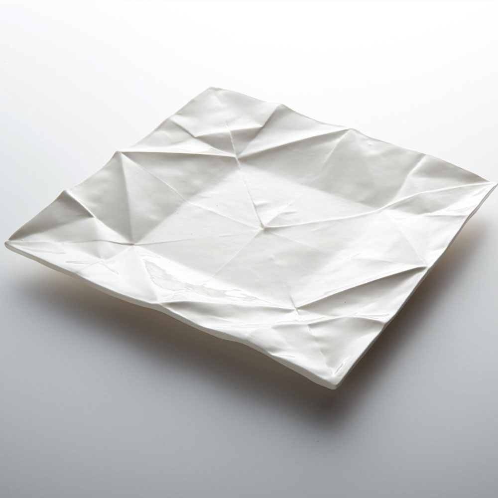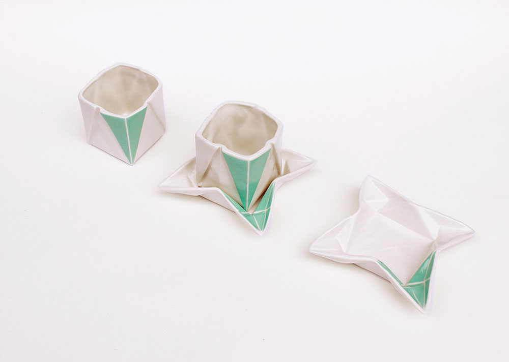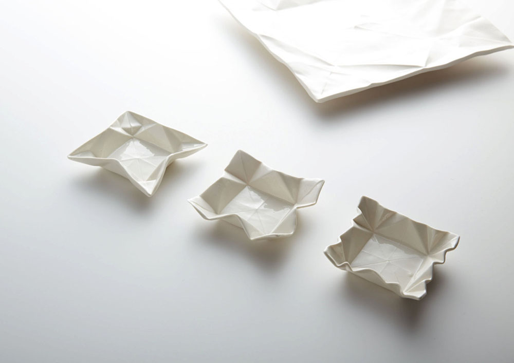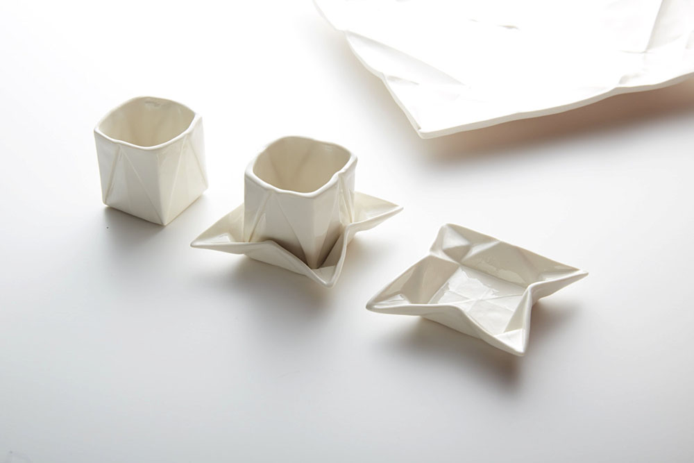 Tasarımcı ilk olarak kağıdı analiz etmek için origami şekillerinden izler oluşturuyor sonra da alçıdan kalıplarını hazırlıyor. Seramikteki nihai ürün katlanan kağıt yapısının görünümünü korur. Tasarımları arasında tabak, espresso bardağı katlanmış bardaklar ve bir kısmı boyalı geometrik vazolar bulunuyor.