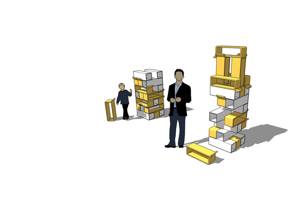 Jenga isimli oyundan ilham alarak yapılan mobilya, kullanıcıyla ilişkisini uzun yıllar sürdürebilecek şekilde tasarlanmıştır. Yeni yürüyen çocuklar için oturak, daha büyük çocuklar için sandalye, genç bireyler için de depolama ünitesi olarak kullanılabilmesi onu uzun süre kullanılabilir kılıyor. Huş kontrplak ve paslanmaz çelik parçalardan oluşturulan mobilya, uzun süreli kullanım için gerekli olan güç ve dayanıklılığı sağlıyor.