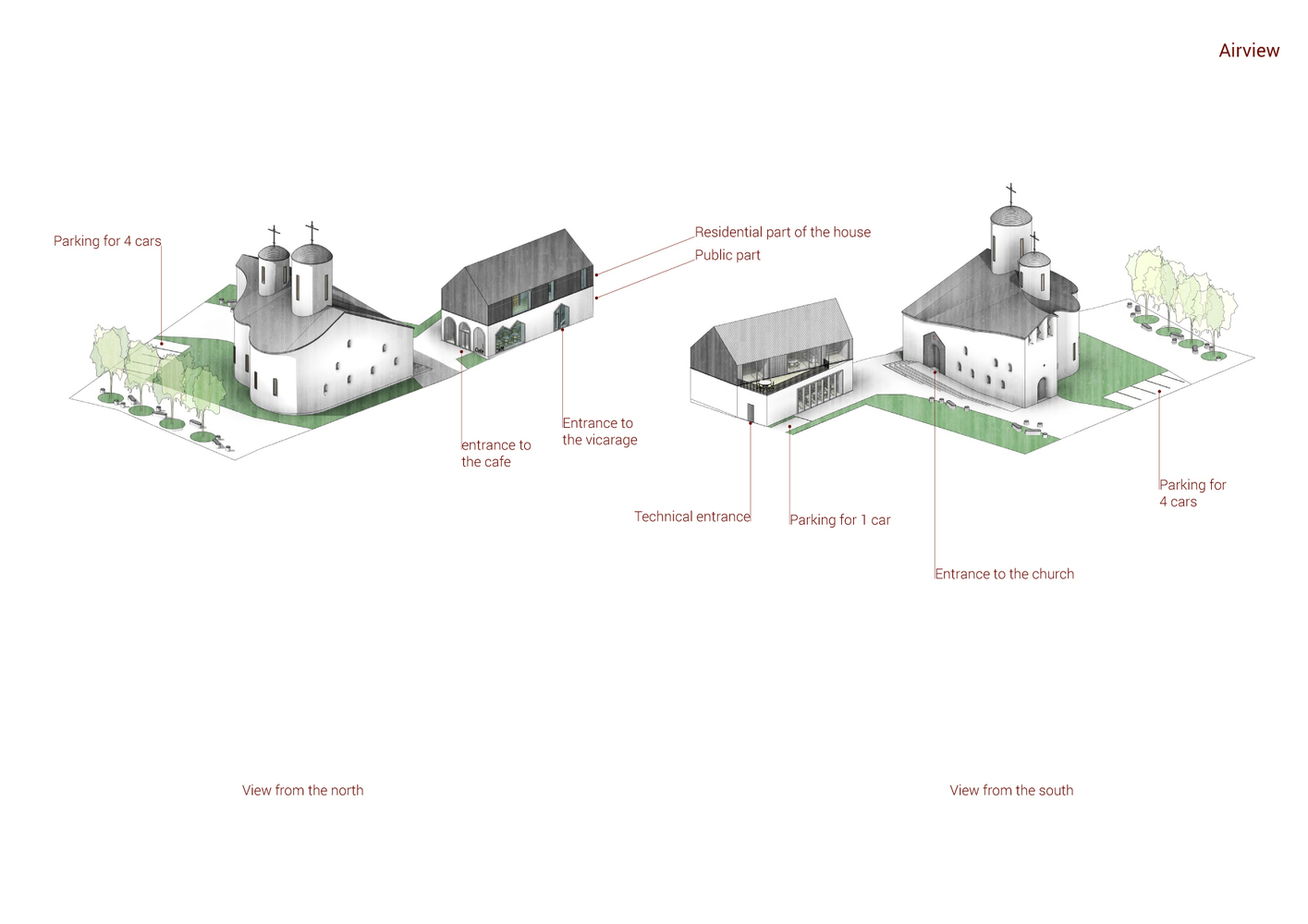 Önerilen tasarım geleneksel bir Rus kilisesinin kompozisyonunu minimalist Nordic estetiği ile birleştirecek biçimde tasarlanmış. Bu simbiyotik ilişki ile birlikte mimarlar, iklim, gün ışığı ve peyzaj gibi bölgesel faktörleri kullanarak hangi elementlerin her iki kültürden de beslenebileceğini belirlemişler. Örneğin, Parish House, geleneksel bir bölüm. Alt katında, soğuk bir sıcaklığa sahip olan boş bir depo niteliğinde bir alan Rus dua alanı gibi işlev görüyor. Parish House’un ikinci katında daha ahşap yapı ile yalıtılmış olması nedeniyle konaklama imkânı sağlanmıştır. Rus kilise mimarisinde tipik olan dekoratif taş öğesi de beyaz sıva duvarlar ve gri ahşap bir çatı kullanılarak saflık ve minimalizm ile değiştirilmiş. Estetik bölgedeki komşu yapılarla eşleşmeyen sıva, kuzeyden gelen gün ışığıyla güzel bir etki yaratıyor ve soğuk Kuzey ülkesinin manzarasını tamamlıyor. Tasarımcılar projenin asimetrik kompozisyonunu kuzey Rusya’nın Estonya bölgesine bitişik olan Pskov’daki kiliselere gönderme yapmak amacıyla tasarlamışlar ancak sıva kaplı eğrileri ile Kültür Merkezi, Le Corbusier’in Notre Dame du Haut’unu da andırıyor.