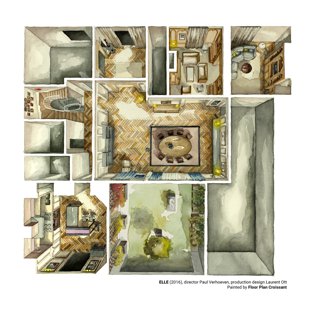Zengin, güçlü ve yalnız yaşayan bir kadın olan Michéle’in geniş yaşam alanı. Detay verecek olursak, eve zorla giren maskeli saldırganın kullandığı cam kapıyı planın sol alt köşesinde görmek mümkün.