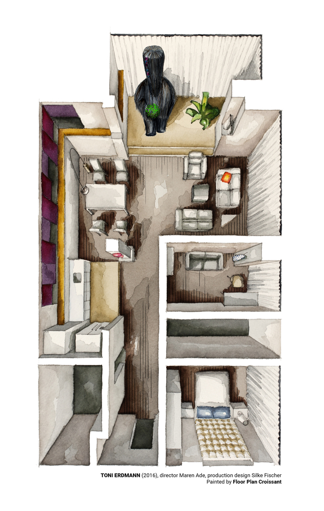 Modern şehir yaşamı içinde kaybolan kızının hayatına Toni Erdmann karakteriyle dahil olan bir baba… Ev planında yer alan siyah kostüm ise kilit sahneyi hatırlatıyor.