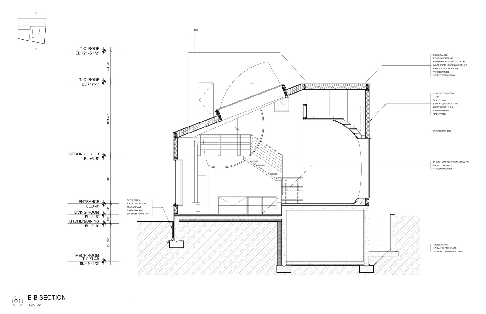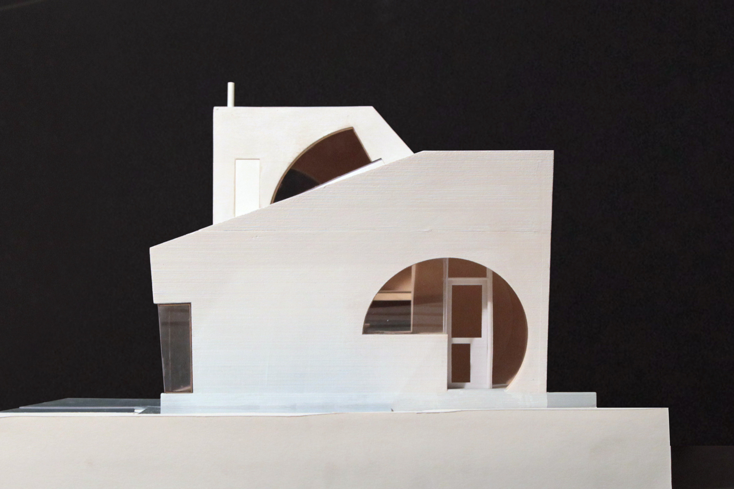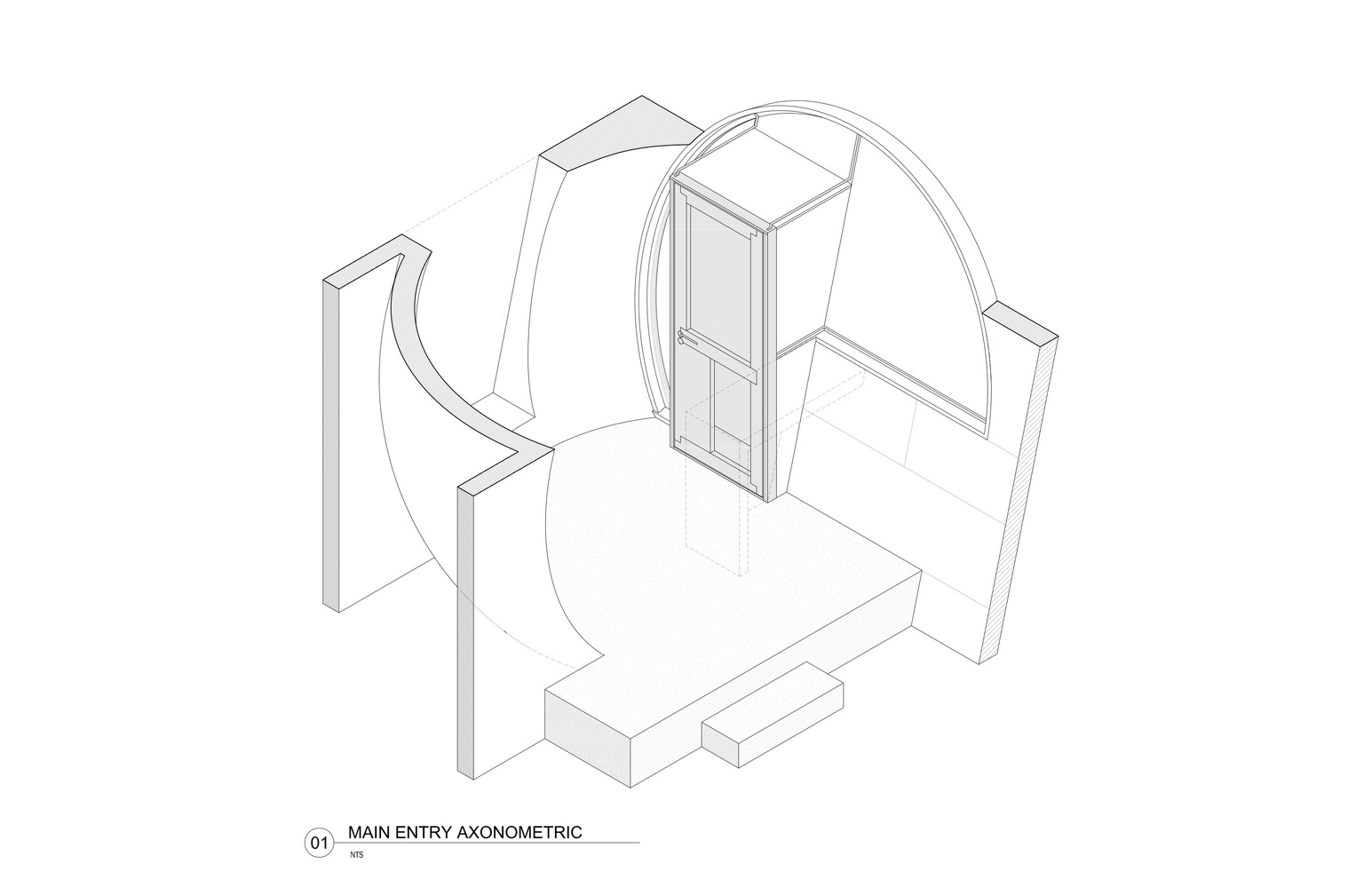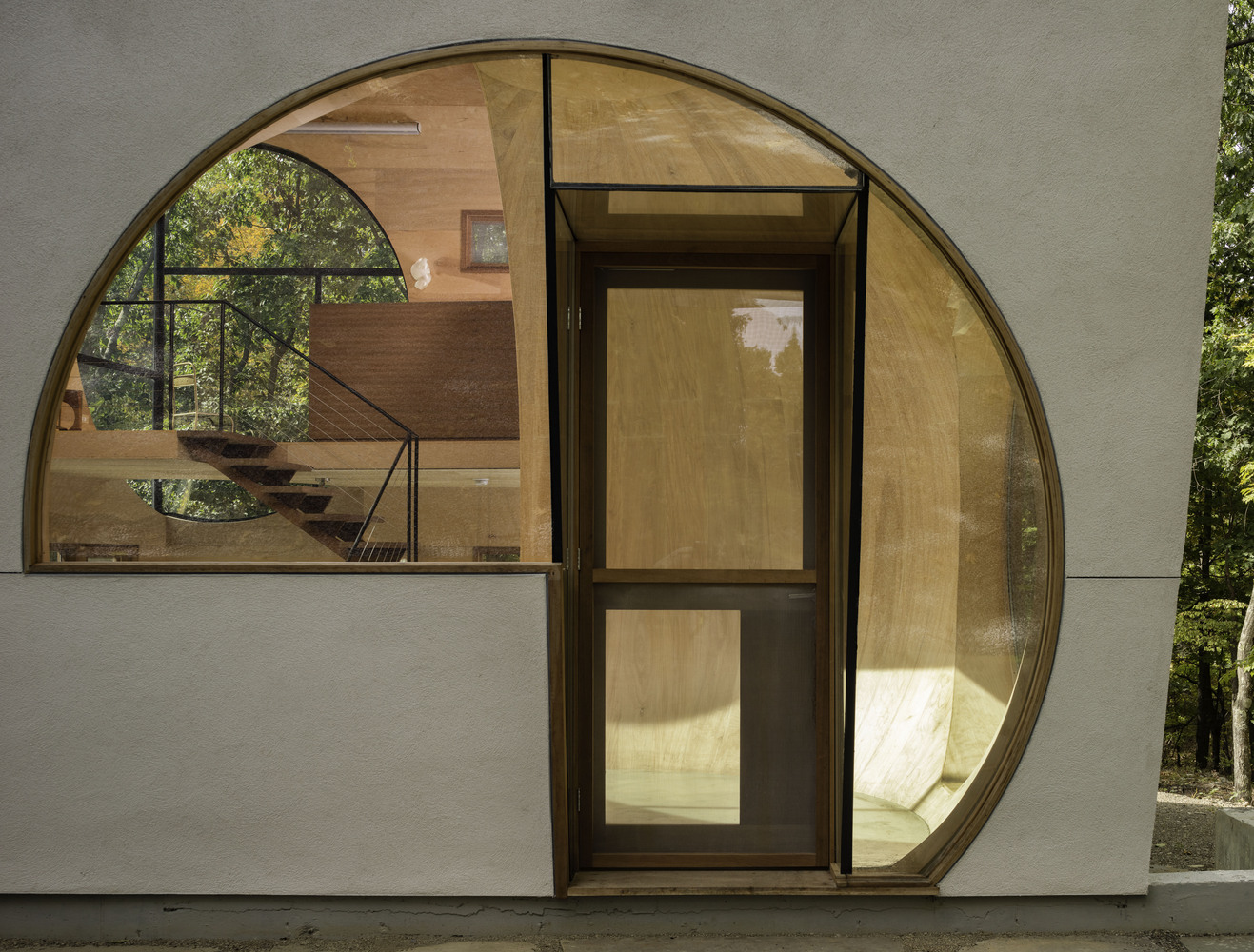 Konutun geometrik formu, kürenin iç mekanda hacimli bir alan ile kesilmesi şeklinde tanımlanmış. Mekana giriş ve iç mekanın tümünde algı yaratması için, aydınlık yüzeyler oluşturulan projede ahşap iç mekandaki hakim malzeme.