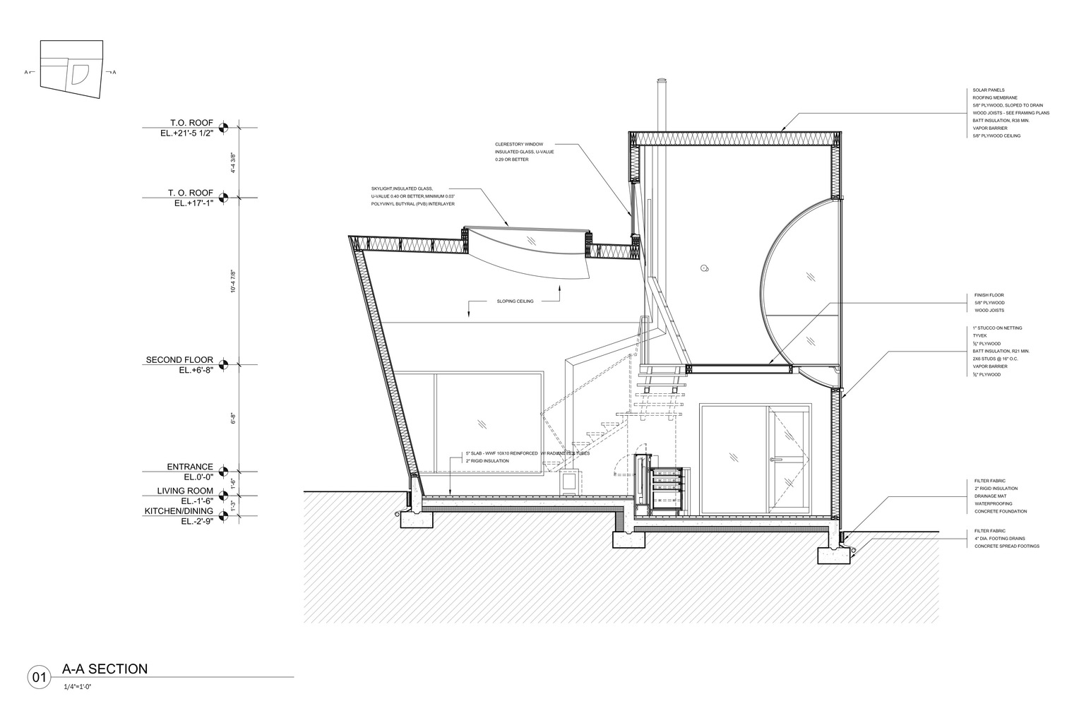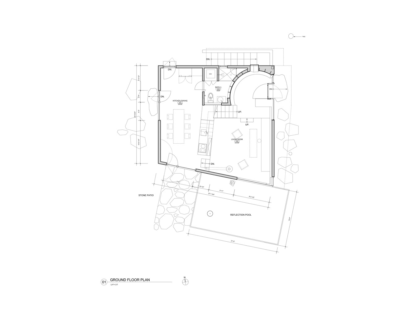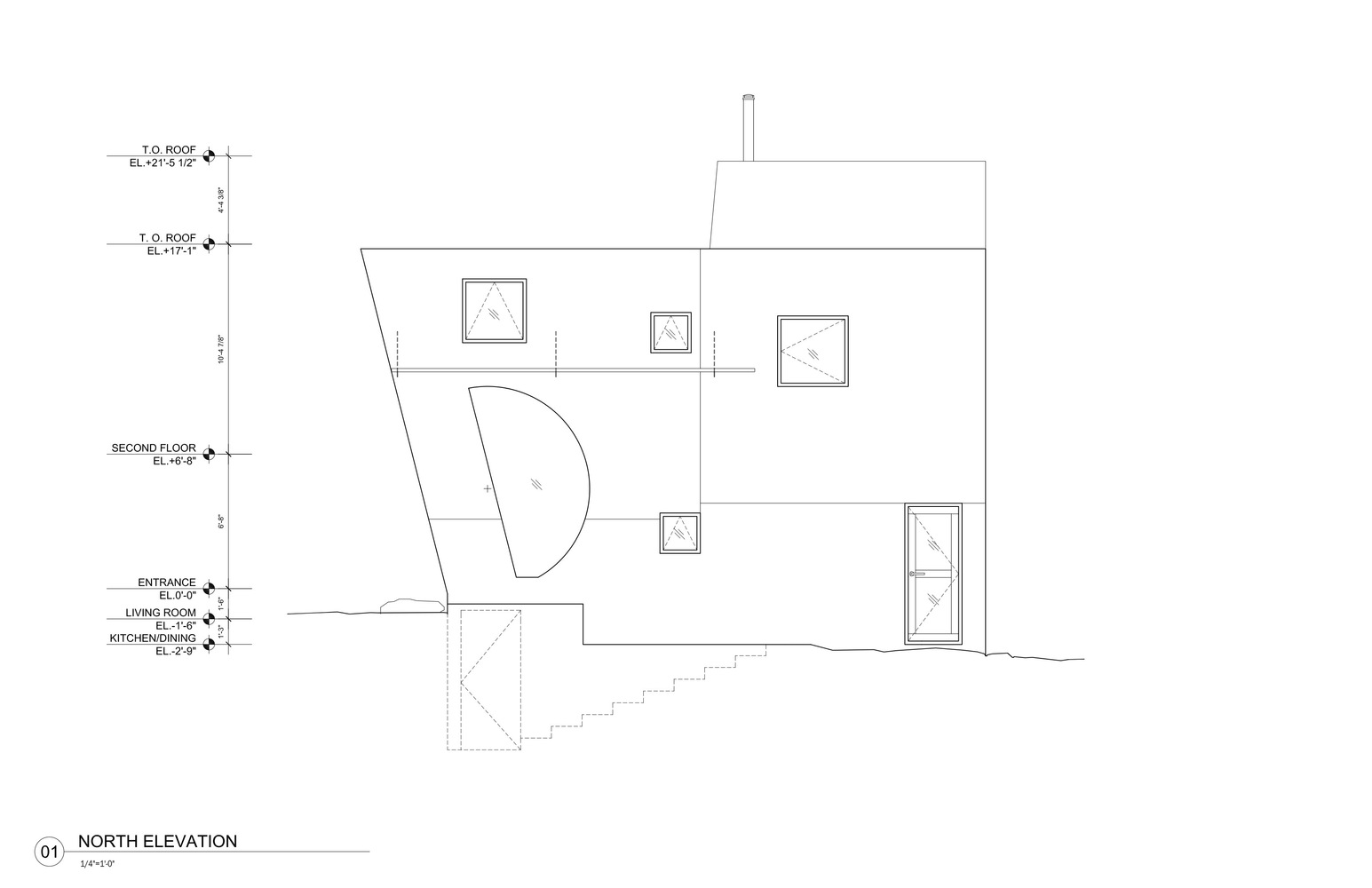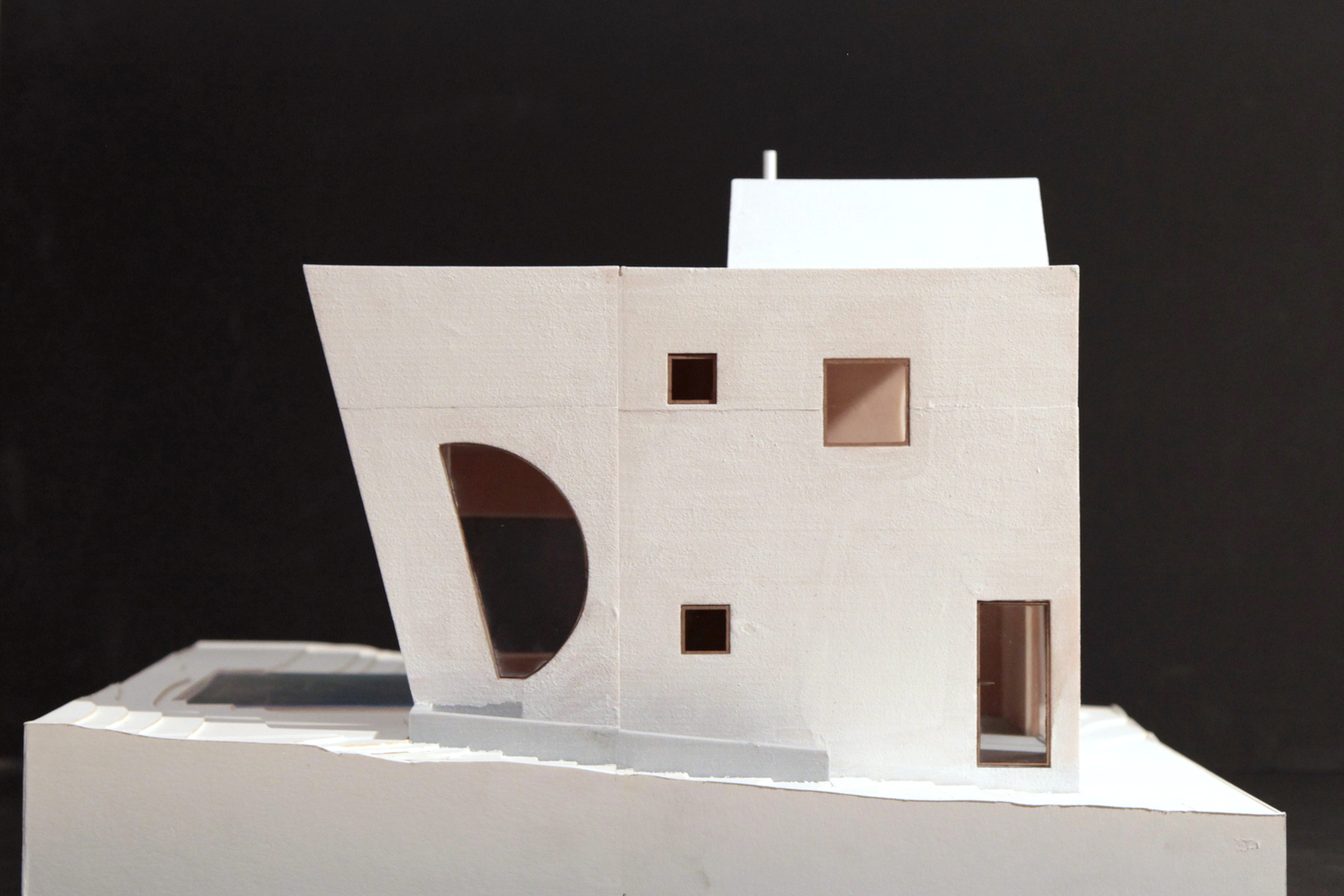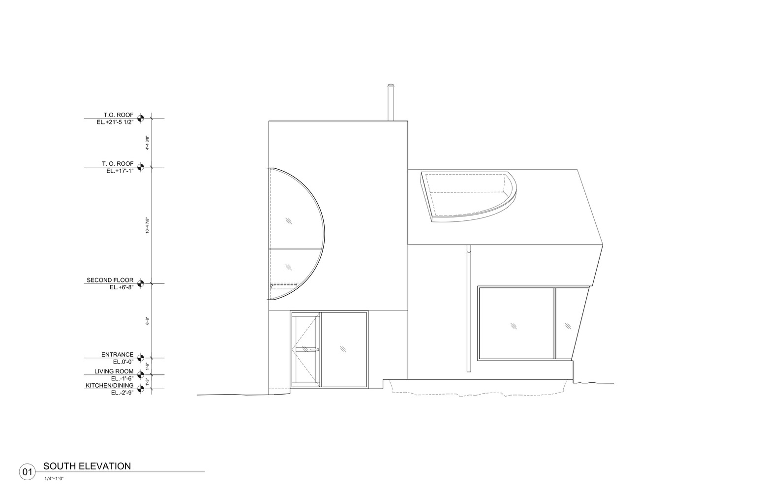 Konutun geometrik formu, kürenin iç mekanda hacimli bir alan ile kesilmesi şeklinde tanımlanmış. Mekana giriş ve iç mekanın tümünde algı yaratması için, aydınlık yüzeyler oluşturulan projede ahşap iç mekandaki hakim malzeme.