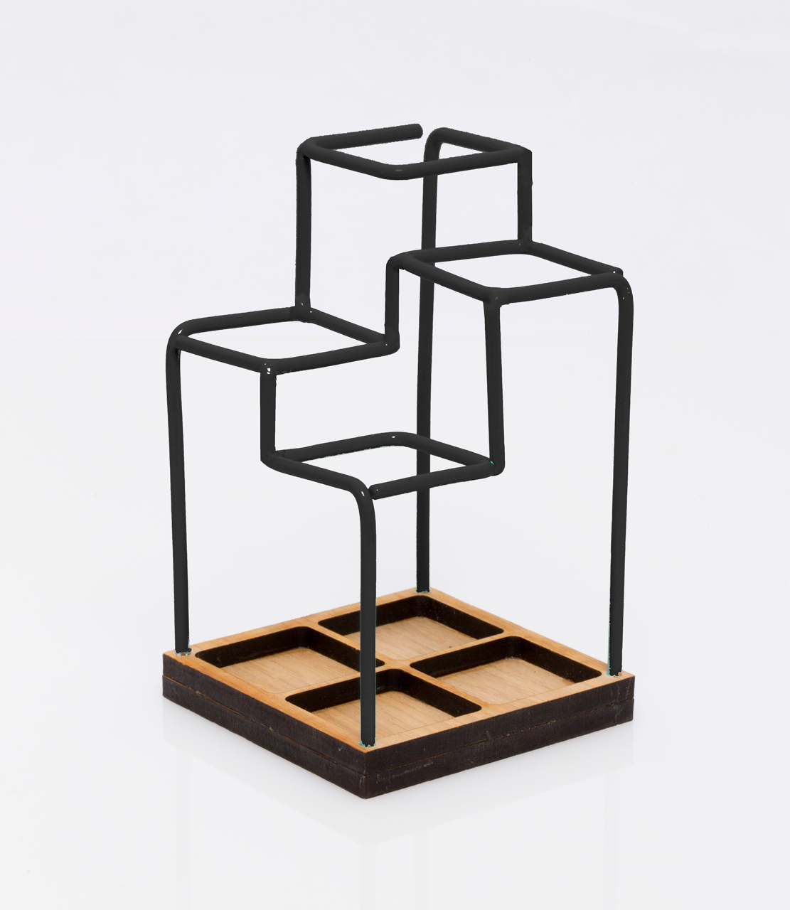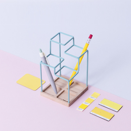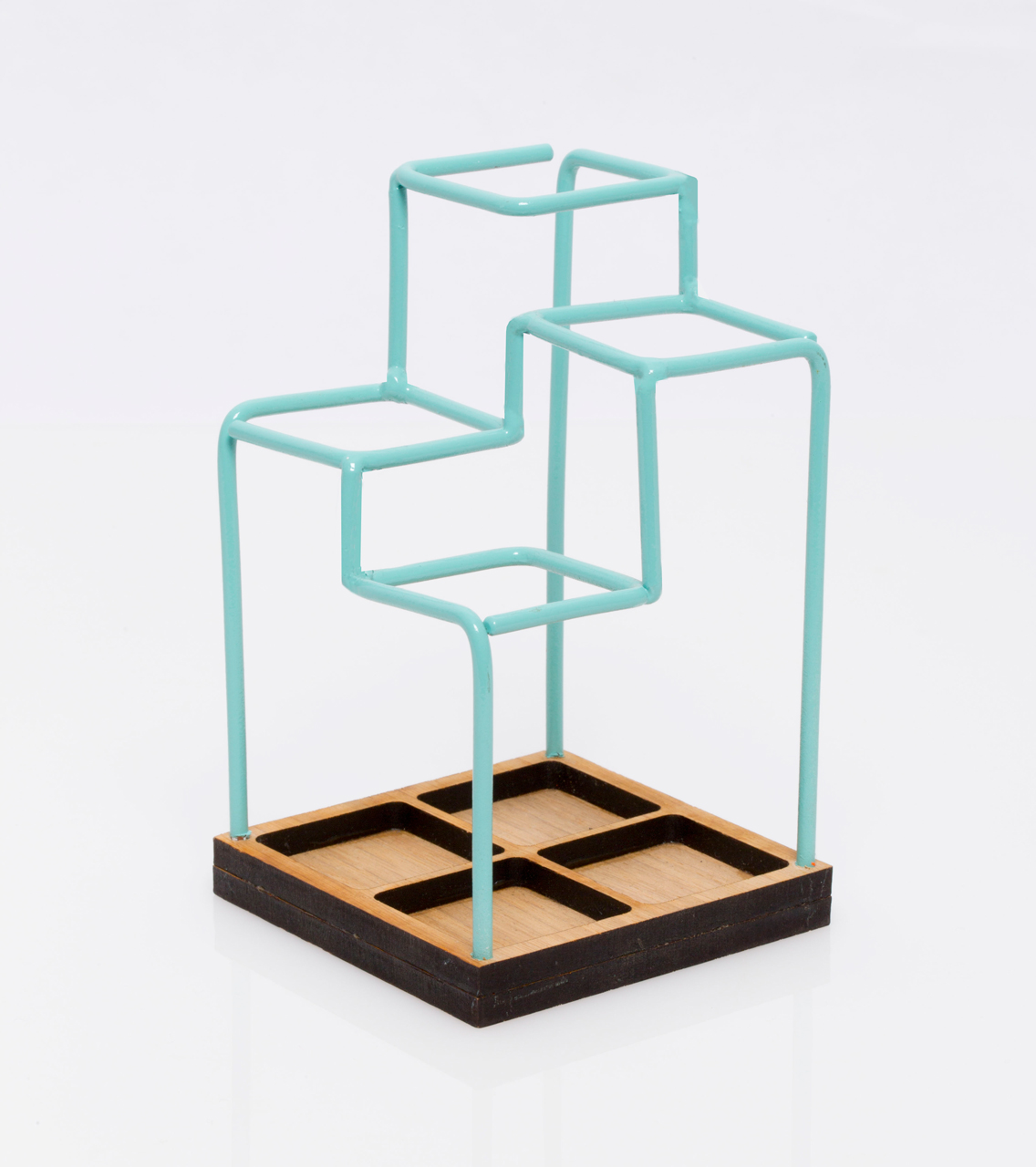 3 boyutlu bir eskiz gibi görünen bir kalemlik, Tara’nın üniversitedeyken yaptığı mimari bir çizimlere dayanıyor. Ahşap bir taban, mavi veya siyah renkte boya ile kaplanmış bir çelik kafesle desteklenir. Block tasarım stüdyosunun tasarladığı kitap tutacağı, askılıklar ve meyve kasesi de aynı konseptle tasarlanıp üretilmiş.