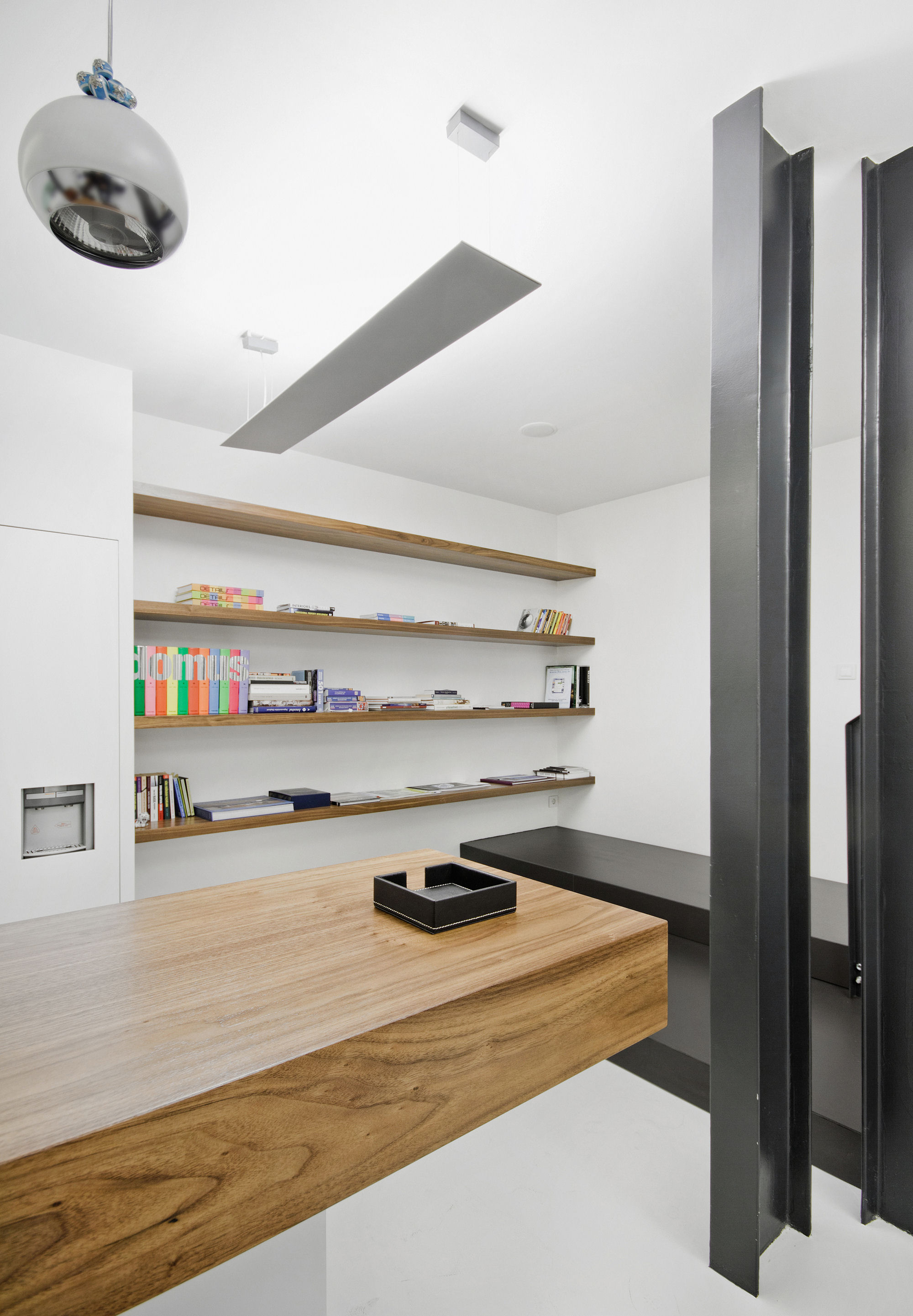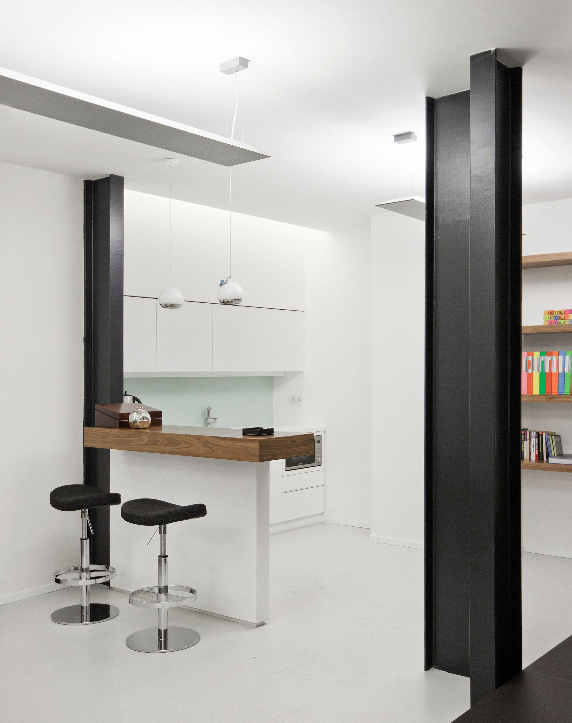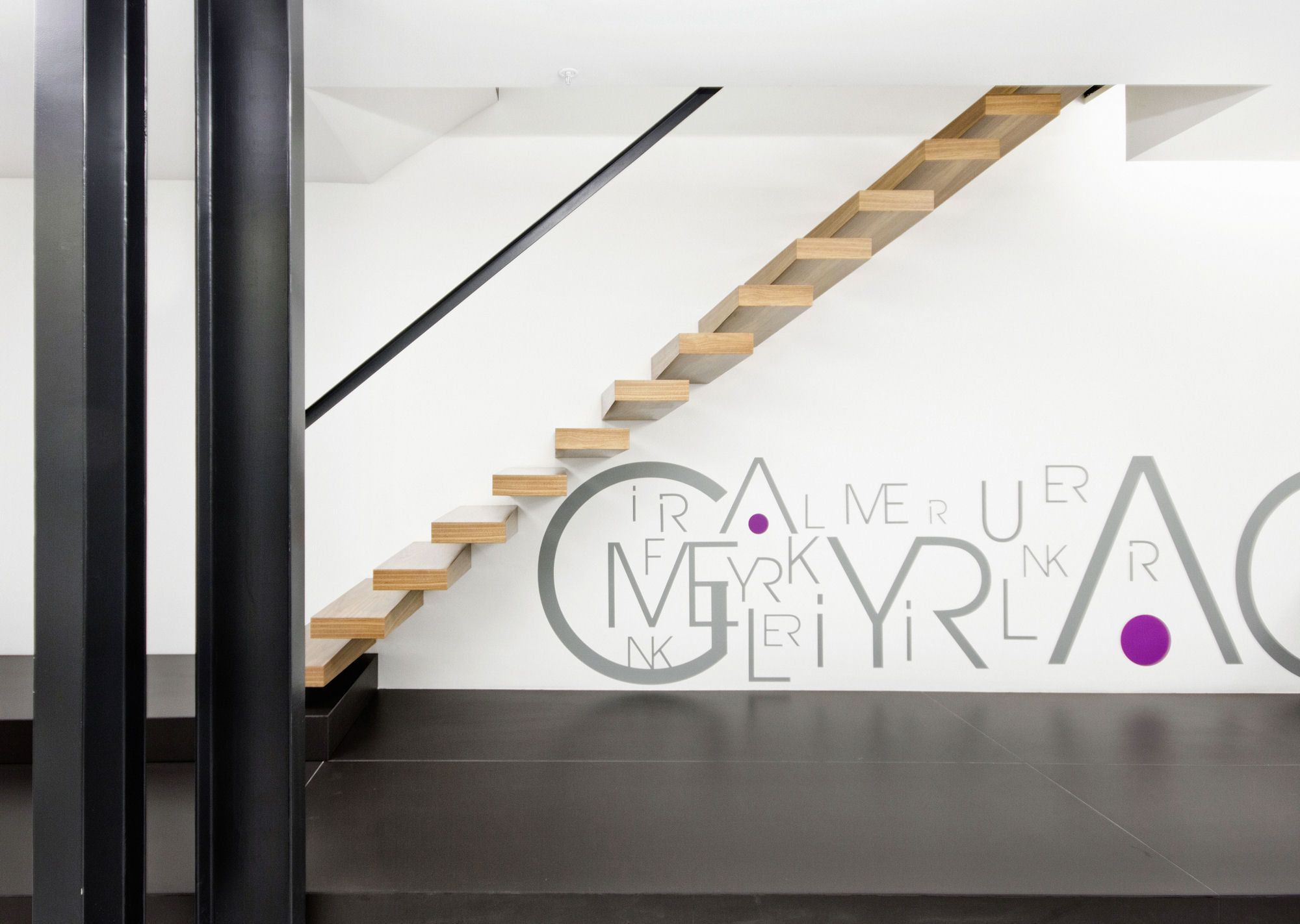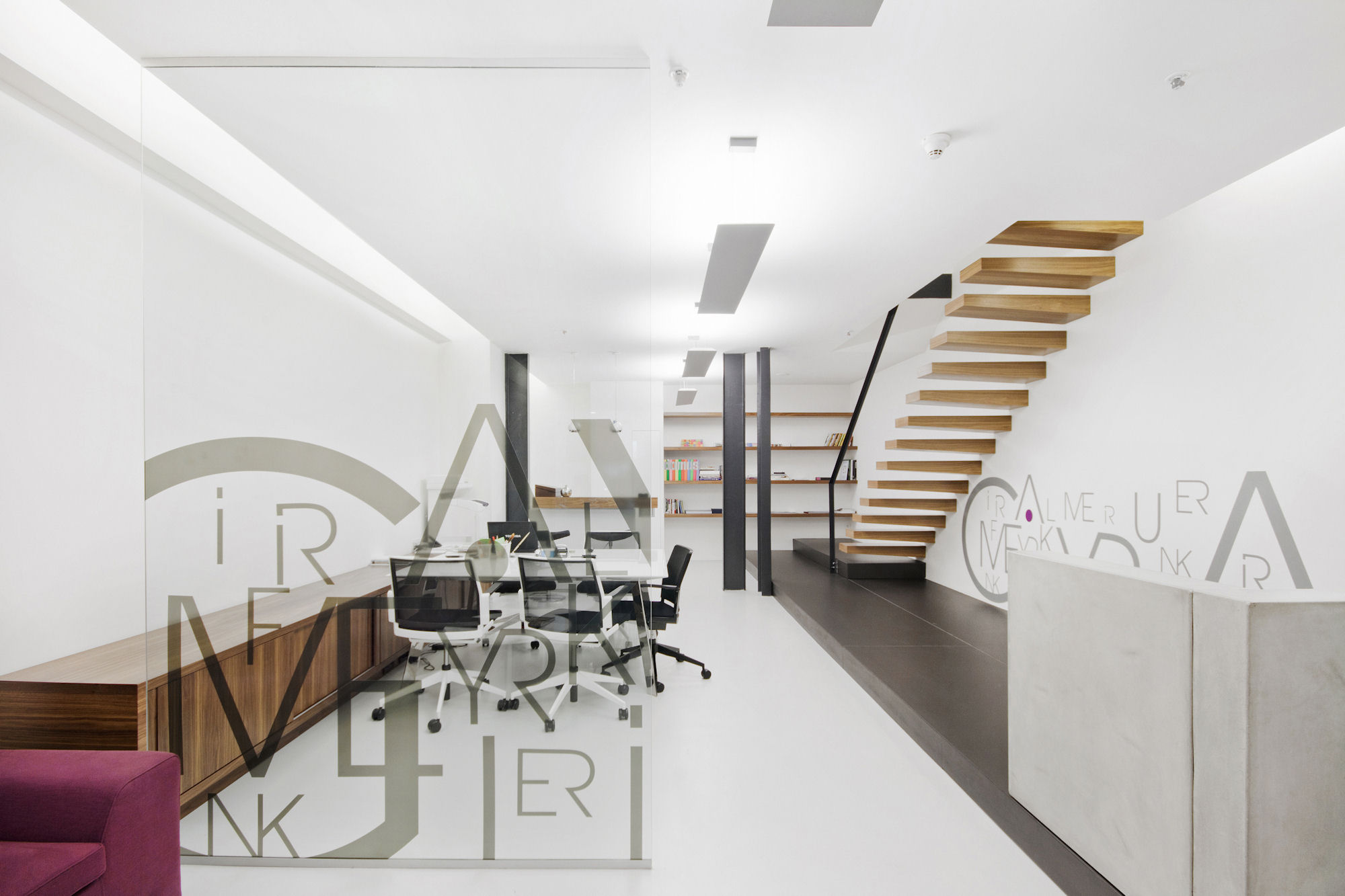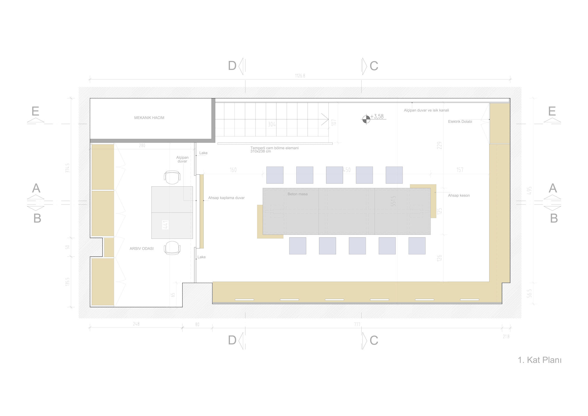 Mekana girildiğinde masif etkisiyle beton banko tarafından karşılanırsınız. Mekanın kalan hacmi ilk girdiğiniz anda okunaklıdır. Arka fonda mutfak bölgesi, hemen girişte bekleme ve orta bölümde çalışma… Merdiven duvara ankastre şekilde yukarıya doğru tırmanır. Siyah platform da bankoyu, giriş bölgesini ve merdiveni kapsayacak şekilde tasarlanmıştır. Merdivene ulaşmak için platform üzerinde iki basamak çıkarsınız. Merdivenlerden yukarı tırmandığınızda büyük (450cm*130cm) ebatlarında beton bir masanın yüzer şekilde mekanın içinde durduğunu görürsünüz. Sanki kenarlarına ilişmiş hareketli kesonların üzerinde durmaktadır beton masa. Hemen arka kısımda kayar kapılarla iki kanadından açılıp kapanabilen arşiv bölümünü algılarsınız.