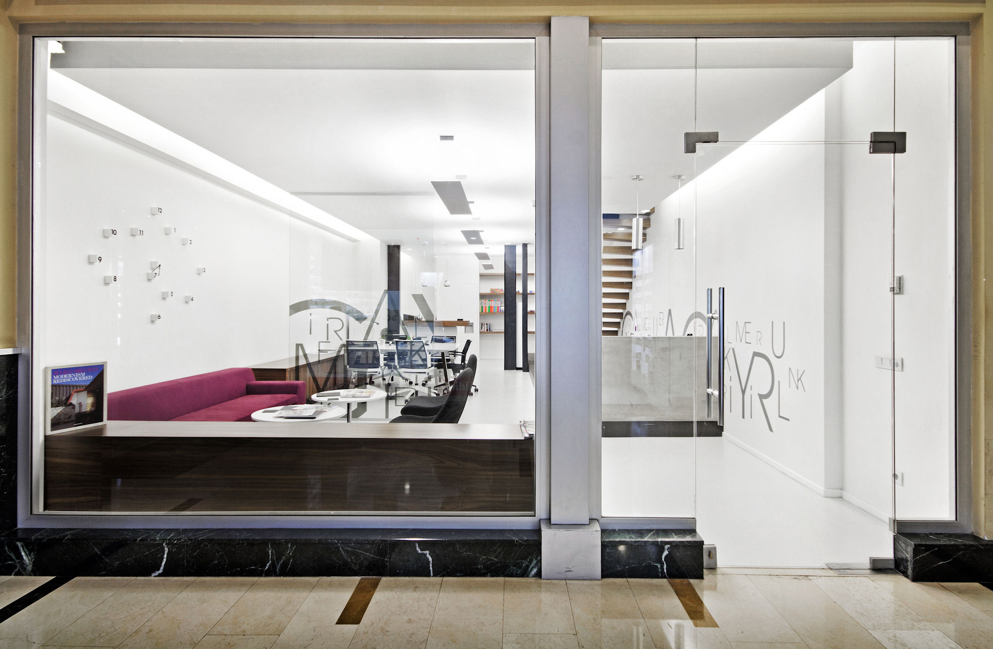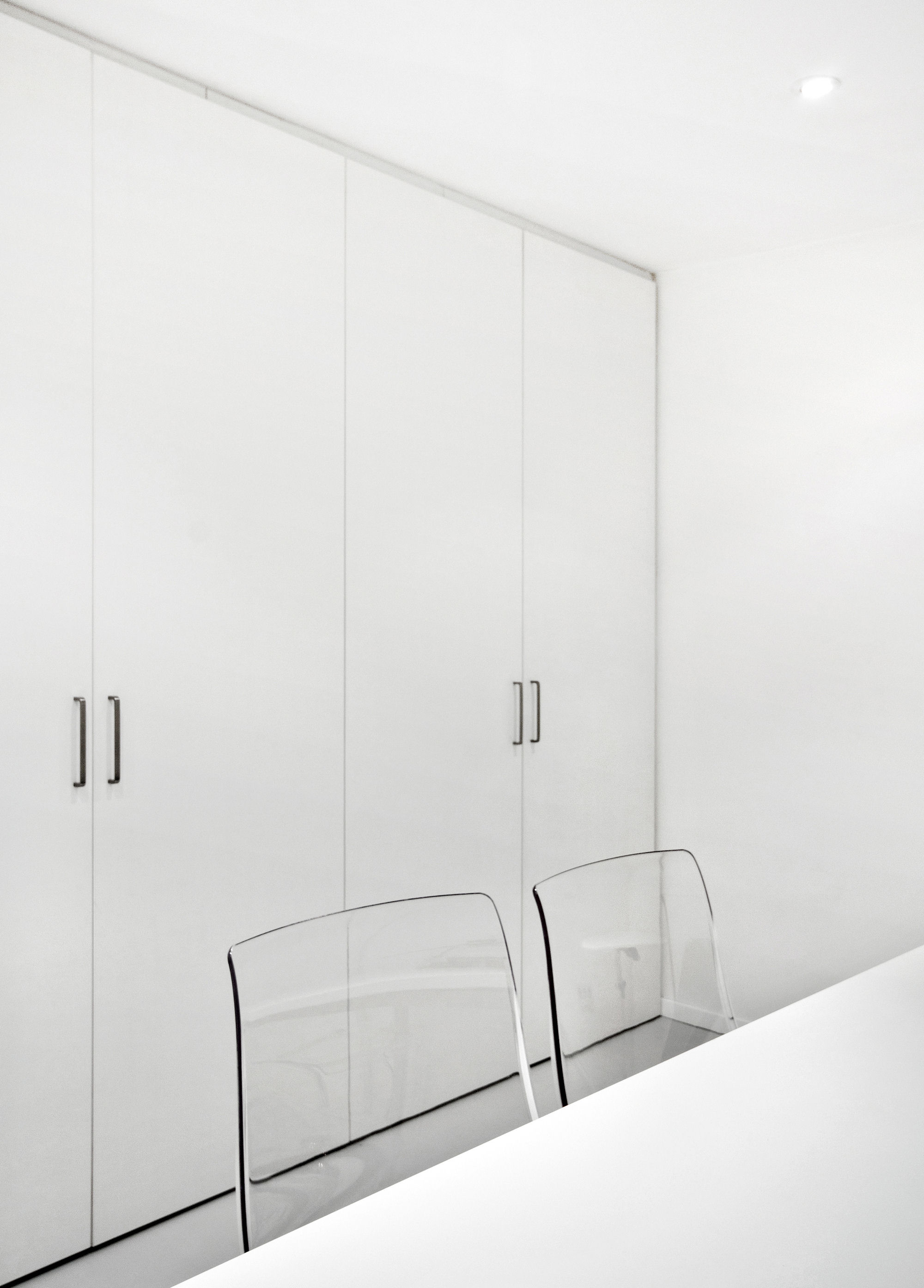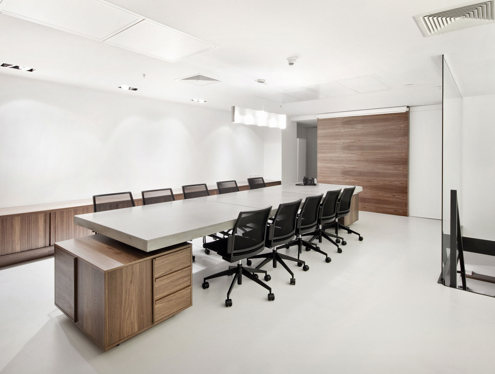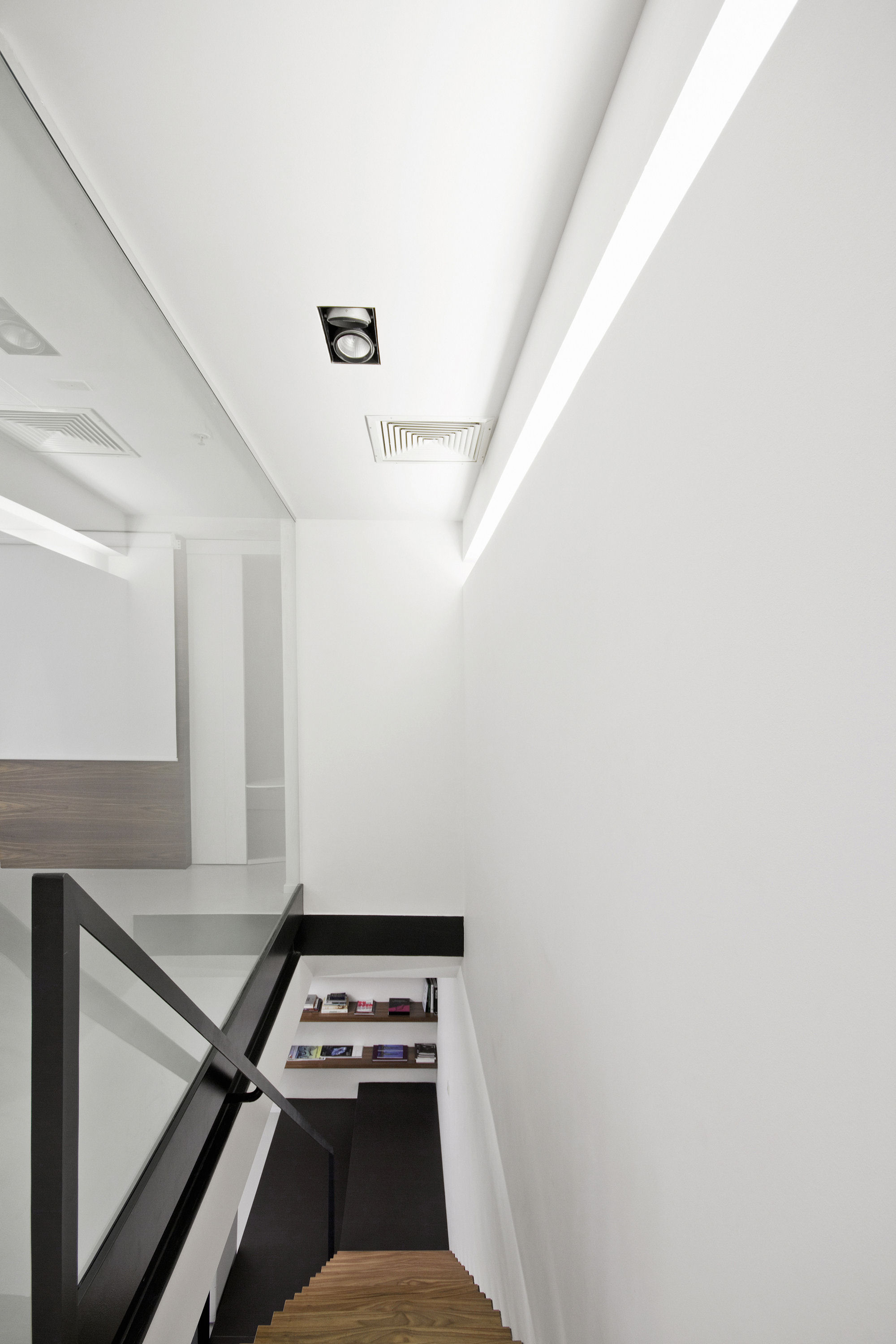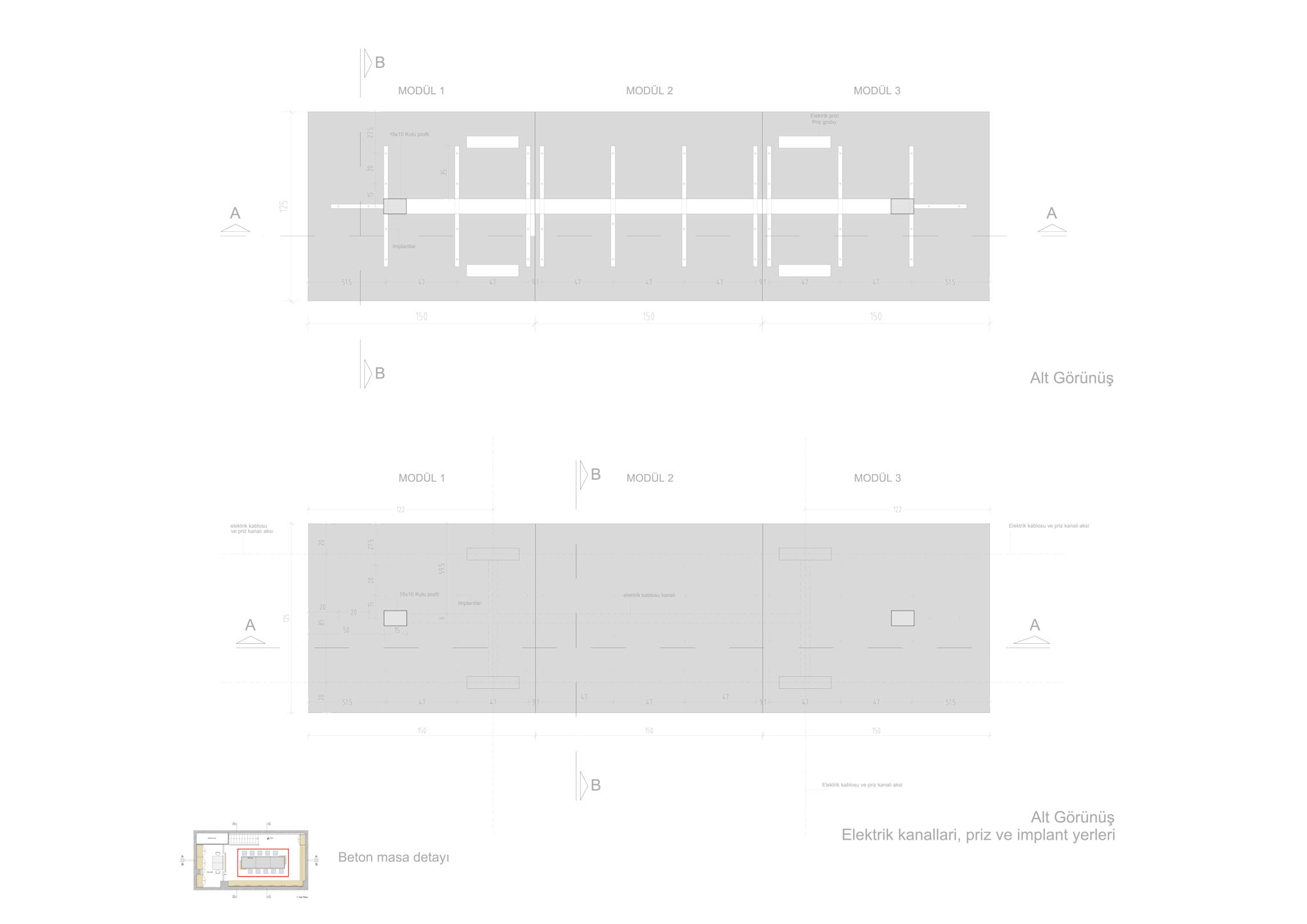 Mekana girildiğinde masif etkisiyle beton banko tarafından karşılanırsınız. Mekanın kalan hacmi ilk girdiğiniz anda okunaklıdır. Arka fonda mutfak bölgesi, hemen girişte bekleme ve orta bölümde çalışma… Merdiven duvara ankastre şekilde yukarıya doğru tırmanır. Siyah platform da bankoyu, giriş bölgesini ve merdiveni kapsayacak şekilde tasarlanmıştır. Merdivene ulaşmak için platform üzerinde iki basamak çıkarsınız. Merdivenlerden yukarı tırmandığınızda büyük (450cm*130cm) ebatlarında beton bir masanın yüzer şekilde mekanın içinde durduğunu görürsünüz. Sanki kenarlarına ilişmiş hareketli kesonların üzerinde durmaktadır beton masa. Hemen arka kısımda kayar kapılarla iki kanadından açılıp kapanabilen arşiv bölümünü algılarsınız.