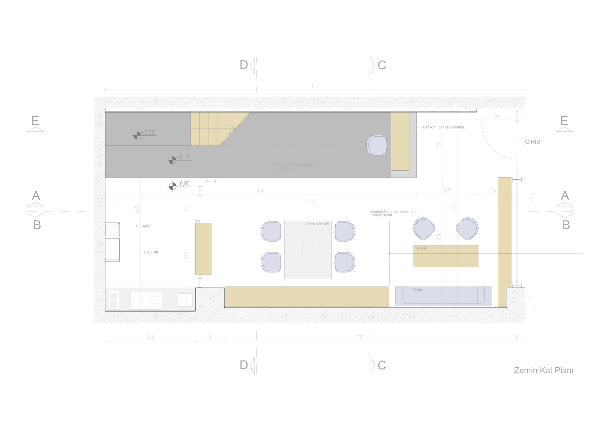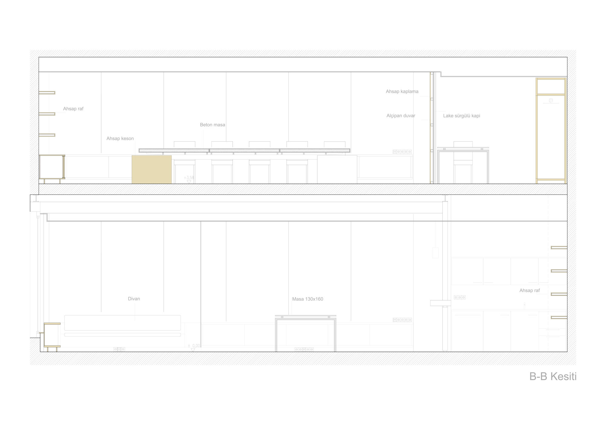 Zemin katta bölüntüsüz tek mekan algısını güçlendirecek düzenlemeler yapıldı. Giriş çalışma ve mutfak bölümü mekanın tek defada algılanabilmesini zedelemeyecek şekilde ayrıştırıldı. 1. katta yine tek bir mekan algısı hedeflendi. Arka bölümde yer alan bölünme ile ihtiyaç duyulan arşiv bölümü oluşturuldu.