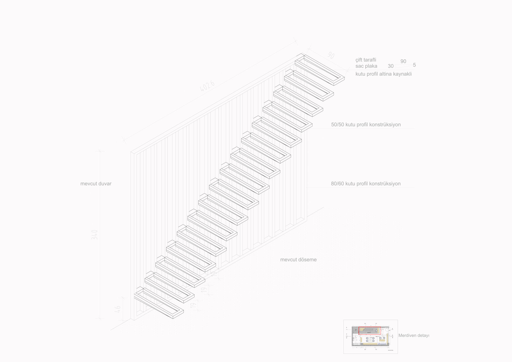 Toplam 120 m2 büyüklüğünde yapılmış bu iç mekan düzenlemesi işi ofisimiz için ‘dekorasyon’ denilen olgudan sıyrılarak, mekanı bir hacim olarak algılayabilmek ve malzemeleri doğal halleri ile tutarlı mimari kompozisyonlarda kullanabilmek adına önemli bir uygulama fırsatı olmuştur.