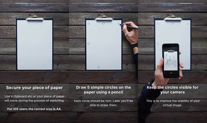 Şimdilik yalnızca A4 kağıdı ile kullanılabilen uygulama (gelecekte çeşitli tuvaller üzerinde de kullanılacak), kağıdın 5 farklı köşesine çizilen 1 cm çapında daireler sayesinde çizim yapılacak kağıdı algılıyor ve görseli kağıda ortalıyor. Bu işlem telefonun konumu değişse bile görselin sabit kalmasını sağlıyor.
