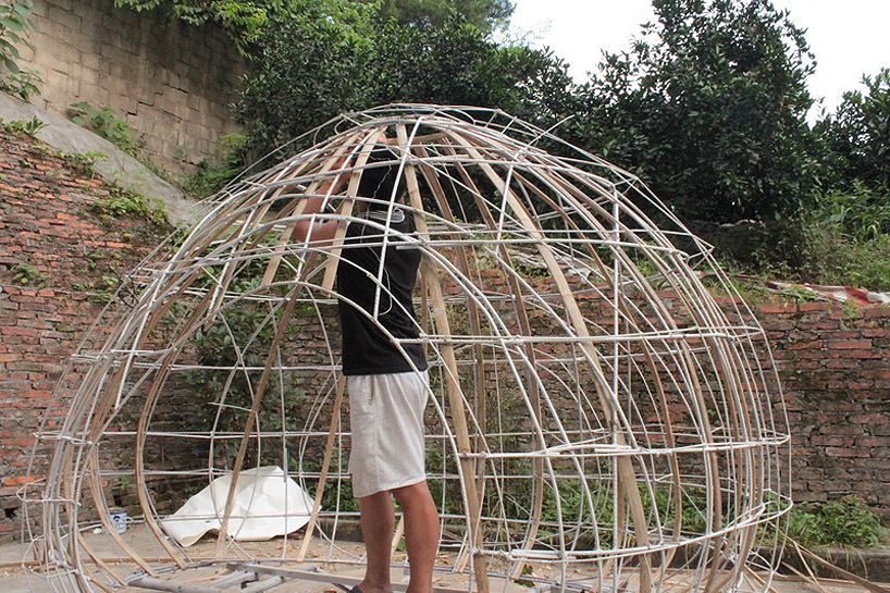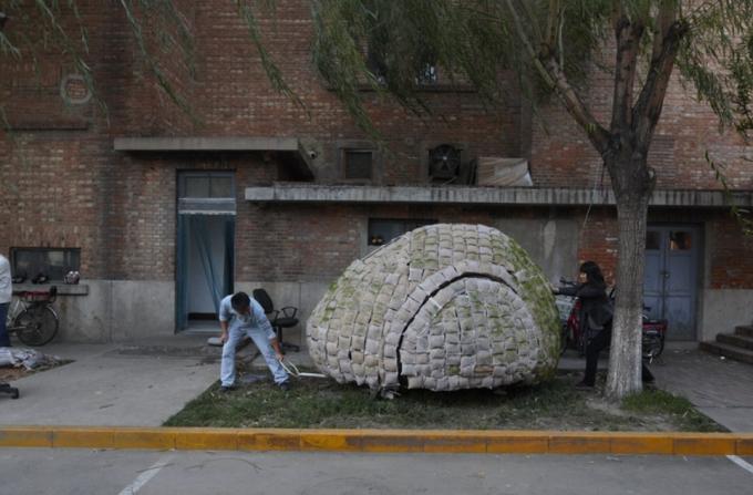 Yumurta evini bambu bir strüktür etrafında kuran Fei, strüktürü çeşitli yalıtım malzemeleriyle kaplamış ve evin kabuğunda oluşturmak istediği çim yüzey için de dış yüzeyi, çimlerin beslenebileceği talaş ve tohumlarla dolu torbalarla örmüş.