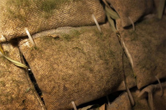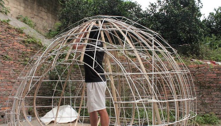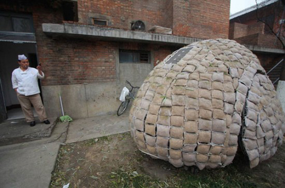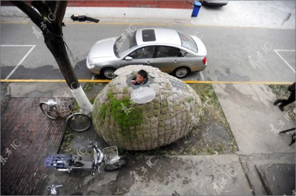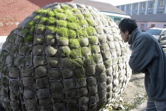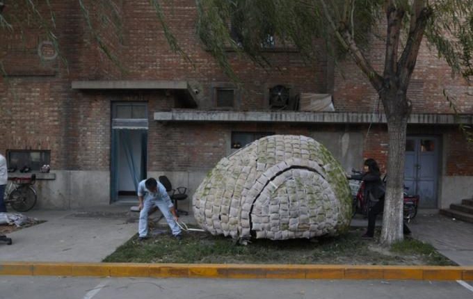 Yumurta evini bambu bir strüktür etrafında kuran Fei, strüktürü çeşitli yalıtım malzemeleriyle kaplamış ve evin kabuğunda oluşturmak istediği çim yüzey için de dış yüzeyi, çimlerin beslenebileceği talaş ve tohumlarla dolu torbalarla örmüş.