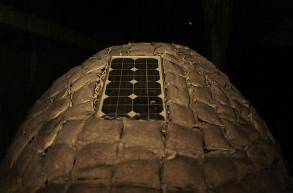 Evin içinde küçük bir lavabo, bir yatak, solar panelden enerji alan bir aydınlatma elemanı ve bir kitaplık bulunuyor.