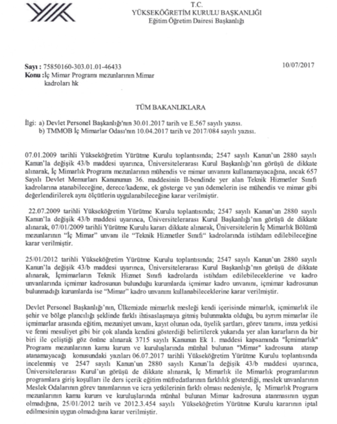 Yükseköğretim Kurulu, 06 Temmuz 2017 tarihinde almış olduğu kararla İç Mimarlık Programı mezunlarının kamu kurumlarının Mimar kadrolarına atanamayacaklarına karar verdi.