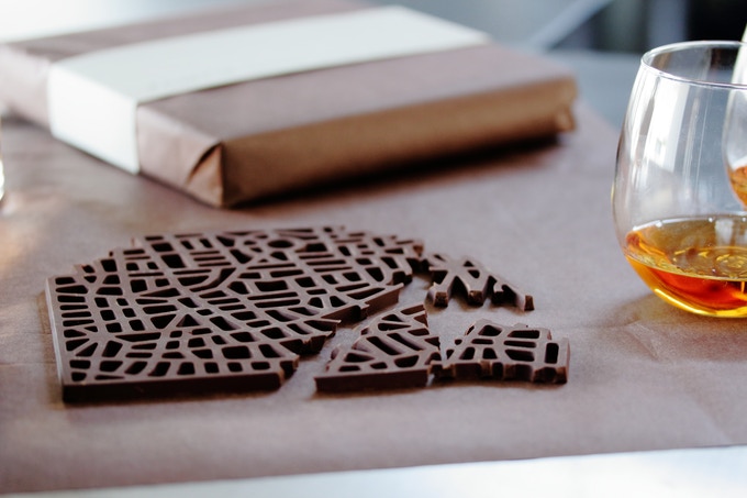 Haritalar hediye olarak hazırlanmış ve paketlenmiş ambalajlarla tamamlanıyor. Bu da, tecrübenin bir parçası. Birçok katmana gizlenmiş olan çikolatayı siz veya alıcınızı, yenilebilir şehri ortaya çıkarmak için açar.