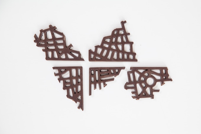 Çikolatalı şehir haritası tasarımı, açık geometrik şekiller içeren geleneksel bir Arap deseni olan Mashrabiya’dan esinlenildi. Bu stil tipik olarak mimaride kullanılsa da, bu çikolatalar için şık bir kontur üretmeyi sağlamıştır. Haritaların tasarımı tamamlandıktan sonra, çikolata dökülen bir kalıp haline getirildi.