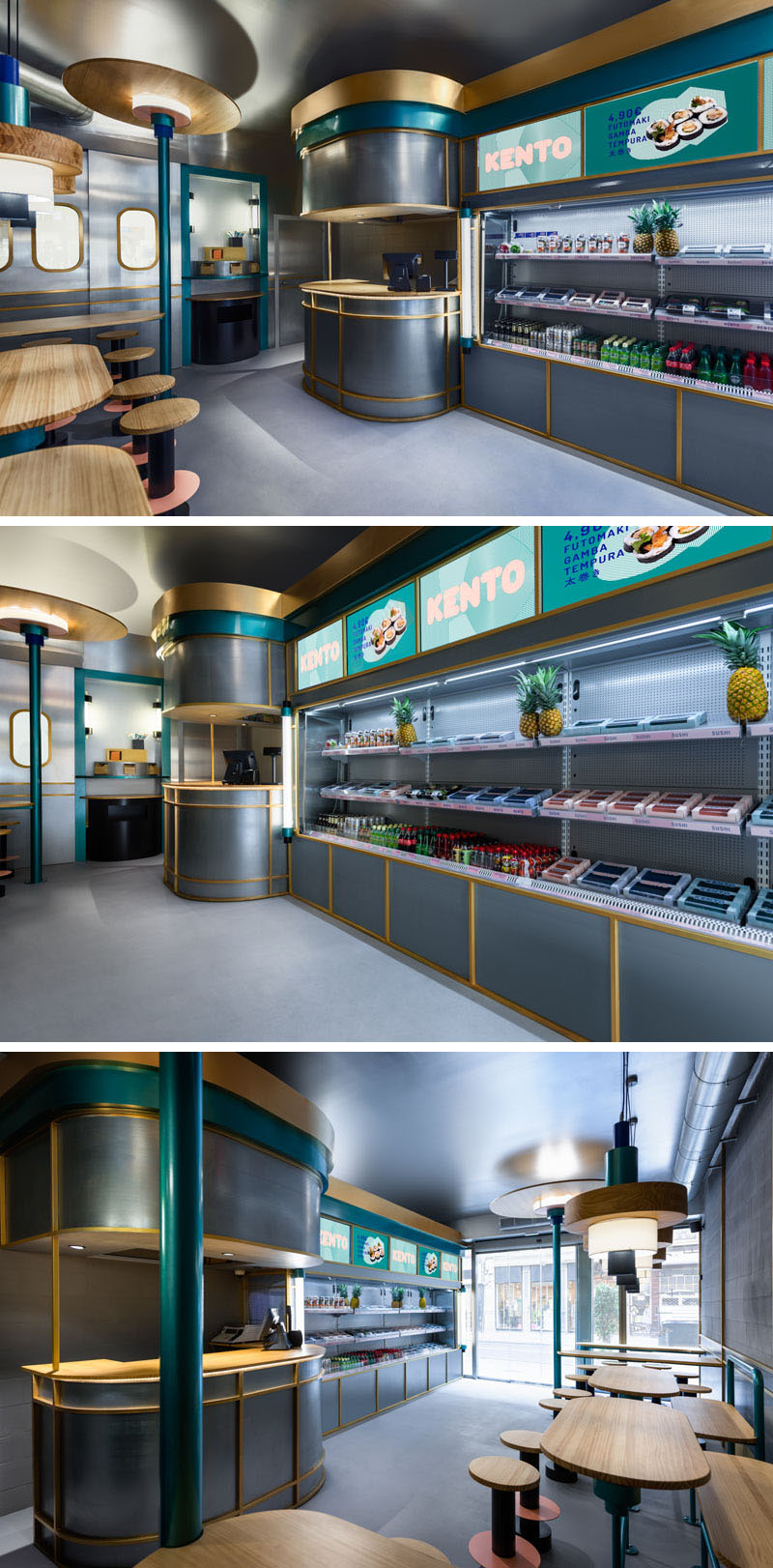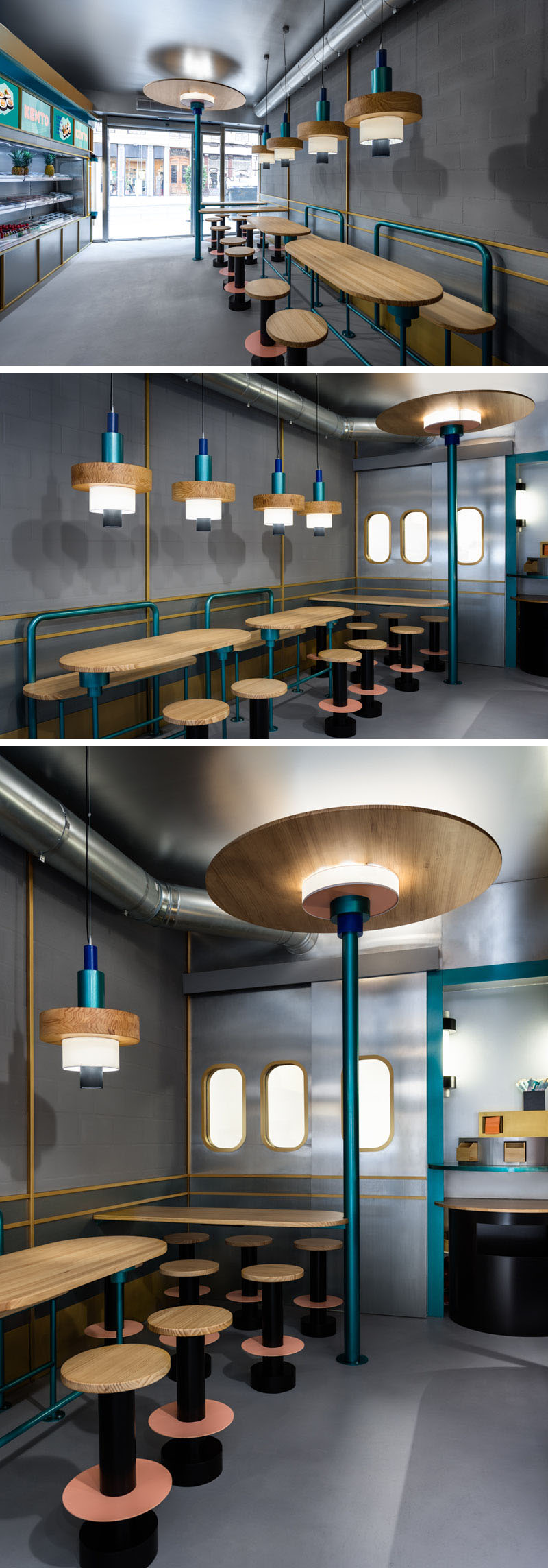 Fast-food mantığıyla işleyen restorant girişinin sol kısmında yemek yeme alanı karşısında ise servis tezgahı bulunuyor. Ahşap tabureler ve tezgahlar, oval tablolar ve ahşap elemanlarla ve aydınlatma lambaları ile birleştirilerek gri duvarlara ve metalik alana sıcaklık katmak amacıyla kullanılmış. Ve aynı zamanda tezgahın ve buzdolabının önündeki metalik tasarım öğeleri ve renkler, modern bir görünüm oluşturmanın yanı sıra karşı duvardaki endüstriyel ayrıntılara referans niteliğinde.