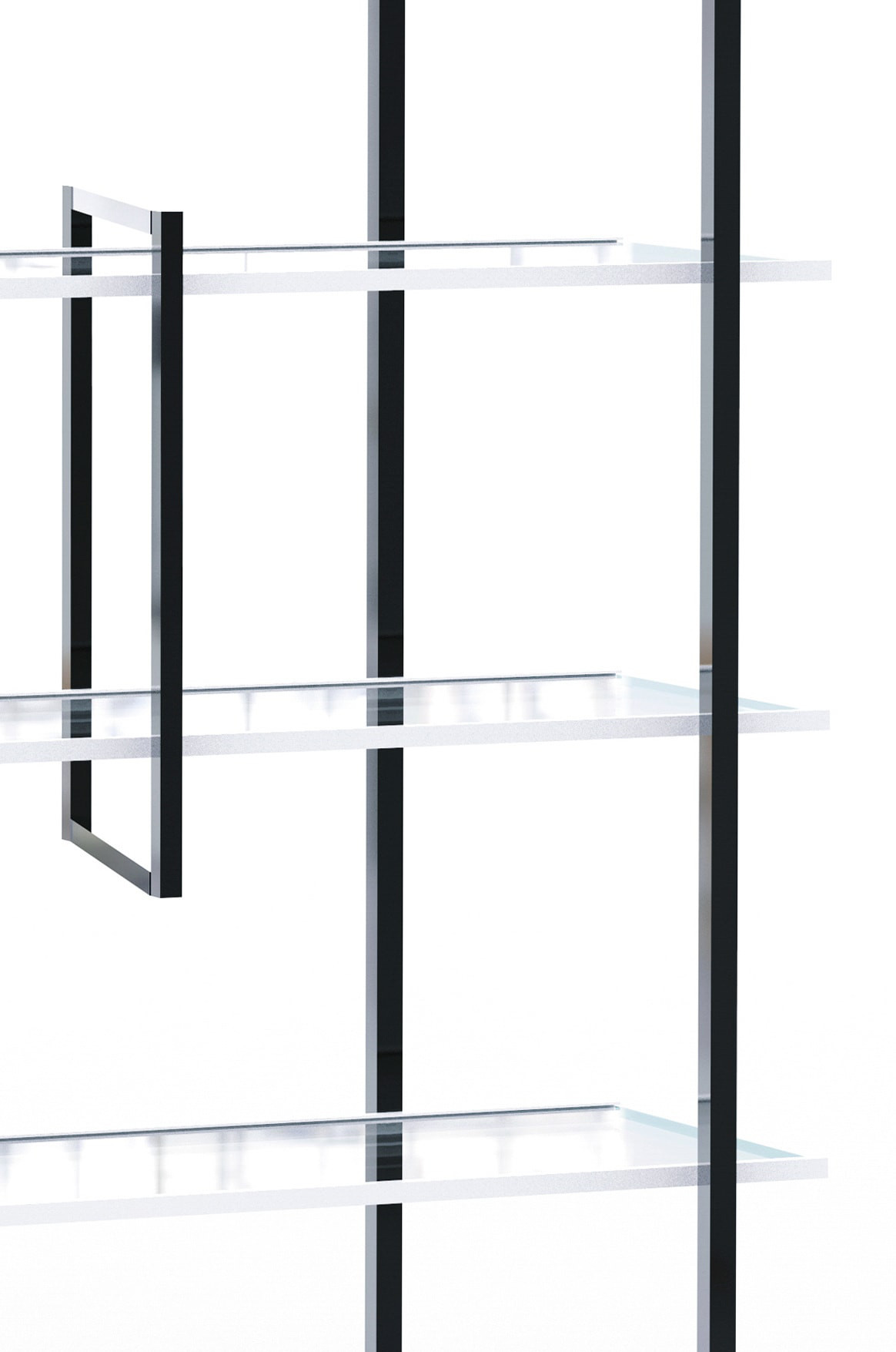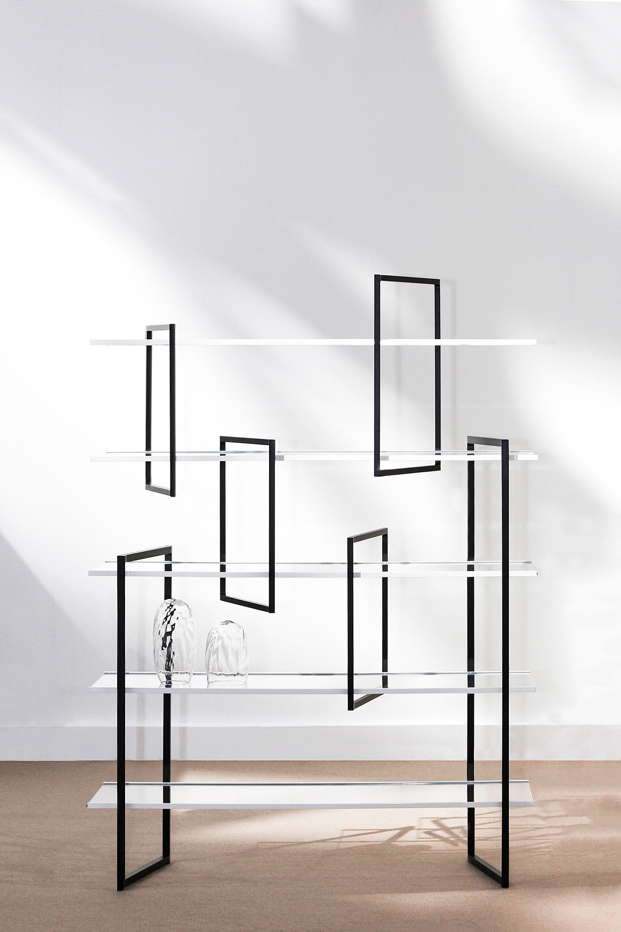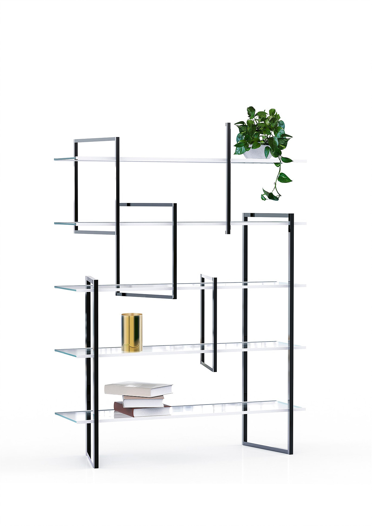 Geleneksel raf yapısı yerine birkaç unsurla tasarlanan kitaplık yapısıyla da taşımada kolaylık sağlıyor. Ayrı rafta her çerçeve diğerinden izole edilmiş gibi görünüyor ancak kendi başına tutan bir iç yapıyı oluşturuyor. Böylece karşıdan bakanlar, asimetrik düzeni sayesinde sürekli gelişen bir görüntüsünü algılarlar. Bu raf alüminyum ve camdan imal edilmiştir.