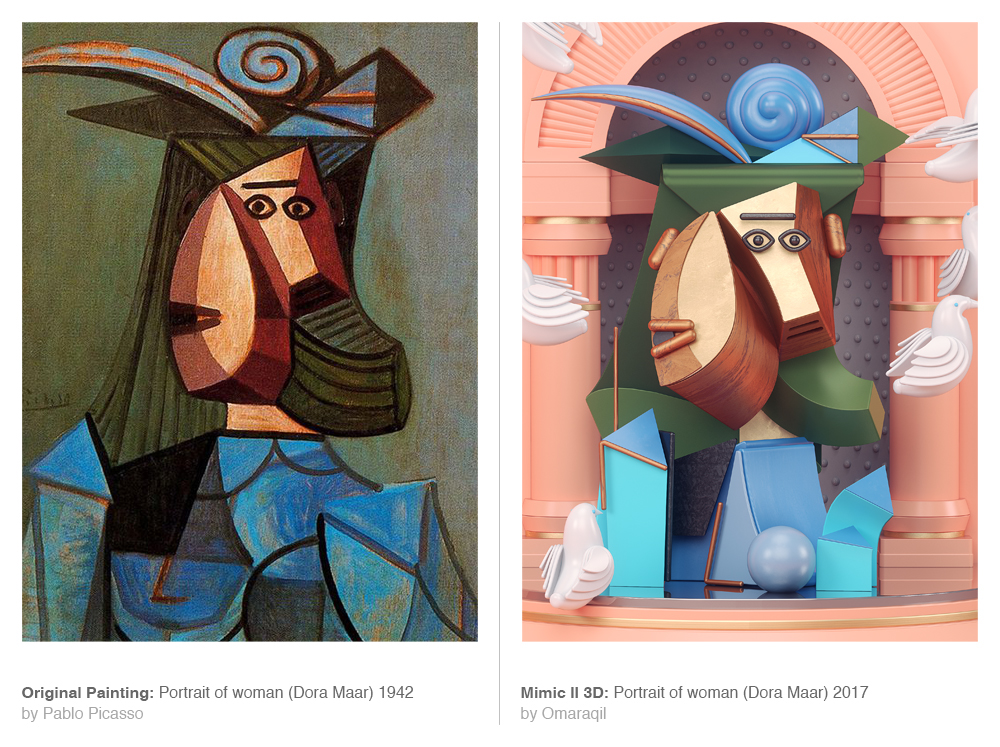 Tipografi tasarımı, illüstrasyon ve grafik tasarımı konusunda uzman olan Pakistanlı sanatçı Omar Aquil, Pablo Picasso’nun seçilmiş eserlerini alarak onlara 3 boyutlu bir görsel olarak yeniden tasarladı. Sanatçı yeni bir görsel deney dizisi olan MIMIC adlı son eserini sergiliyor.