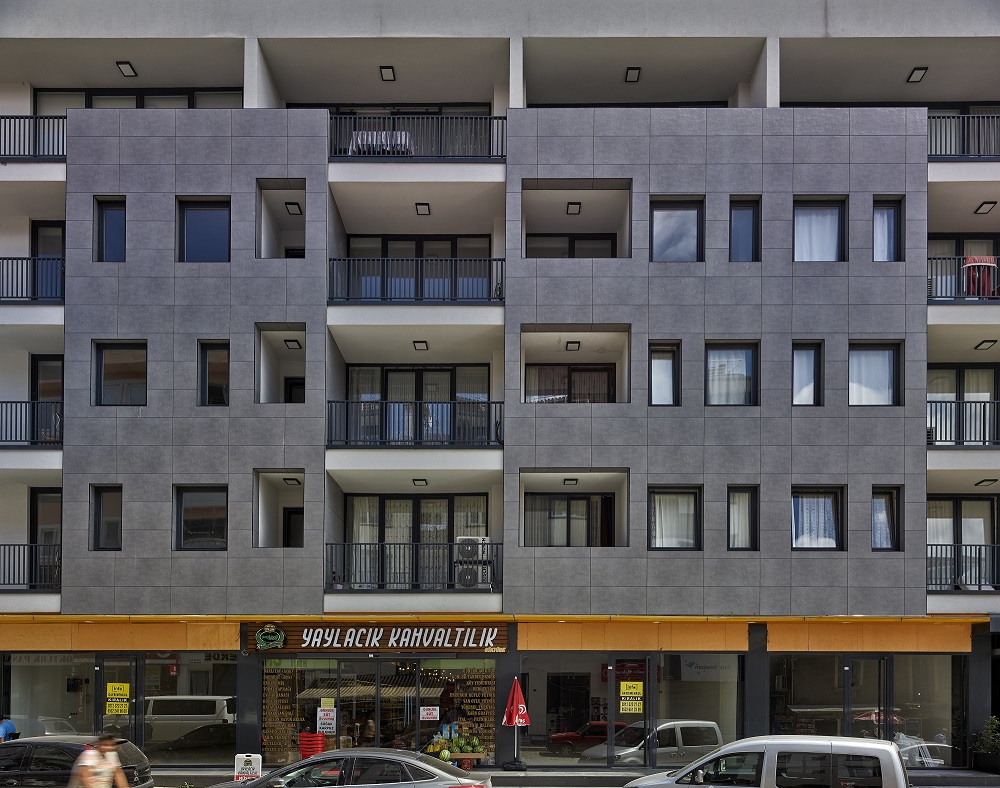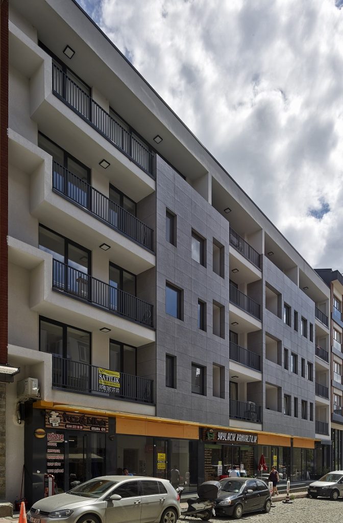 CM Mimarlık’ın imzasını taşıyan GKT 110-7 projesi, İstanbul Göktürk’te yer alıyor. Arsası, birbiriyle ilişkisi olmayan ve aralarında 6 metre kot farkı bulunan iki yol arasında yer alıyor. Tasarım ekibi, bu arsaları birbirine başarılı bir şekilde entegre edebilmiş. Mimarlar, arsanın iki yönden bitişik nizam olması ve açık olan kısımlarda yer alan yollar ile arasındaki mesafesinin iki taraflı konut kurgusu için fazla olması nedeniyle yapıyı ikiye ayırmış. Açılan mesafeyi de bir artikülasyon yapısı olarak yatay ve düşey sirkülasyonlara ayırarak buraya bakan mekanların ışık alması için irrasyonel eğrisel kurguda parçalamış. Ortak kullanıma açık bir çatı terası mevcut. Bulunduğu konum itibariyle de zemin kotunu ticari işlevlere ayırmışlar. Bu yapı için; içi boşaltılıp çıkartılmış bir apartman projesi diyebiliriz.