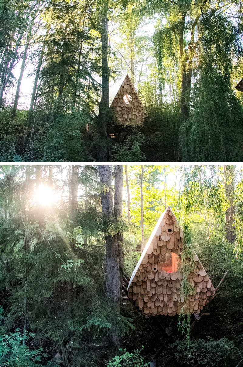 Kuş evi tasarımı bitmiş haliyle çevresindeki ağaçlara ve doğaya oldukça uyum sağlıyor. Kulübenin dış cephesinde, 12 adet kuş evi inşa bulunuyor ve Columbia Vadisi’nin dağlarında yaşayan yerel kuşların ağaç evine insanların dışında da ev sahipliği yapması sağlanıyor. Kulübenin bir ucunda kapıya uzanan küçük bir köprü ve sundurma bulunuyor. Kulübe zeminden 20 metre yükseklikte zirveye sahip bir ağacın dallarında oturuyor ve yere olan uzaklığı 9 metre. İç mekan iki kişinin rahatça kalabileceği büyüklükte.Kulübe malzemeleri yakınlarda yangın yüzünden mahvolmuş bir ormandan beslenen çamlardan yapılmış. Kulübe için platform ve kaplama eski bir kabin güvertesinden alınan levhalarla yapılırken açık 8mm polikarbonat paneller çatıyı oluşturuyor ve böylece iç mekan güneş yoluyla ısıtılmış oluyor.