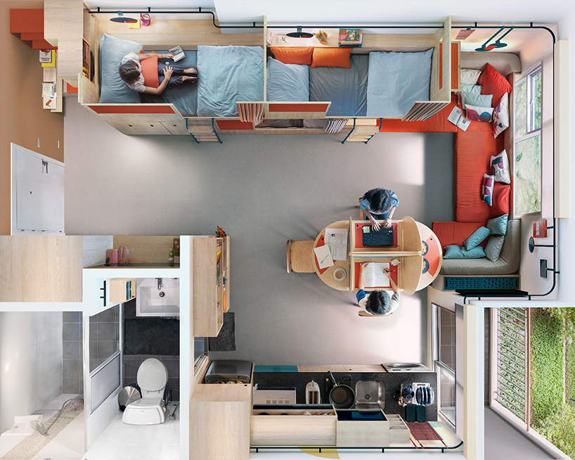 Space scholarship; Tayland’da lider bir konut geliştiricisi AP public company limited tarafından başlatılan kurumsal sosyal sorumluluk girişiminin bir parçasını oluşturuyor. Aynı zamanda çalışma Bangkok’taki birkaç apartman dairesinin iç şemasını tasarlamak amaçlı başlatılmış. Firma, birlikte yaşama felsefesi hakkında geniş çaplı araştırmalar yapmış ve çeşitli ölçekler, ayrıntılar, malzemeler ve renkler yoluyla ‘toplumsal örtüşme’ fikrini yansıtmaya karar vermiş. Esneklik ve işlevsellik aynı zamanda genel tasarım düşüncesinin önemli noktalarını temsil ediyor. Apartman içi iki farklı şekilde işleyebiliyor; öğrencilerin birlikte yemek yemeyi, sohbet etmeyi ya da mahremiyet eğitimini öğrenmelerine bağlı olarak açık olarak veya kapalı olarak kullanımı üzerine. Boş alanların verimli kullanılması, gizli depolama sistemleri, taşınabilir ve uyarlanabilir unsurlar ve pratik mobilyalar, öğrencilerin organize bir daire tasarlamasına oldukça yardımcı olmuş. Çok amaçlı, modüler elemanlardan faydalanan öğrenciler, küçük alanları değerlendirerek mekandan maksimum verim almayı başarmışlar.