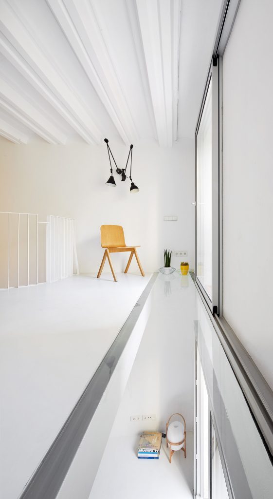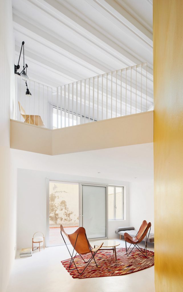Raul Sanchez Architects ‘in imzasını taşıdığı, Barselona’da yer alan 8 katlı bir apartmanın ilk iki katının, merkezinde tasarlanan iki kübik hacim ile birbirine bağlandığı bu konut projesi; her biri 55 metrekarelik iki hacmin birinde merdiven çözülmesiyle beraber tek bir yaşam alanı haline getirilmiş. İki ayrı daire işverenin isteğiyle tek bir daire haline getiriliyor, tasarım ekibi de üst katı asma kat olarak tasarlıyor. Açık mekan çözümlemeleri yapılıyor.