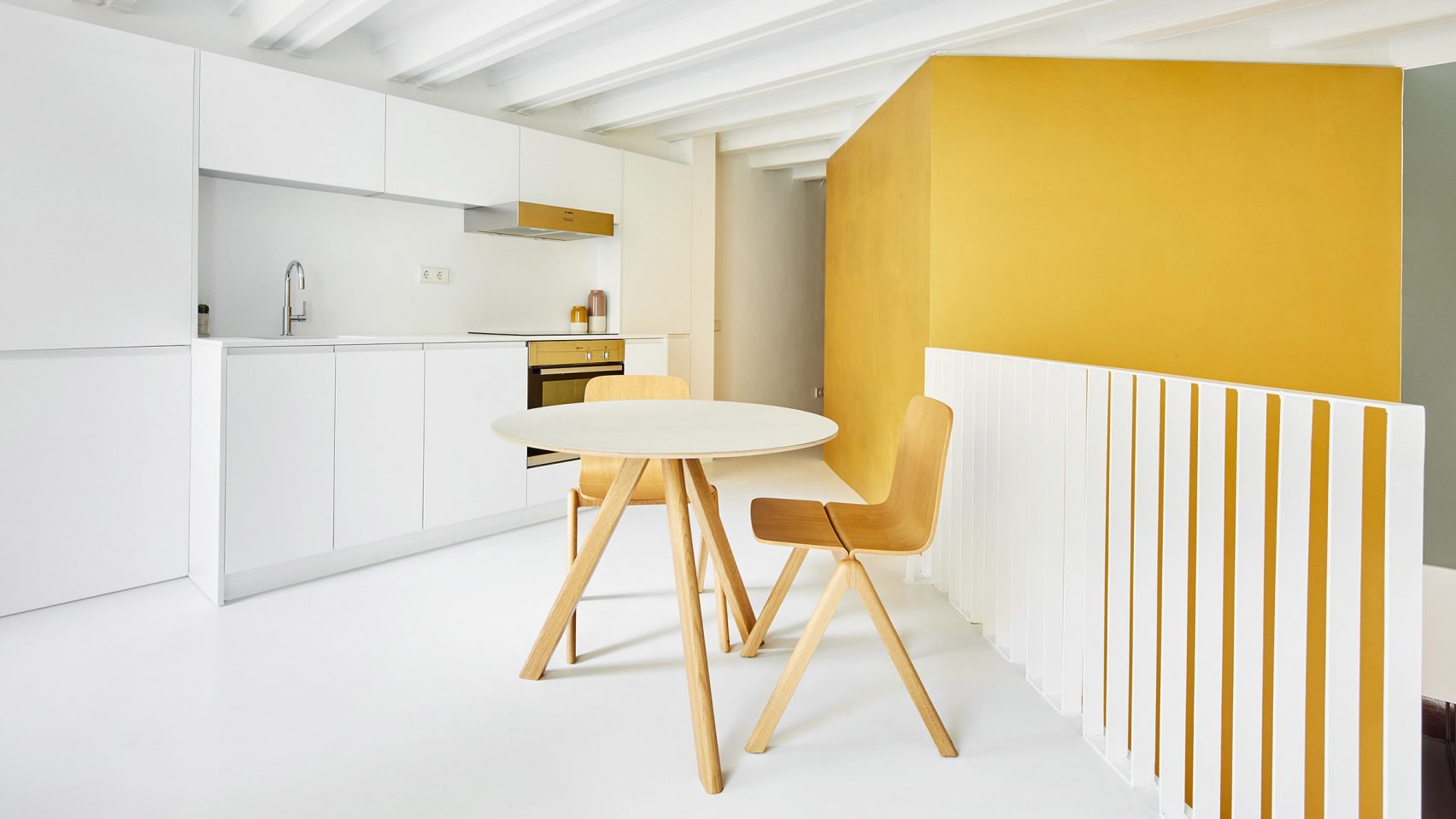 Beyaz renk paletinin hakim olduğu yaşam alanında, üst katta mutfak, yemek alanı, banyo ve kübik hacim içinde yatak odası yer alıyor. Daha çok çalışma alanı olarak kullanılan zemin katta ise bu sarı hacim banyo olarak kullanılıyor.