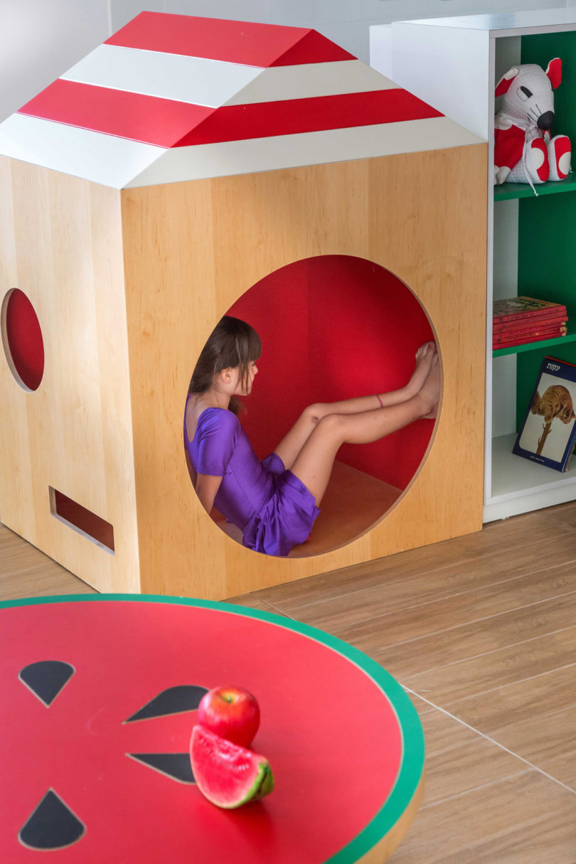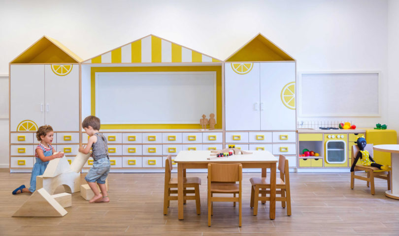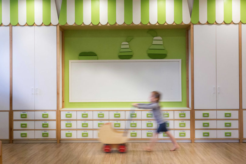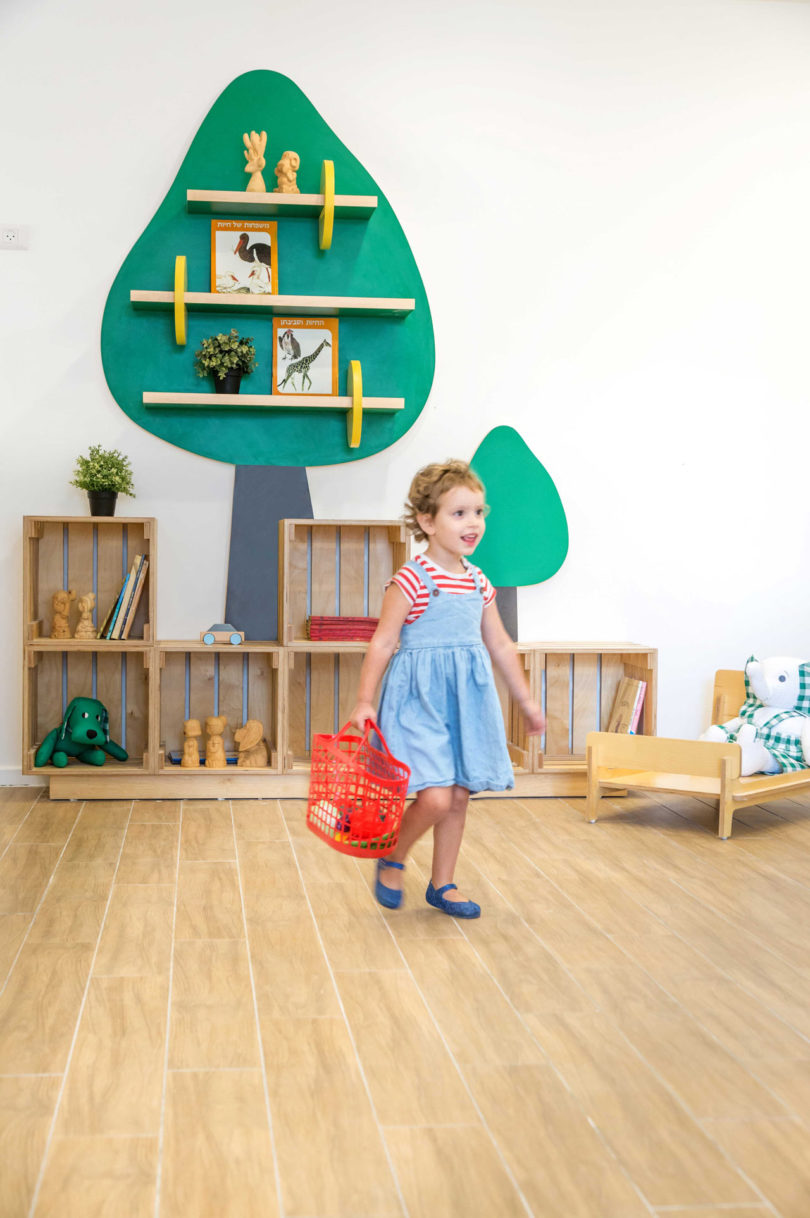 İç mekanında pek çok göz alıcı renk barındıran anaokulu, aynı zamanda çocuklara okulu sevdirecek çeşitli detaylara da sahip. Sarit Shani Hay, 3-6 yaş arası çocuklar için anaokulu, yaş aralığı üç ay ve üç yıl olan bebekler için tasarlanan bir kreş kompleksi. Tasarım kavramı, sitenin geçmişinde bir ürün pazarını barındırmasıyla başlamış ve bu nedenle renkli meyve ve sebzeler iç mekanda oldukça çarpıcı bir biçimde kullanılmış. Sınıflarda yaratıcı oyun ve öğrenim için meyve ve sebzeler, pazar tezgahları ve teslimat kamyonları temaları mevcut. Özel yapım mobilyaların bazıları çocuklar için çekmeceler ve bebekler için uyku alanları veya okumak için yastıklı alanlar içeriyor.